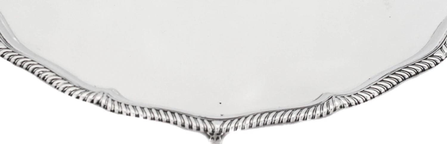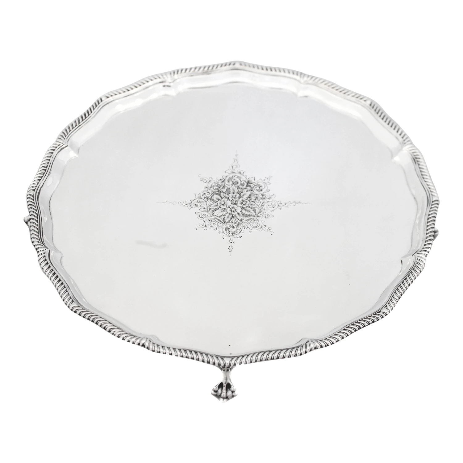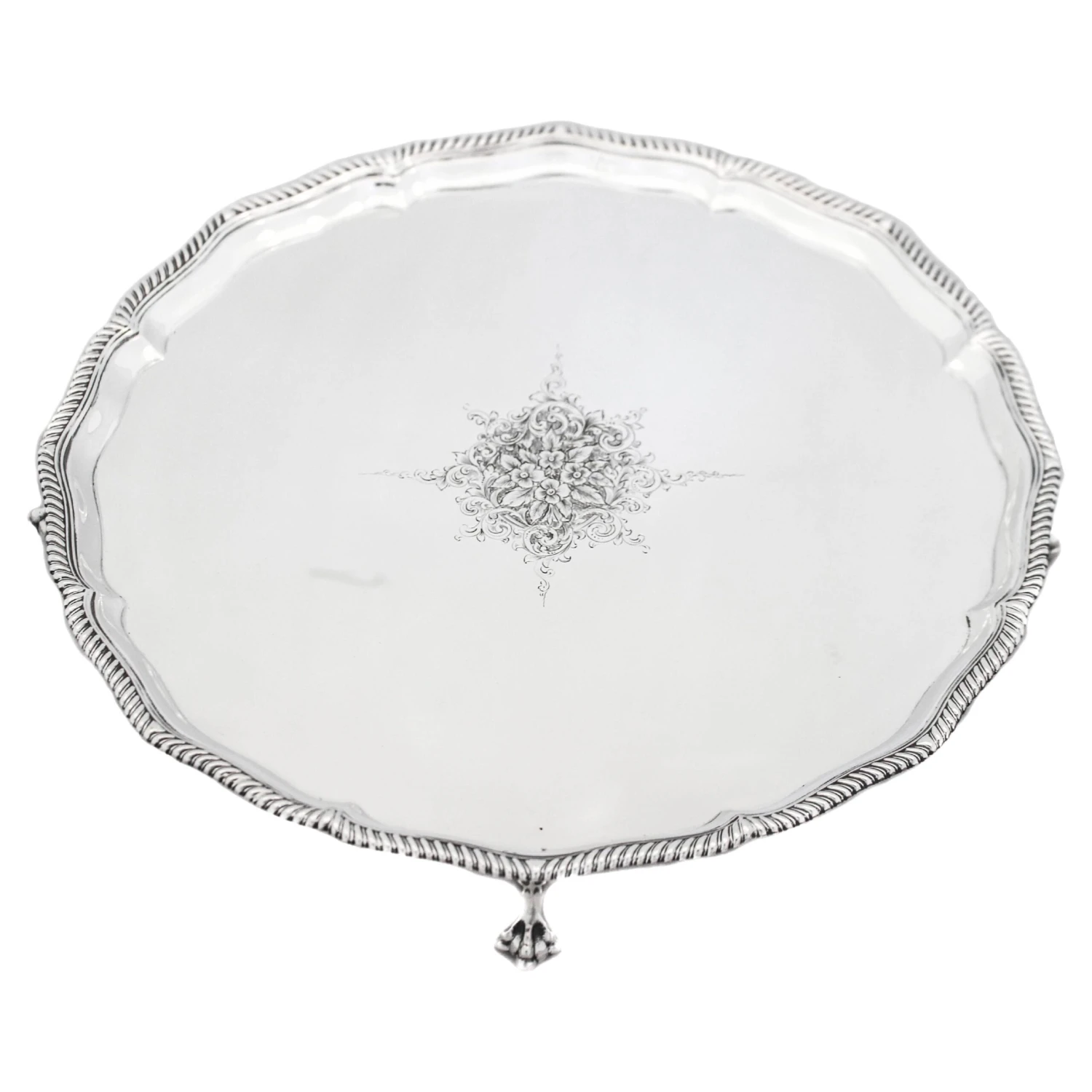 We are proud to offer you this sterling silver salver, hallmarked London 1865. It stands on four lion paws and has a gadroon wrapping around the scalloped rim. In the center there is a beautifully etched cluster of flowers design. This piece can be used for many purposes; decanters, a candelabra, perfume bottles or as a butlers tray.