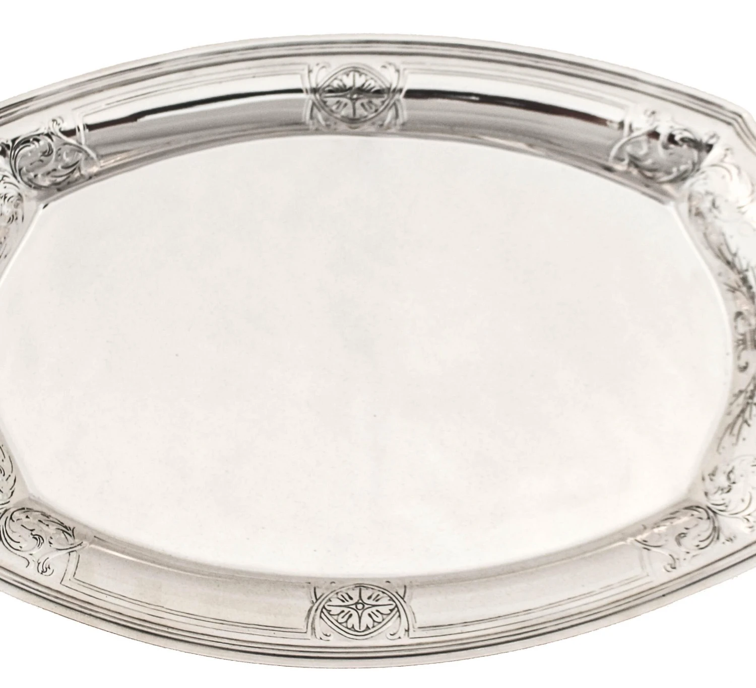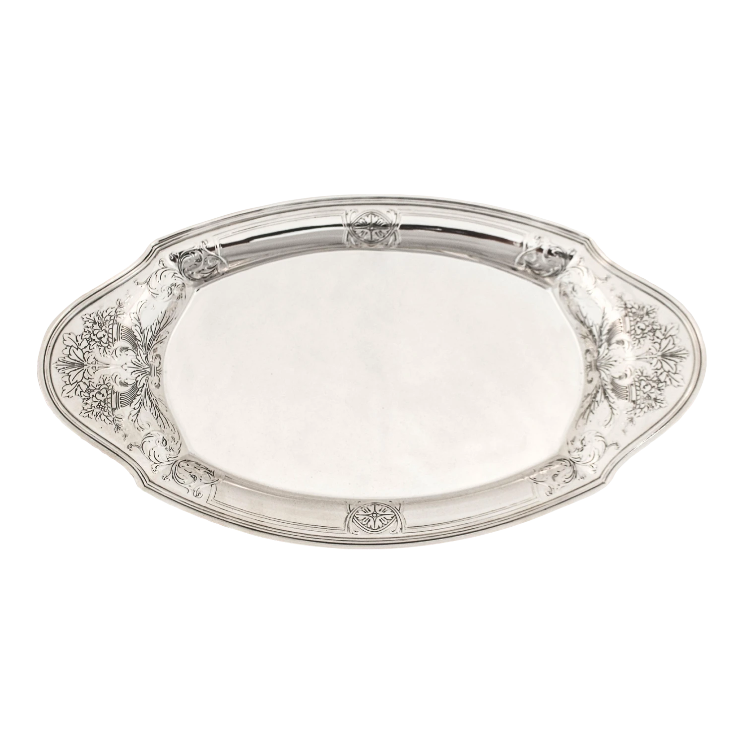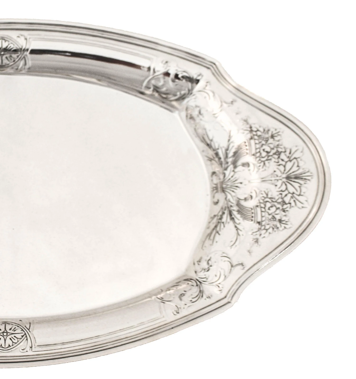 We are thrilled to offer you this sterling silver dish by the world renowned Tiffany & Company. A beautiful example of the artistry of the last century, this oval dish can be used for a multitude of things. From serving hors d’oeuvres and pastries, or as a gallery tray for perfume bottles, or maybe under a pair of candlesticks. On each end the edges slant upwards (like handles)while the center is completely flat. On each end there is a cornucopia motif. A cornucopia (“horn of plenty”) is typically a hollow, horn-shaped wicker basket filled with various fruit and vegetables. It is often associated with Thanksgiving and the harvest.