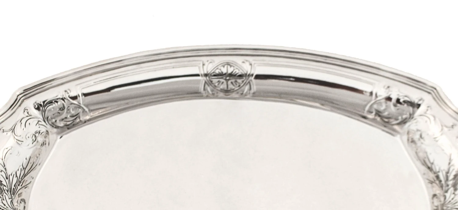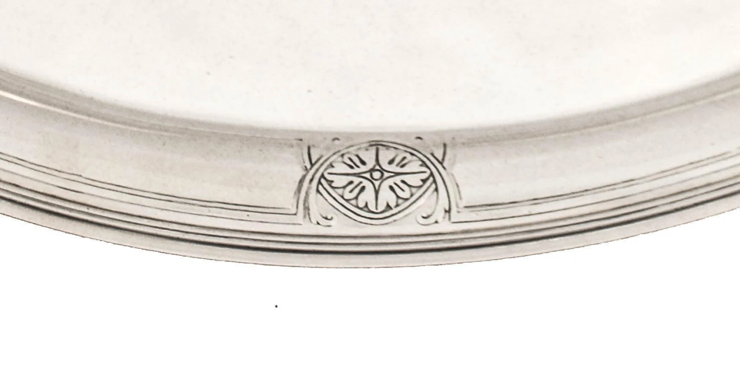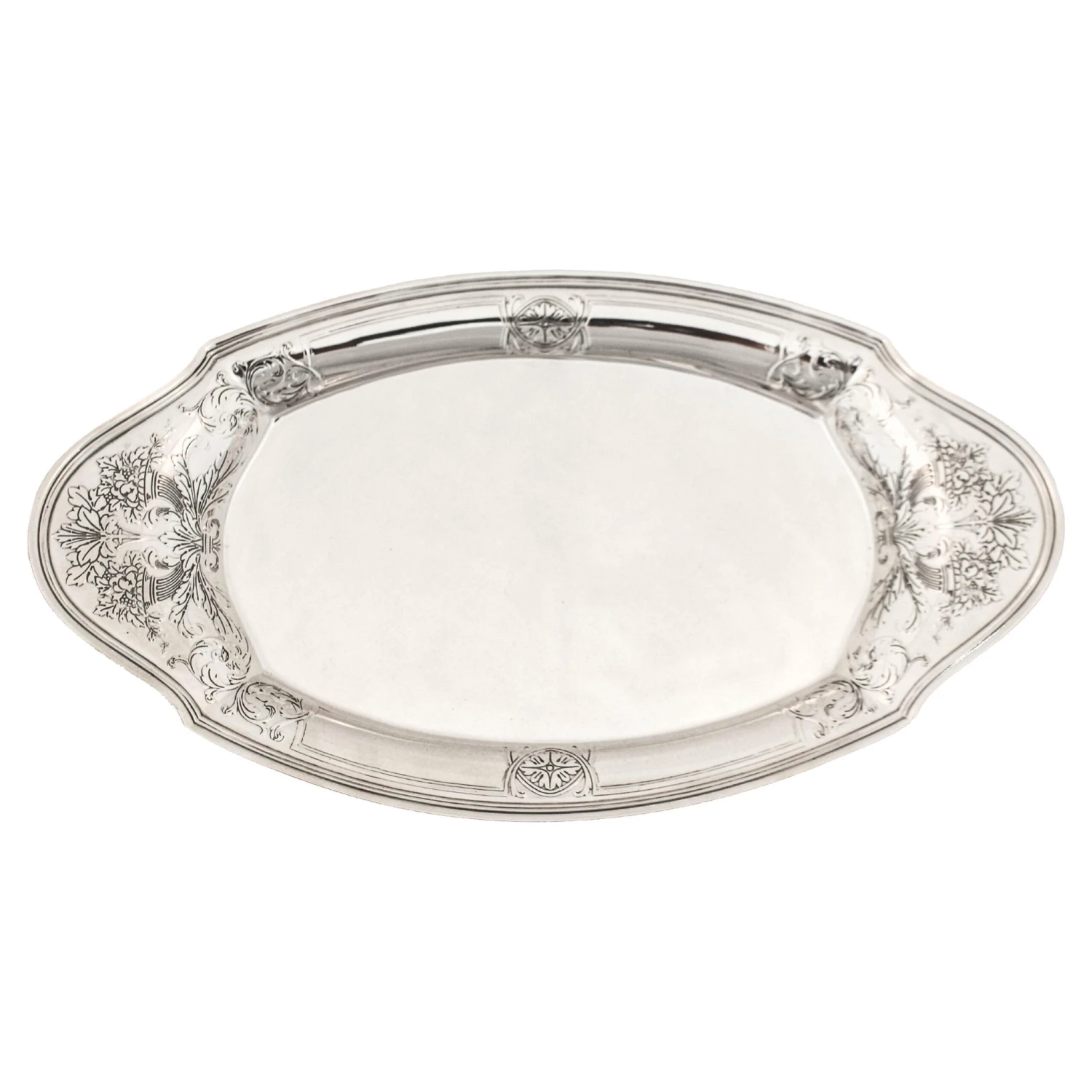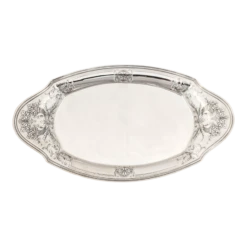 We are thrilled to offer you this sterling silver dish by the world renowned Tiffany & Company. A beautiful example of the artistry of the last century, this oval dish can be used for a multitude of things. From serving hors d’oeuvres and pastries, or as a gallery tray for perfume bottles, or maybe under a pair of candlesticks. On each end the edges slant upwards (like handles)while the center is completely flat. On each end there is a cornucopia motif. A cornucopia (“horn of plenty”) is typically a hollow, horn-shaped wicker basket filled with various fruit and vegetables. It is often associated with Thanksgiving and the harvest.