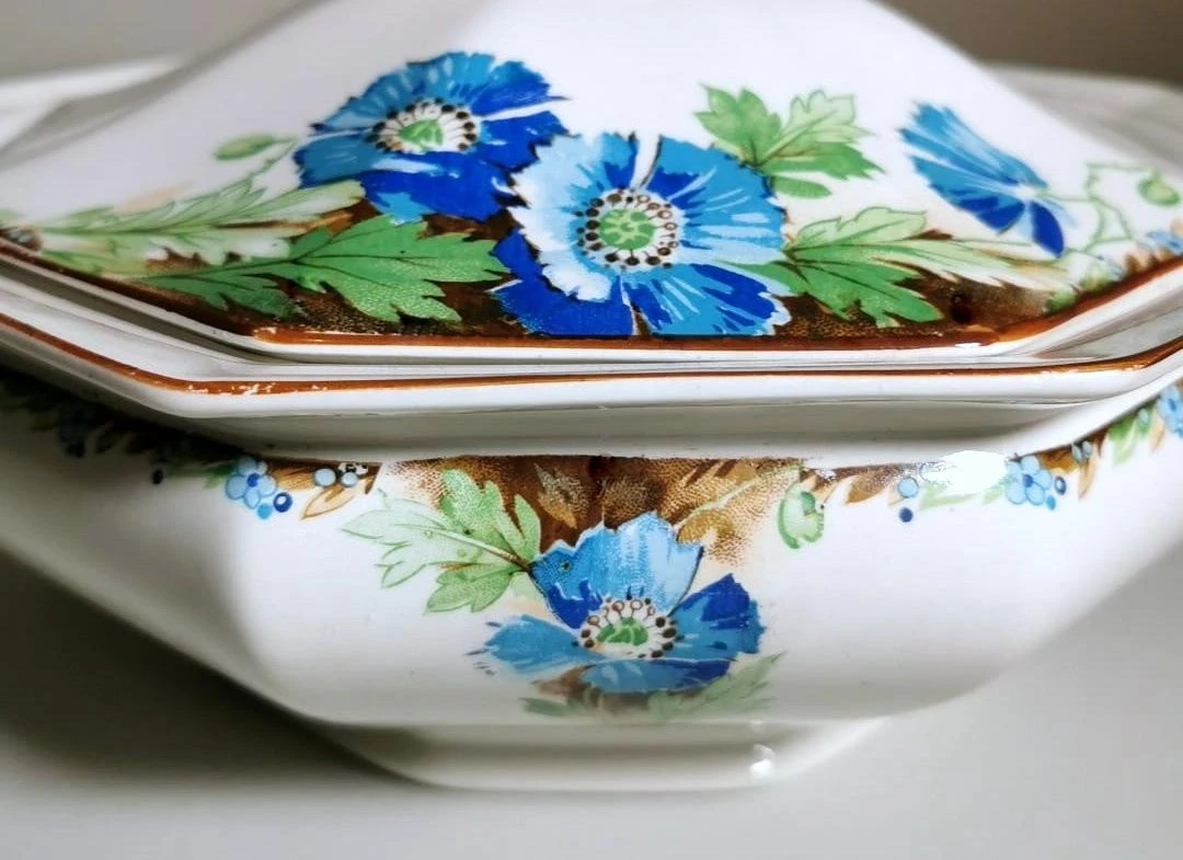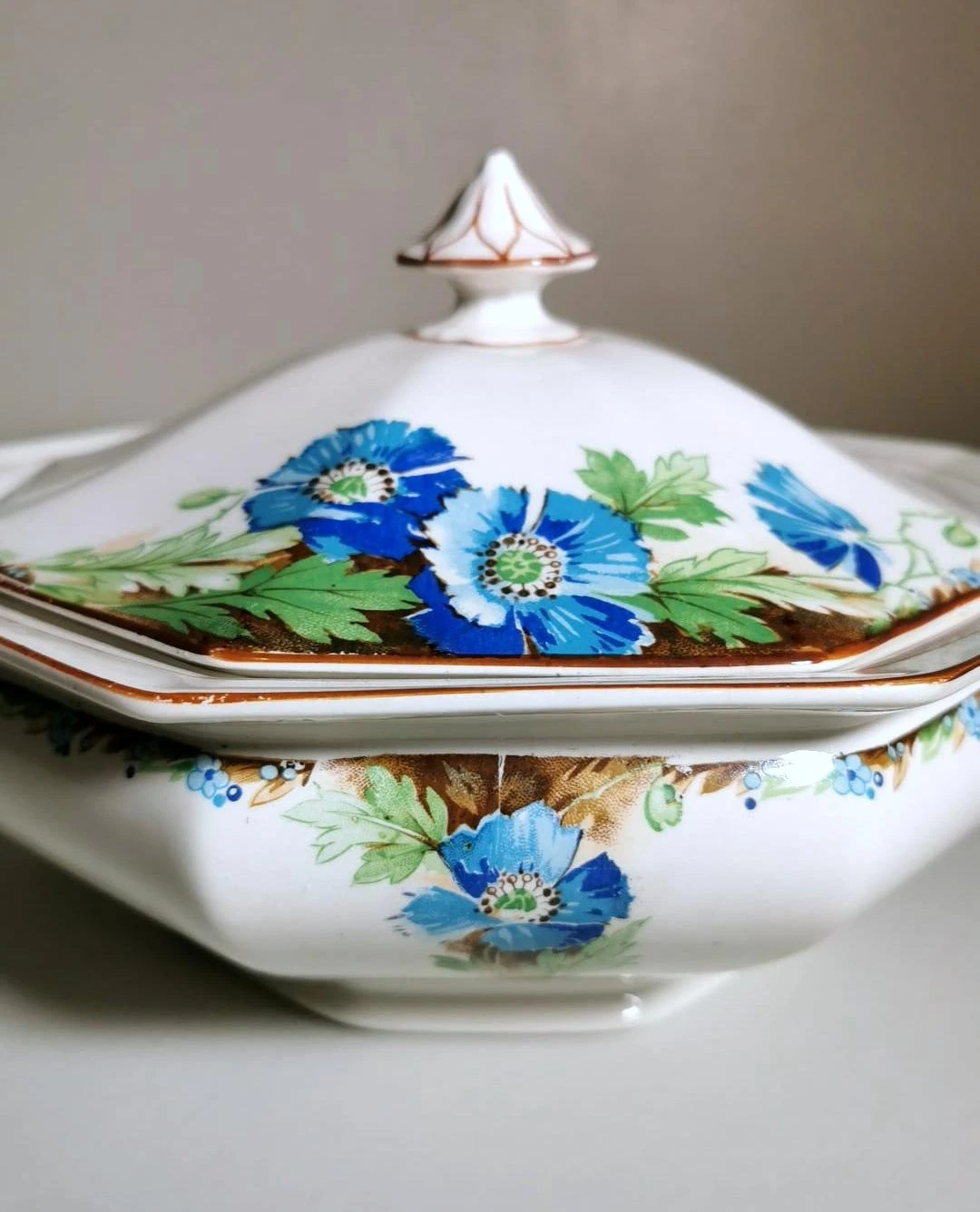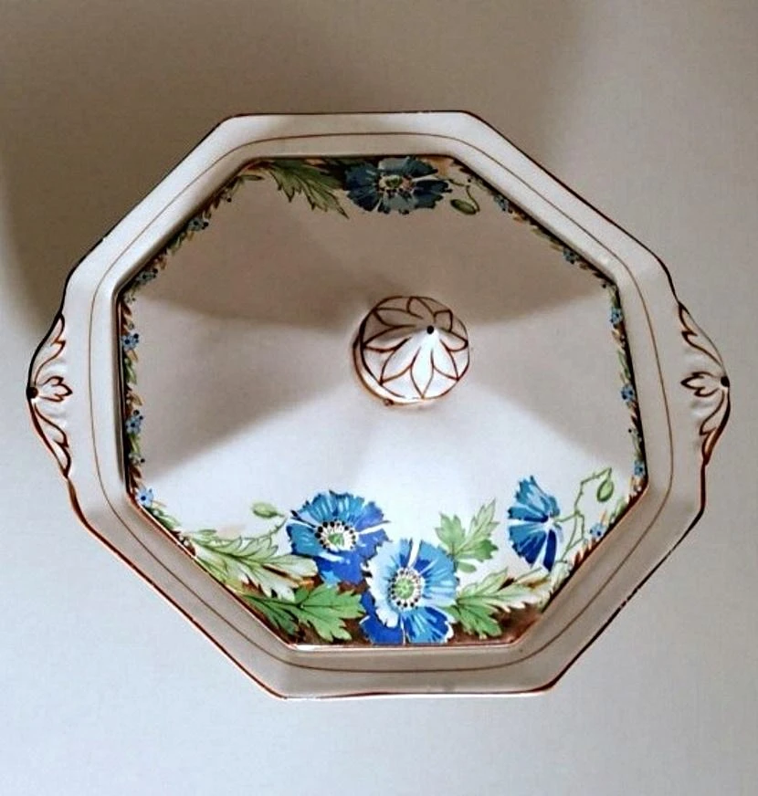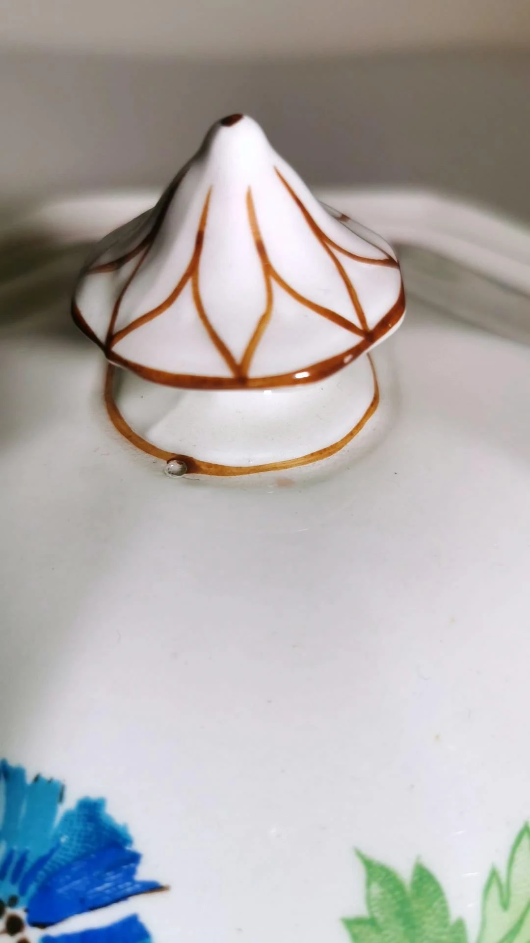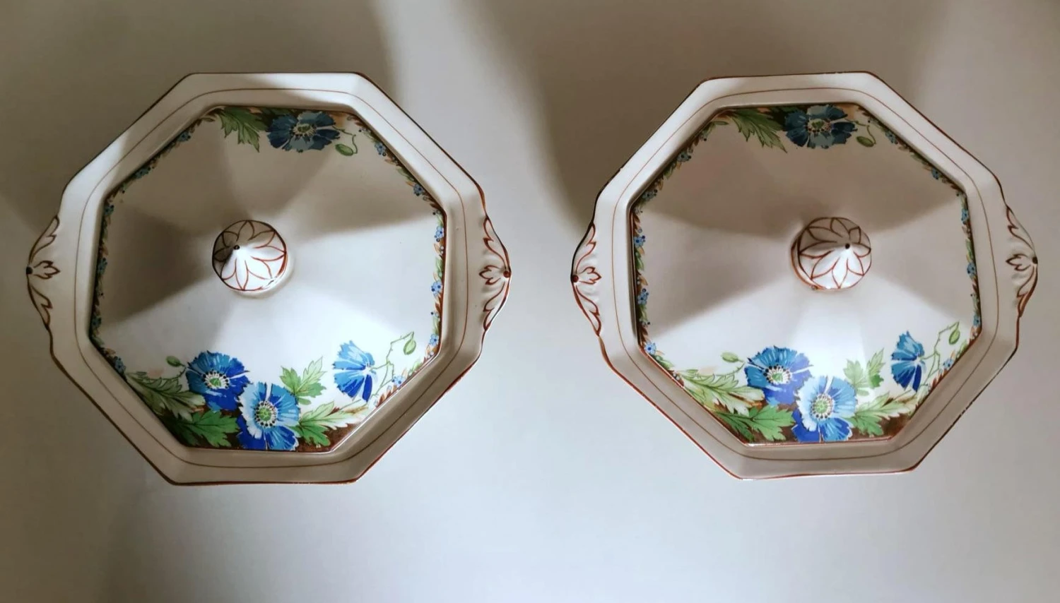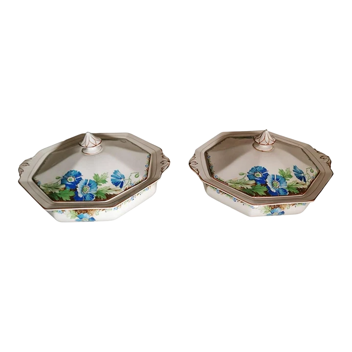 Pretty and refined pair of small serving tureens; they have a well-proportioned, square design typical of Art Deco, graceful and pleasing floral decorations on the lid and body help to lighten the rigidity of the form; the rim and knob are ornamented in pure gold. On the bottom, we find the maker’s mark: the famous Arthur J. Wilkinson Firm located on Newport Lane in Burslem, near Stoke on Trent, Staffordshire County, an ancient locality famous for the production of pottery and porcelain. From the mark, we can accurately identify the year of production of the two soup tureens: 1947. In 1881 the old Central factories in Burslem passed into the hands of Wilkinson & Hulme; in 1885 Hulme retired from the business and Arthur J. Wilkinson continued alone, AJ Wilkinson was the brother-in-law of Arthur Shorter, a partner in the pottery firm Shorter & Boulton. In 1891 AJ Wilkinson died in an accident and Arthur Shorter was asked to run AJ Wilkinson pottery in Burslem, the name AJ Wilkinson was retained. Around 1896 the company took over the Royal Staffordshire Pottery, Burslem, and soon left the old Central plants. A few years later Shorter bought the company and at that time, and in 1898, Arthur’s son Colley joined him. His younger son Guy, who became manager of Shorter’s in 1900, joined his father and Colley from Wilkinson’s in 1905. Colley and Guy Shorter were appointed managers of Wilkinsons in 1916. Also in 1916, at the age of 17, Clarice Cliff (who became the famous designer of “Bizarre Ware”) began working at Wilkinson’s – previously working for Hollinshead & Kirkham. In 1928 hand-painted Bizarre Ware was launched. With the outbreak of World War II in 1939, creative production at the factory ceased, with much of the workforce conscripted into the armed forces. Wartime restrictions on decorating ceramics would continue, and production declined sharply, but Wilkinson’s equally maintained a high quality of products. In 1964 Colley Shorter died. Clarice Cliff-Shorter sold the family shares to the nearby Midwinter Co. and thus Wilkinson’s ceased to exist. In 2021 the magnificent story of Wilkinson and revolutionary ceramic artist Clarice Cliff, an early exponent of Art Deco, is told in the film “The Color Room” directed by Claire McCarthy. Measures width cm.27, depth cm.23, height cm.15. Tureens are in good condition. For all our shipments we use special packaging materials (wooden crates, styrofoam, etc.) for maximum protection and safety of the objects.