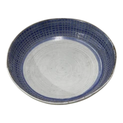 The circumference streaked with blue lines are characteristic of mid century decorations This large thiry dish is a technique of intaglio engraving and decor.