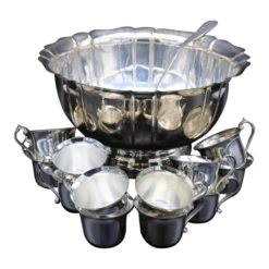 American Silverplate Punchbowl with 12 cups and serving spoon, Marked Pilgram. Cups measure 4.5” H.