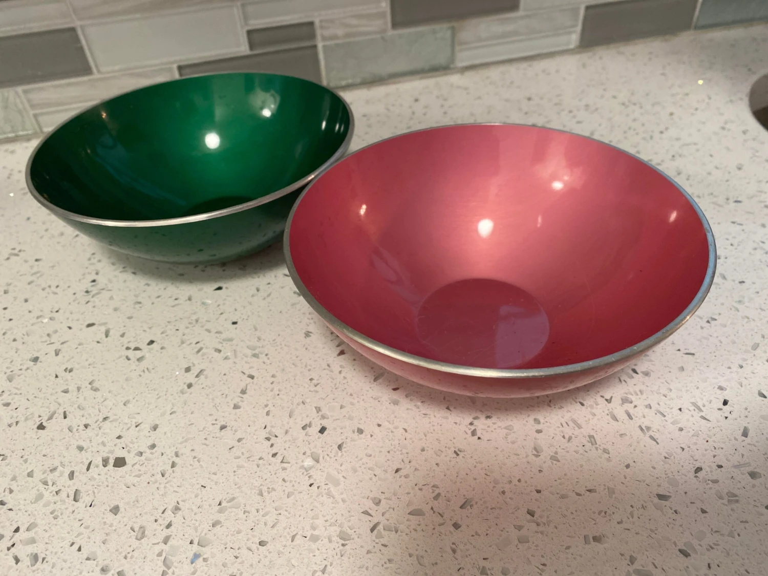 2 medium size bowls (pink and green) 6″ diameter by 2″ height