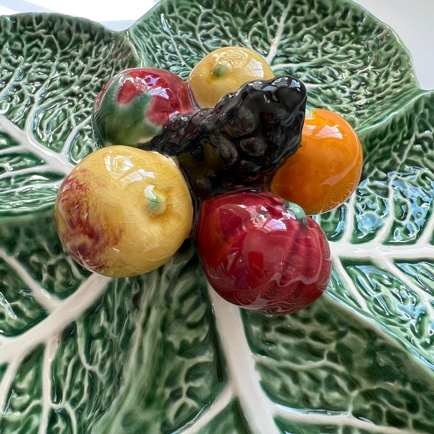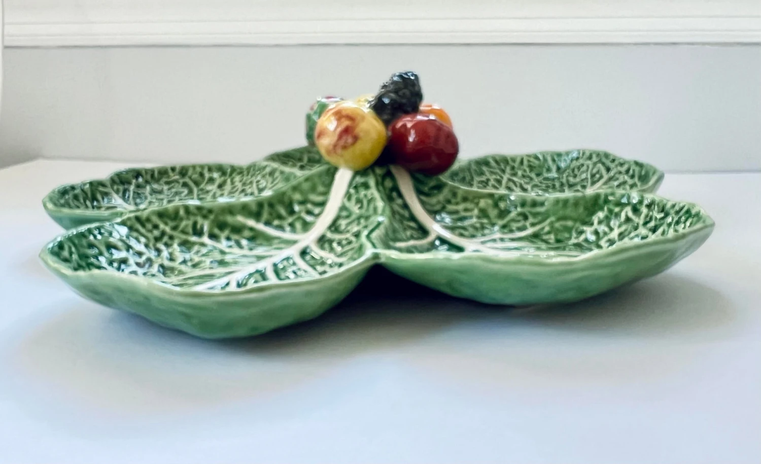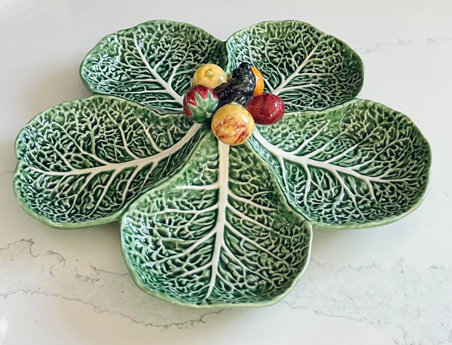 A rare vintage ca 1960s collectible Bordallo Pinheiro ‘Sample’ Aperitif / servant / fruit platter/tray with five compartments, in a cabbotine earthenware cabbage leaves, connected by sculpture depicting a strawberry, an apple, a tomato, grapes and a mandarin in the center.