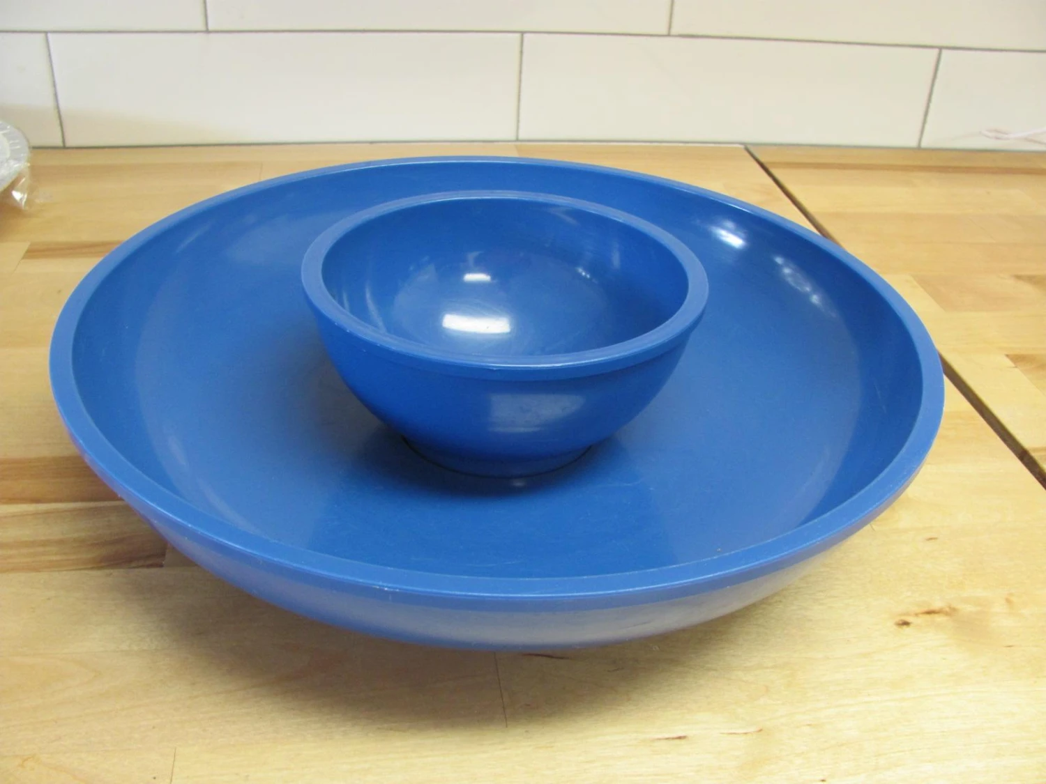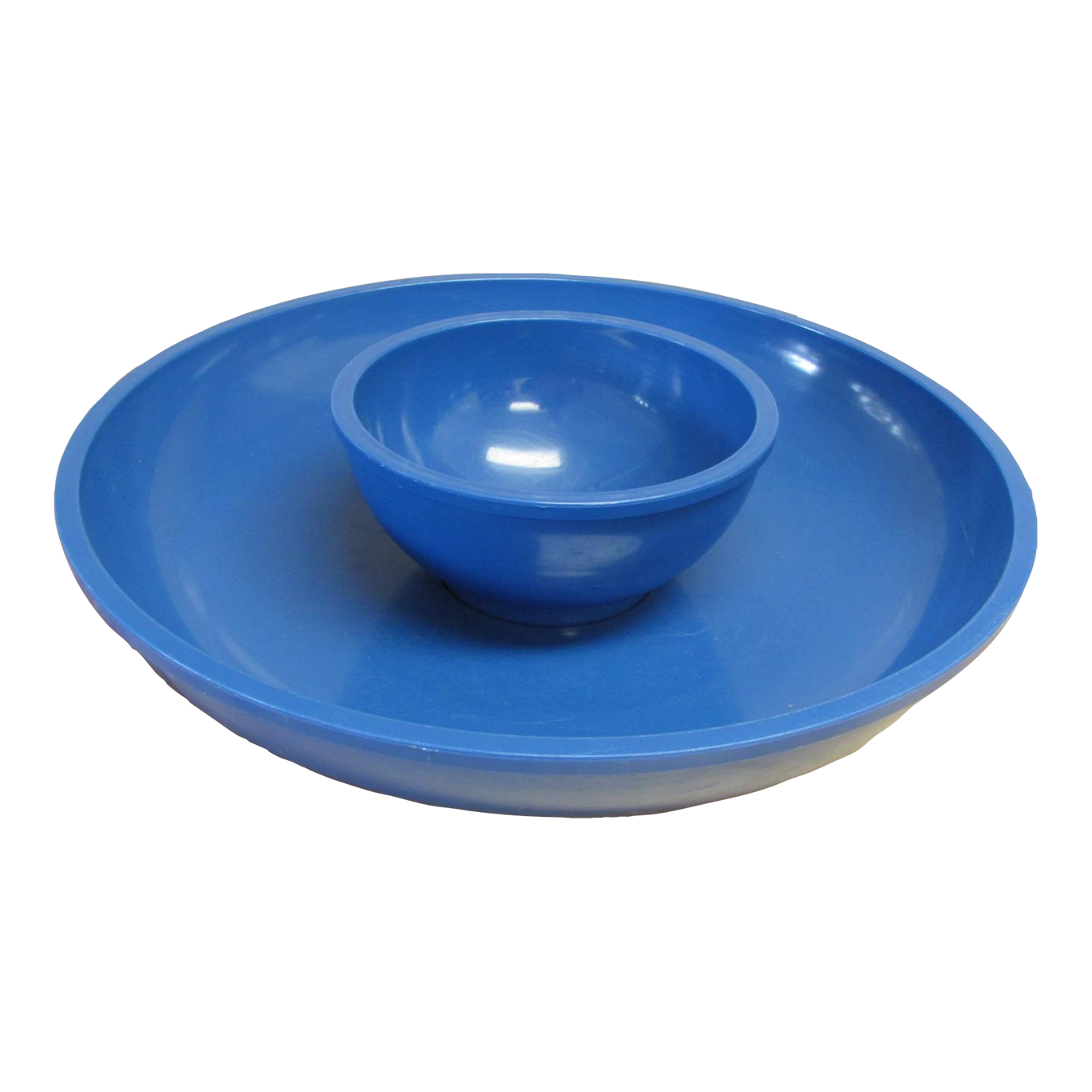 Really nice veggie and dip, 2 piece plastic bowl set for Dansk by Gunnar Cyren. Both pieces are identified on the bottoms. Smaller, footed dip bowl sits in a well inside the large serving bowl. Blue colored plastic. Excellent condition. The bowls measure: dip 5.75″ diameter x 2.75″ h, serving bowl 12.37″ diameter and 2.75″ h.
