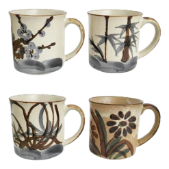 The cups depict themes of nature and have a matte glaze over flora loosely hand painted in earthy tones of brown, gray, and dark green, and they measure 3″ in diameter, 4 1/2″ wide with the handle, and 3 1/2″ in height.