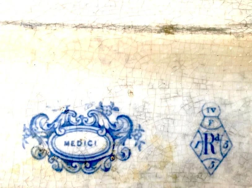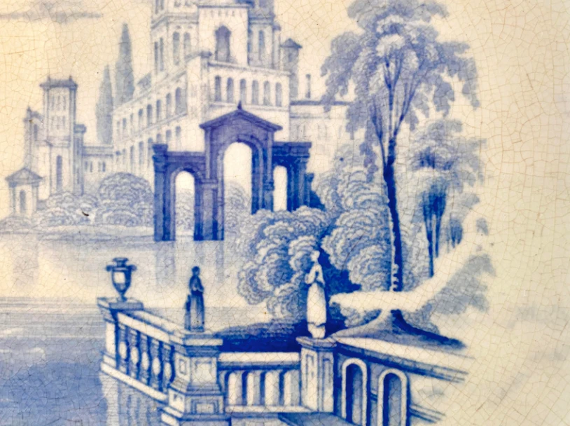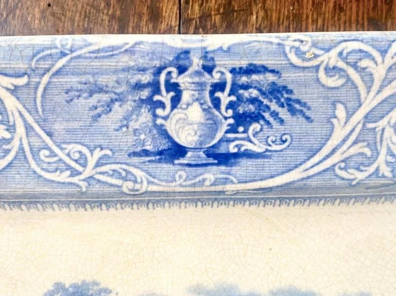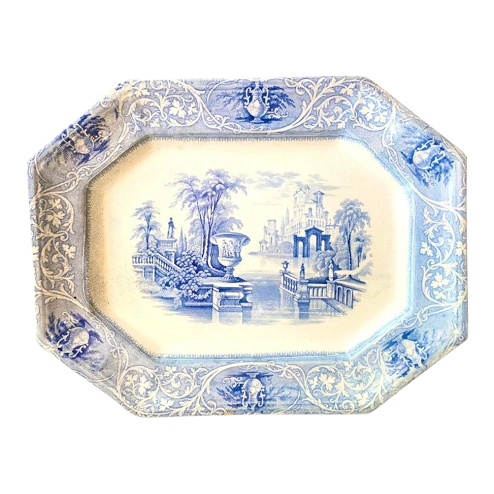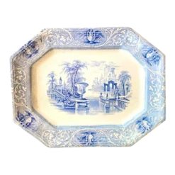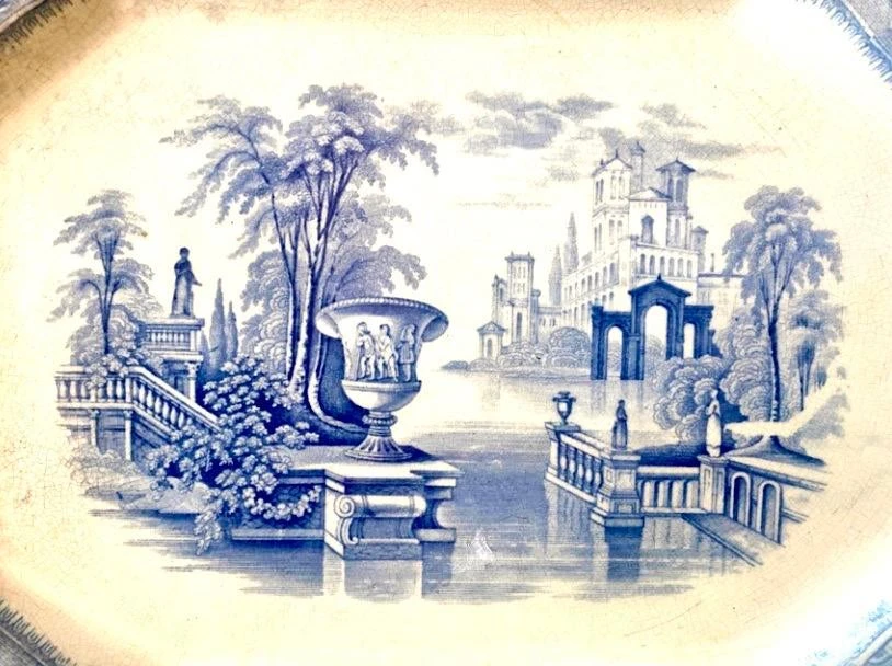 Mid 19th century transfer ware platter by Mellors, Venables & Company., a pottery in the Staffordshire district of England. The pattern is “Medici” and features a lovely garden scene.