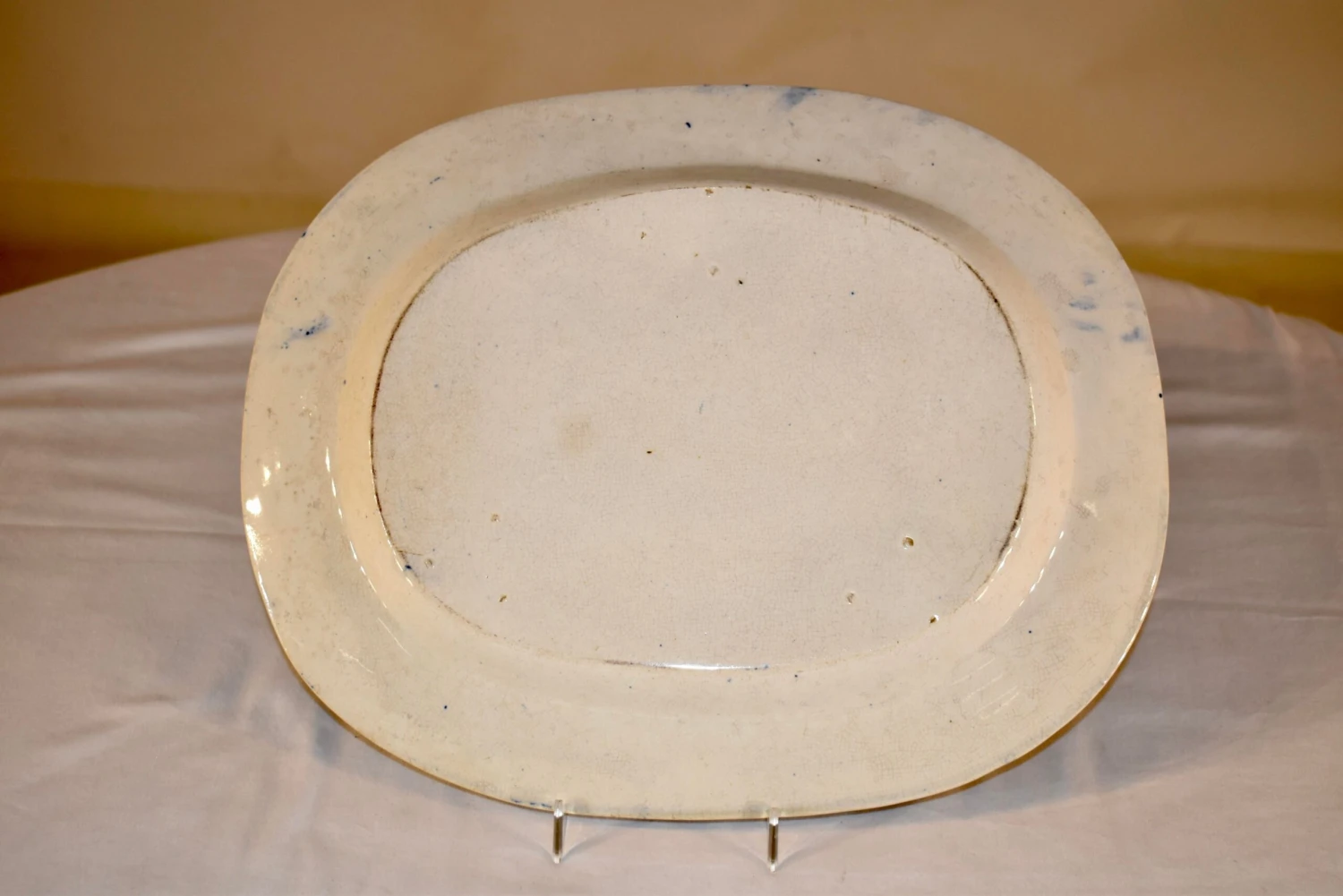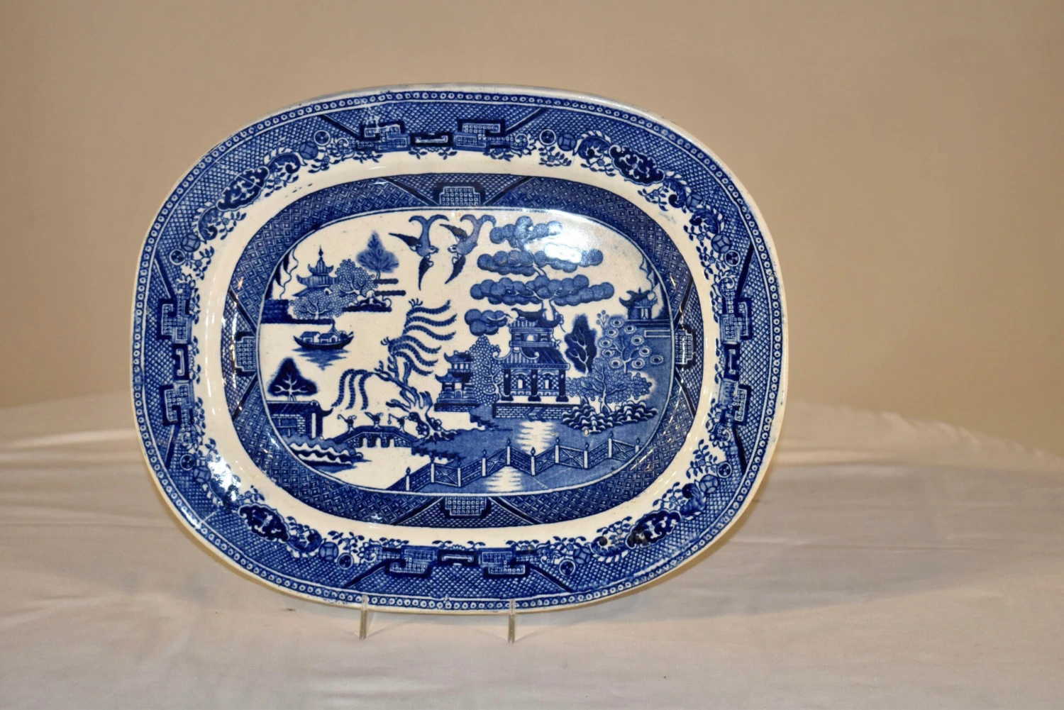 19th century English transfer ware platter in the highly collectible “Blue Willow” pattern. This platter is from the Staffordshire region …