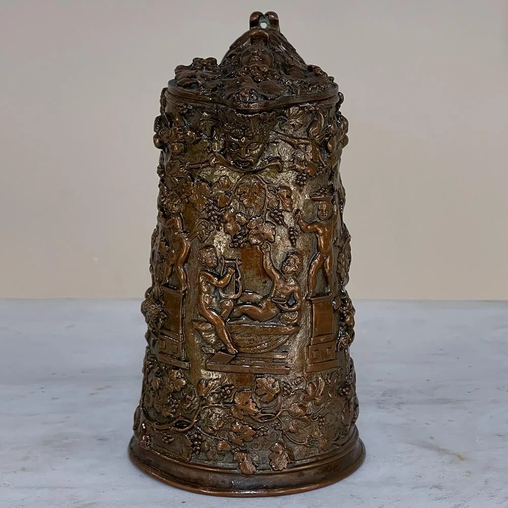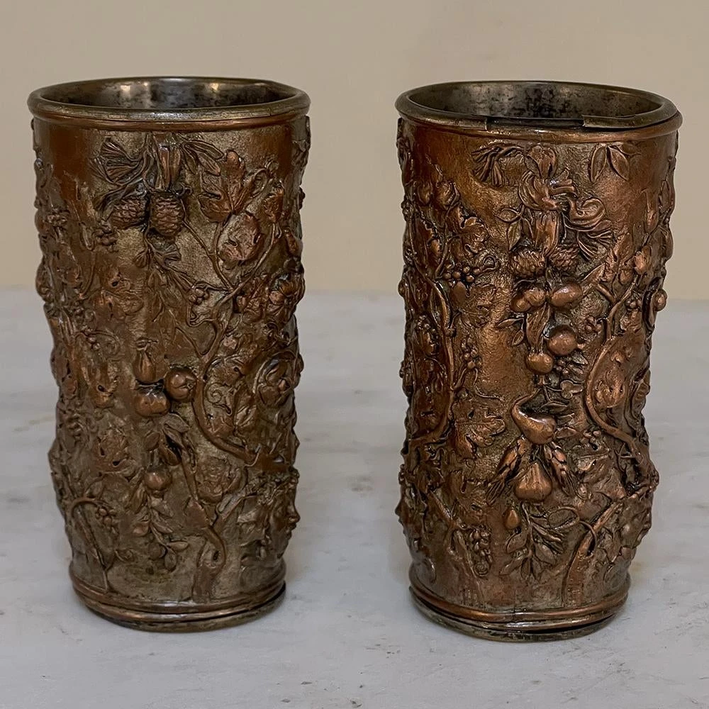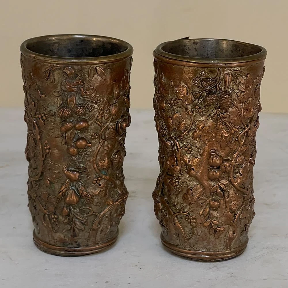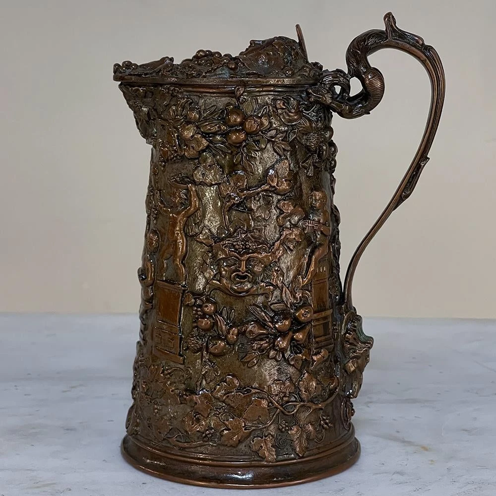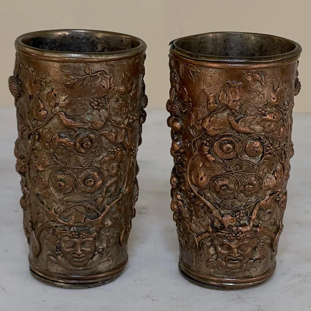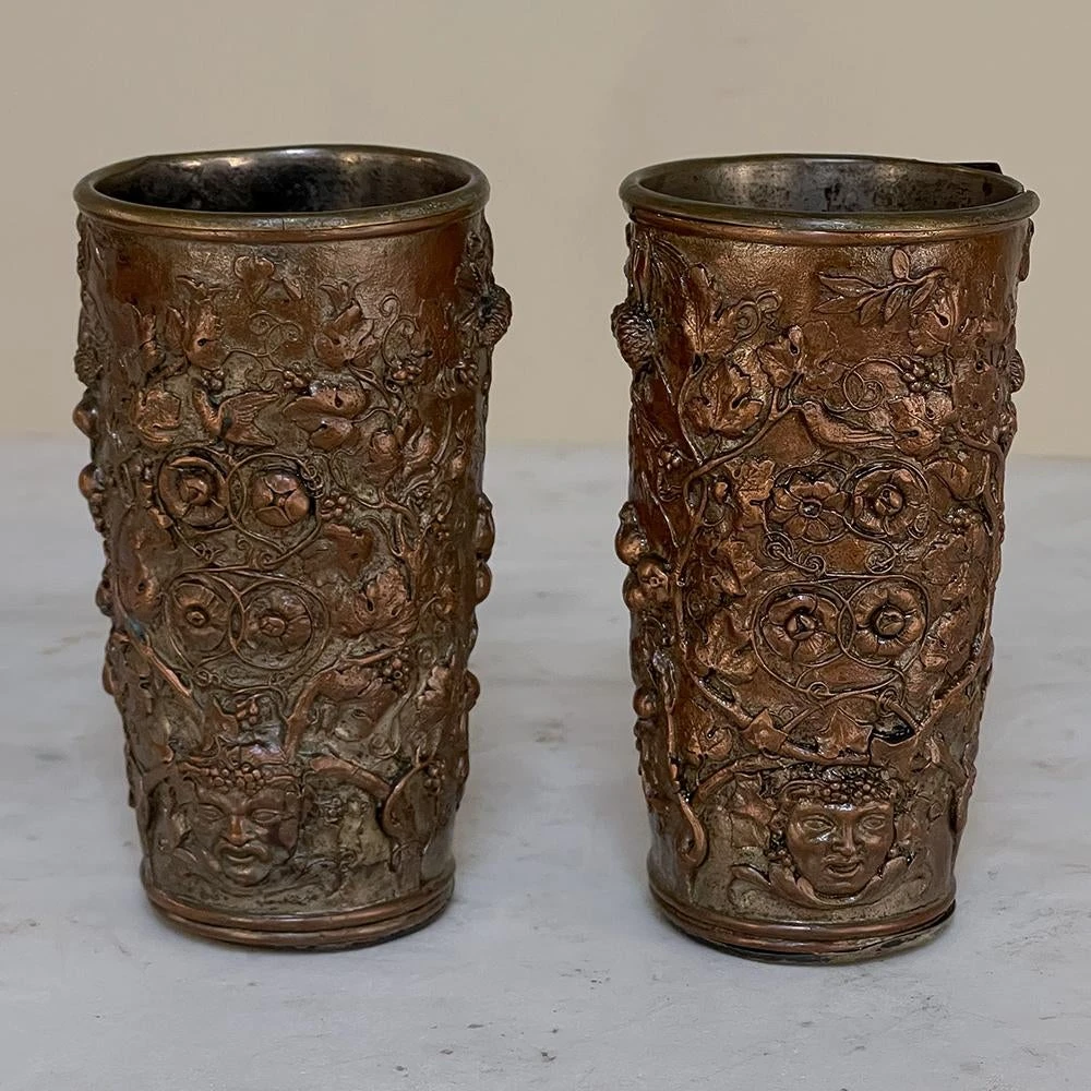 19th Century French Renaissance Revival Ceremonial Wine Goblets, Pitcher & Platter are a stunning collector’s set, rendered in astonishing detail in a high-copper content brass that will add a particular significance to any celebration! Designed for toasting at weddings, anniversaries or important business deals, to name a few, such sets were reserved only for special occasions. The detail in relief around the entire extremities of the pitcher, goblets, and even the surface of the platter must be closely examined to be fully appreciated. Bacchus, the God of Mirth and Wine figures prominently in the designs, with playful cherubs, abundant fruit and of course fully laden grapevines covering every square inch of visible surface. The goblets are lavishly detailed as well, and even the platter evokes wonder with intricate embossed patterns, five heads of Bacchus, and an elaborate bordering, with circular rings designed for the pitcher and each goblet that have been decorated with astounding detail so that even the platter is amazingly attractive when there’s no pitcher or goblets on it.