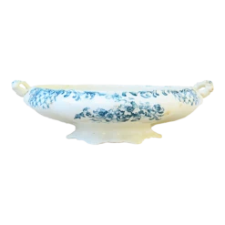 Lovely blue & white ironstone serving bowl; generously proportioned with scalloped rim and footer, crown shaped dual handles, flourish, lattice, floral accents. No maker’s marks but confident that this piece is either French or English and dates to the late 19th century.