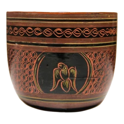 A rare 20th-century Burmese lacquerware table top cup in traditional Burmese style with a parrot motif with classic red interior. All sides are hand-painted. Rarely in this condition.