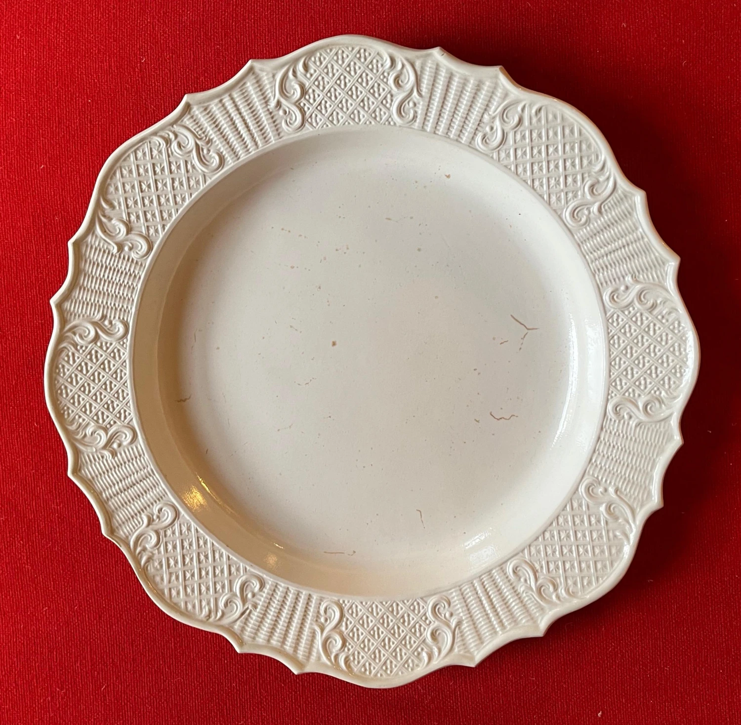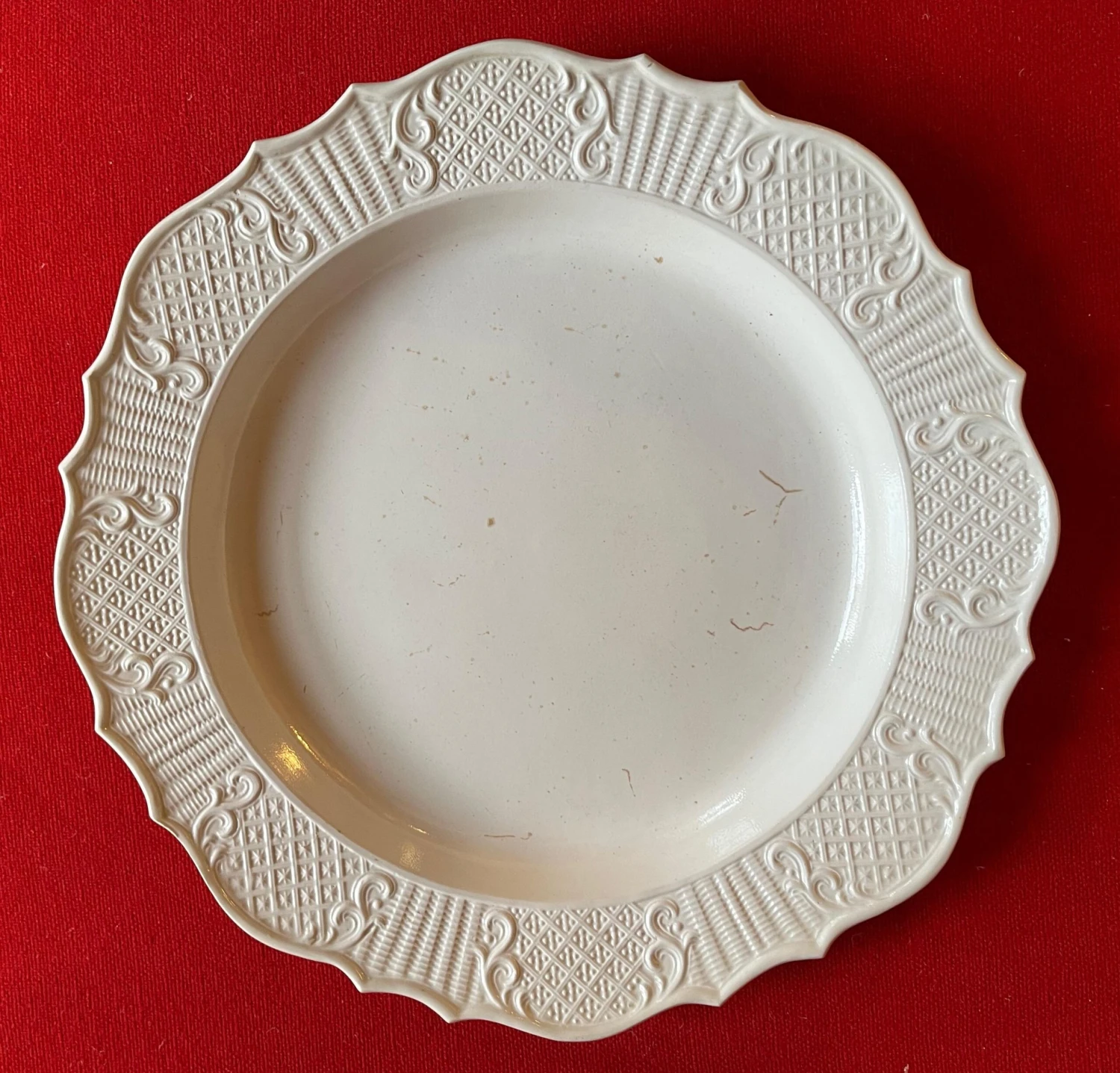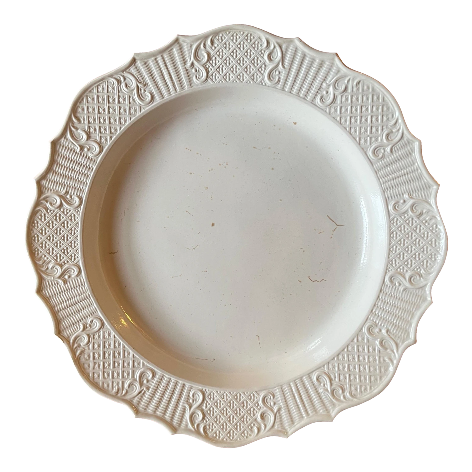 A fine 18th c. saltglaze charger with molded bas relief decoration around the shaped border. Charger is in the form of a silver meat platter of the period. Good condition – a few small crease lines in the making. Measures 13 1/8″ diameter.