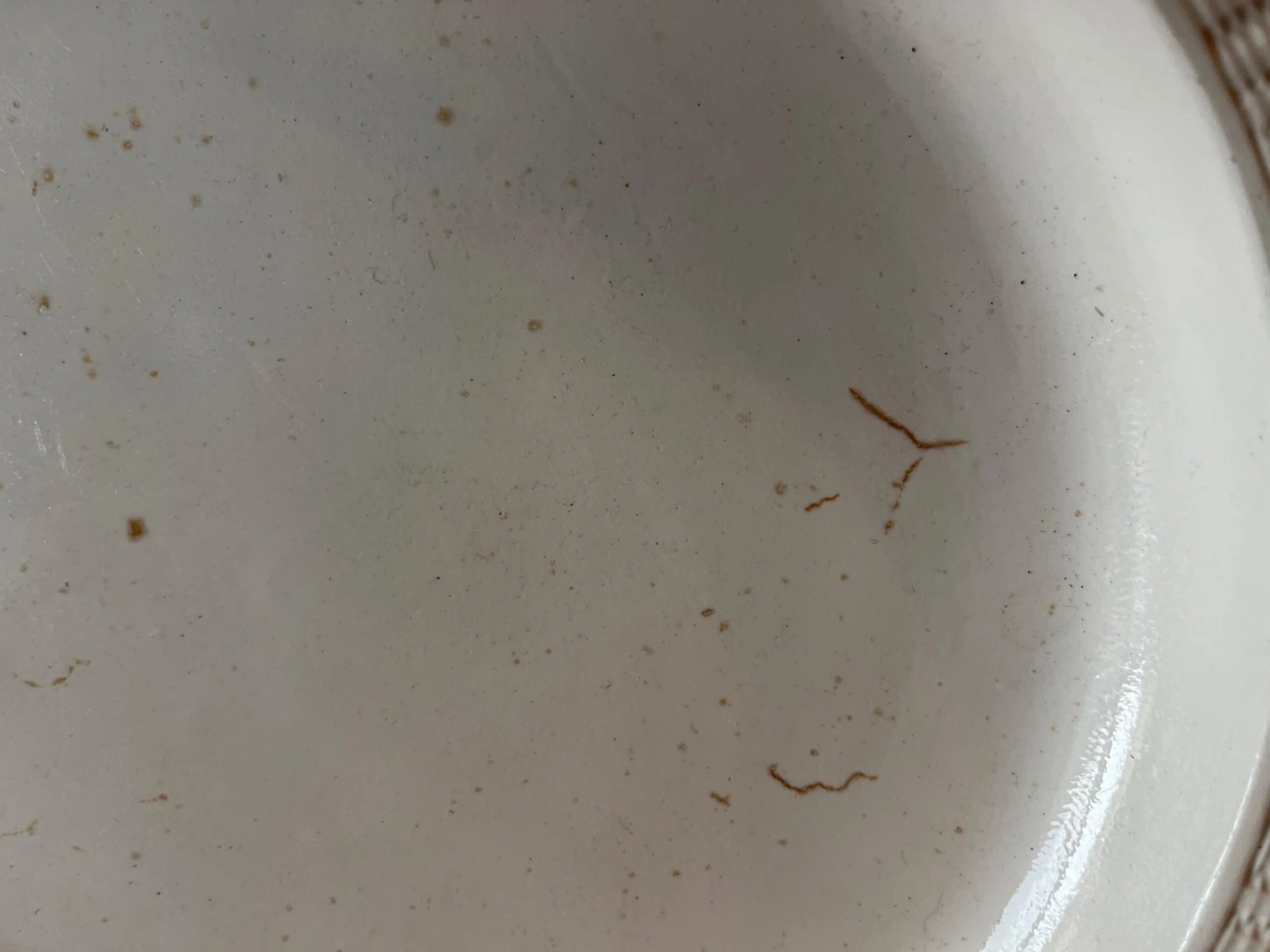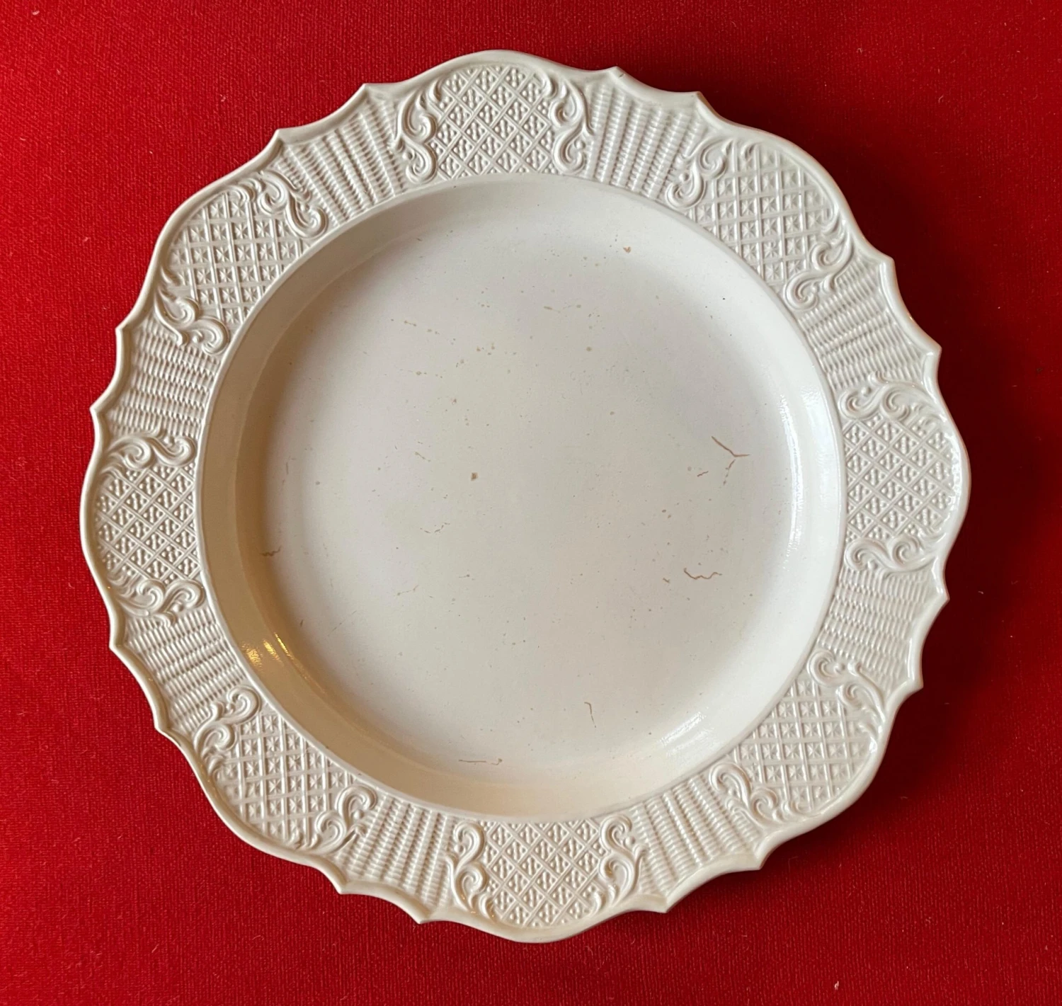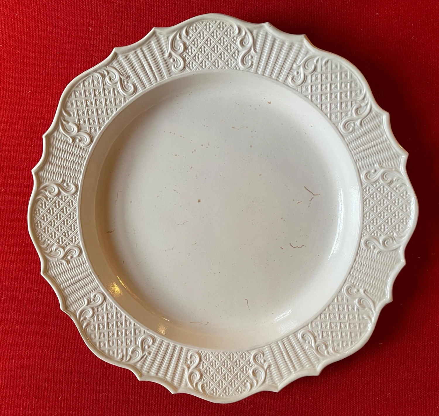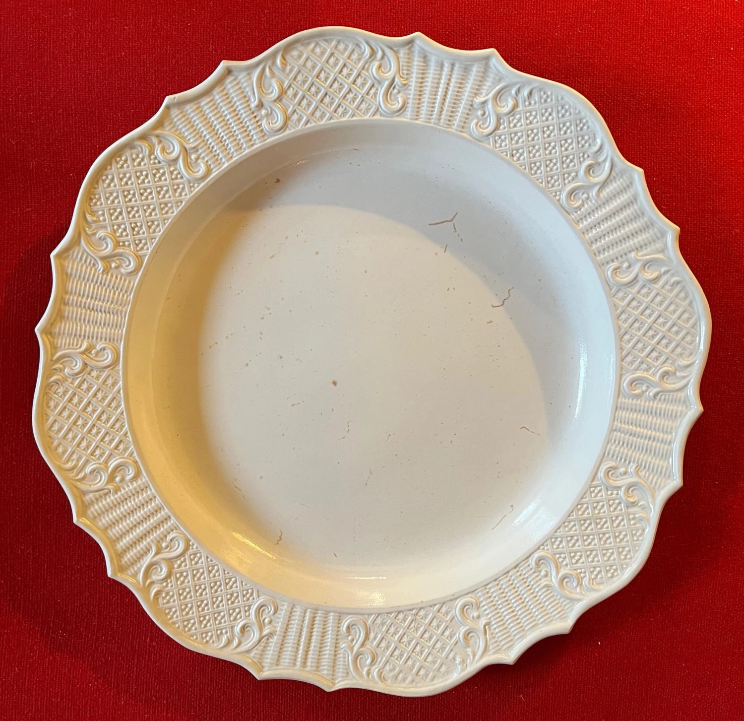 A fine 18th c. saltglaze charger with molded bas relief decoration around the shaped border. Charger is in the form of a silver meat platter of the period. Good condition – a few small crease lines in the making. Measures 13 1/8″ diameter.
