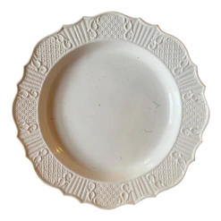 A fine 18th c. saltglaze charger with molded bas relief decoration around the shaped border. Charger is in the form …