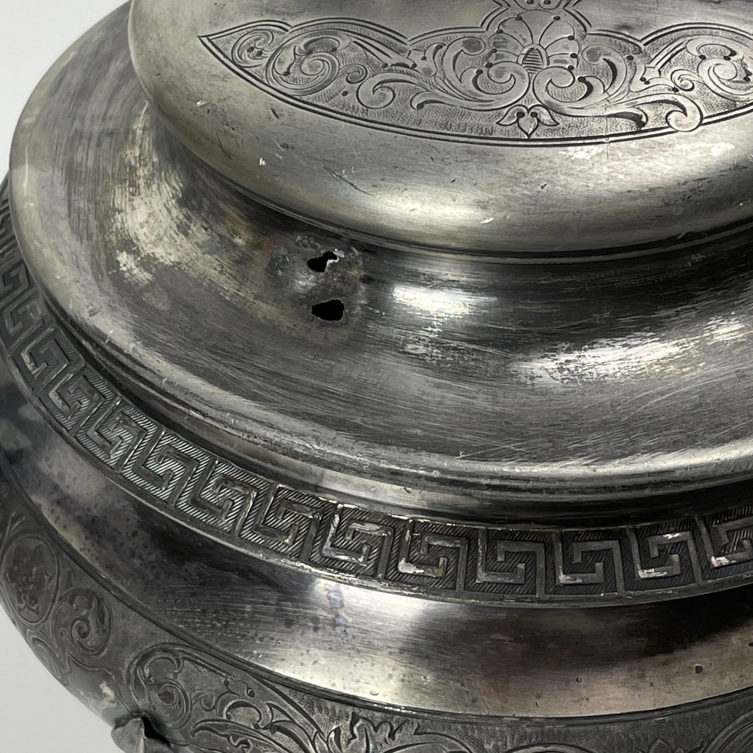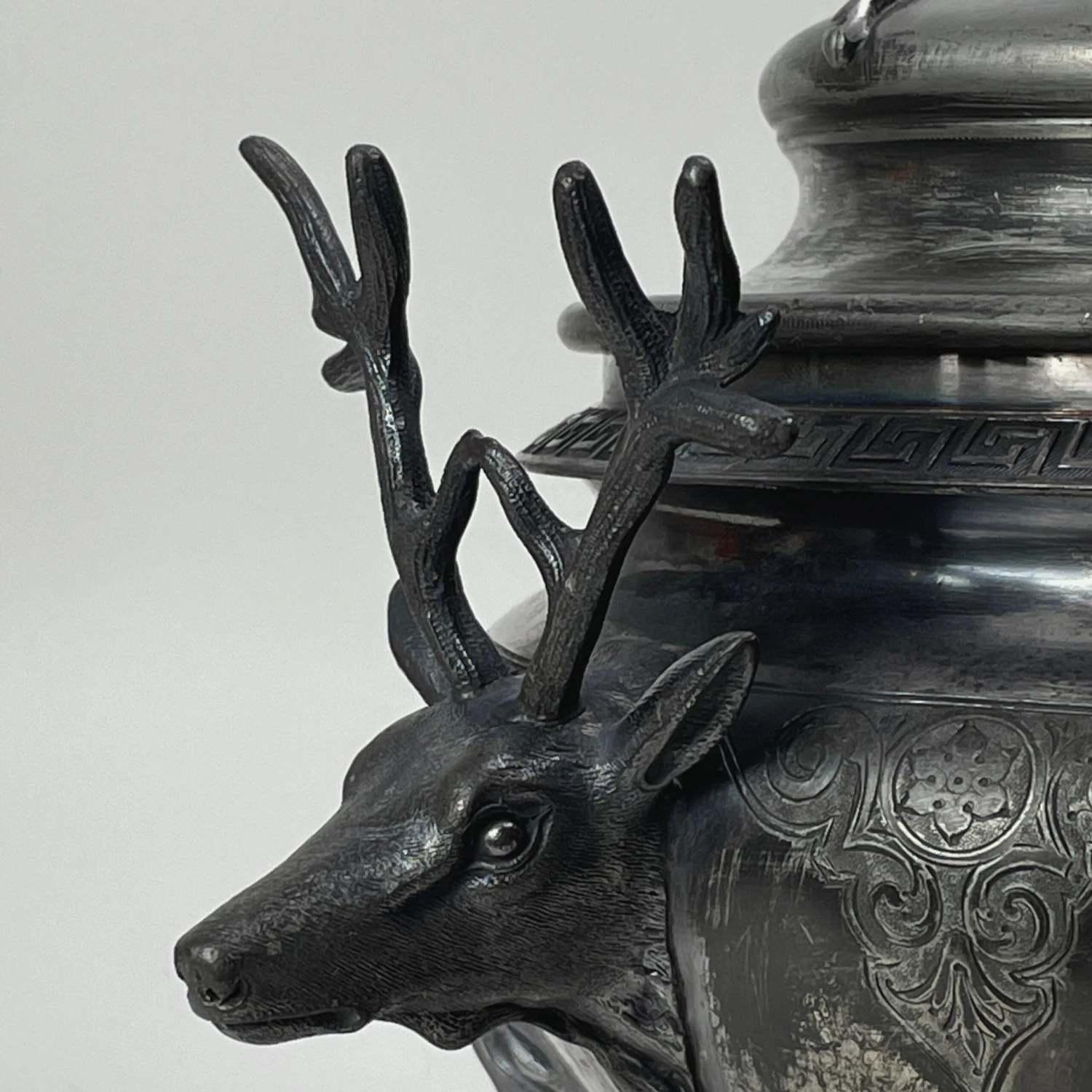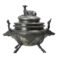 19th Century Wilcox Silver Plate Co. Metal Lidded Soup Tureen with Deer and Fawn. Double headed deer soup tureen with fawn as handle on the lid. Greek key pattern along the rim of the tureen. Flourishes along the body and on top of the lid. Stamped Wilcox Silverplates on the bottom with “1868” underneath (which I believe would have been the item number). Initialed on the edge of the lid. A small hole on the lid itself (see pictures for details). In used condition with silverplating missing along the bottom of the vessel and on the body of the deer.