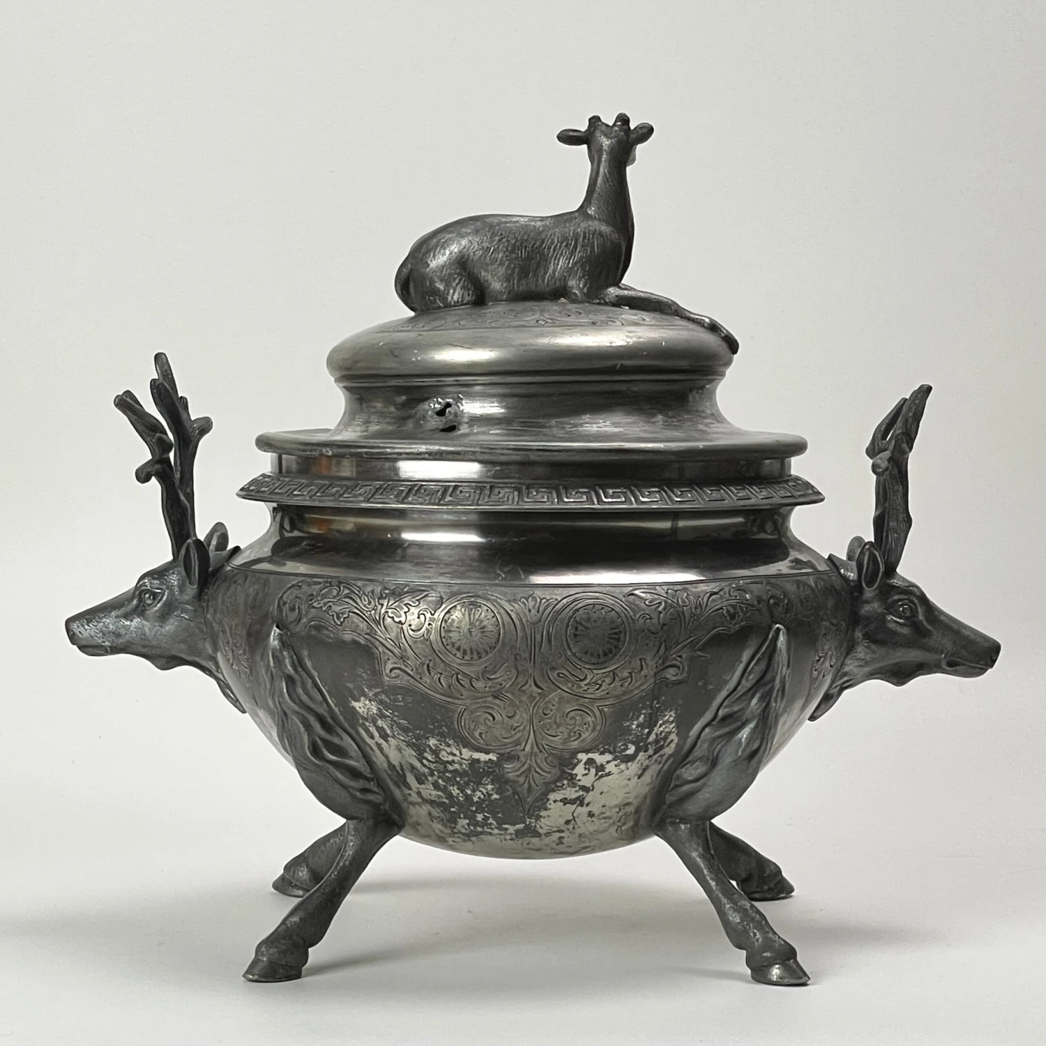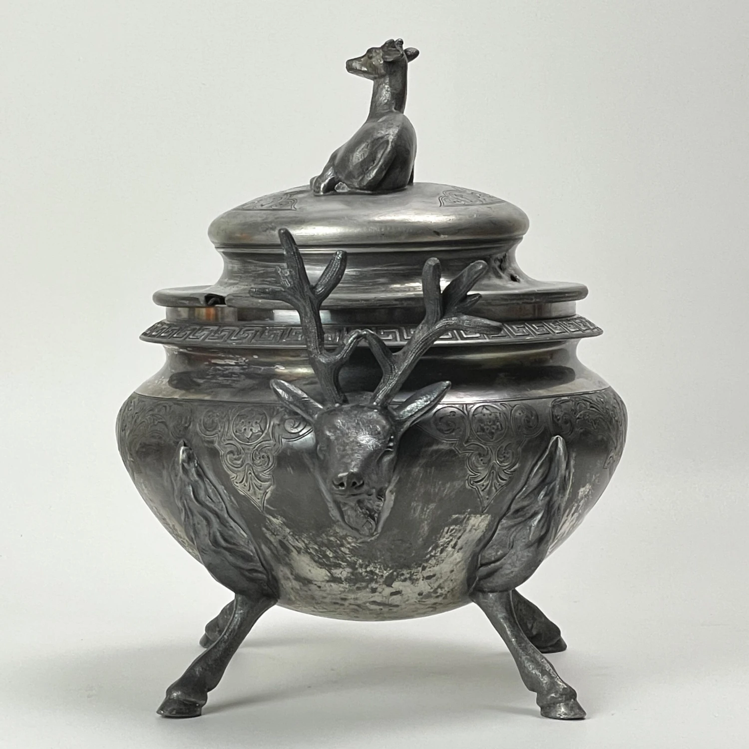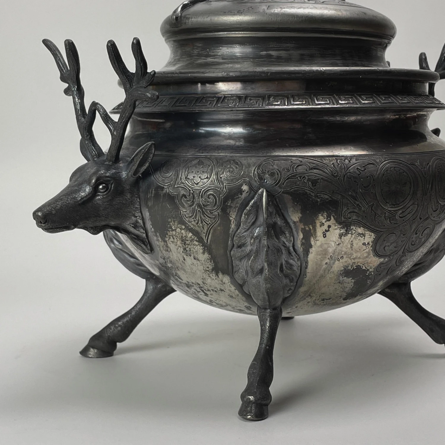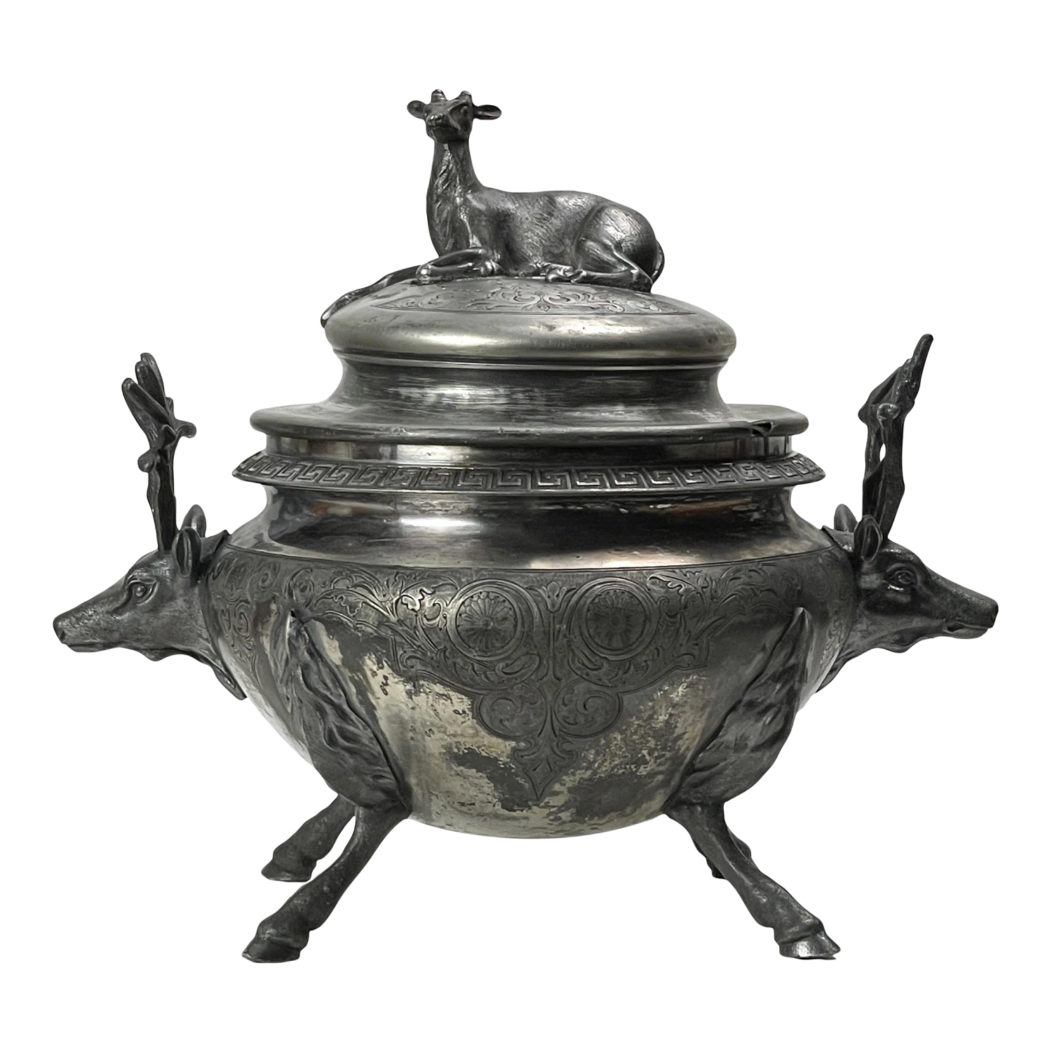 19th Century Wilcox Silver Plate Co. Metal Lidded Soup Tureen with Deer and Fawn. Double headed deer soup tureen with …