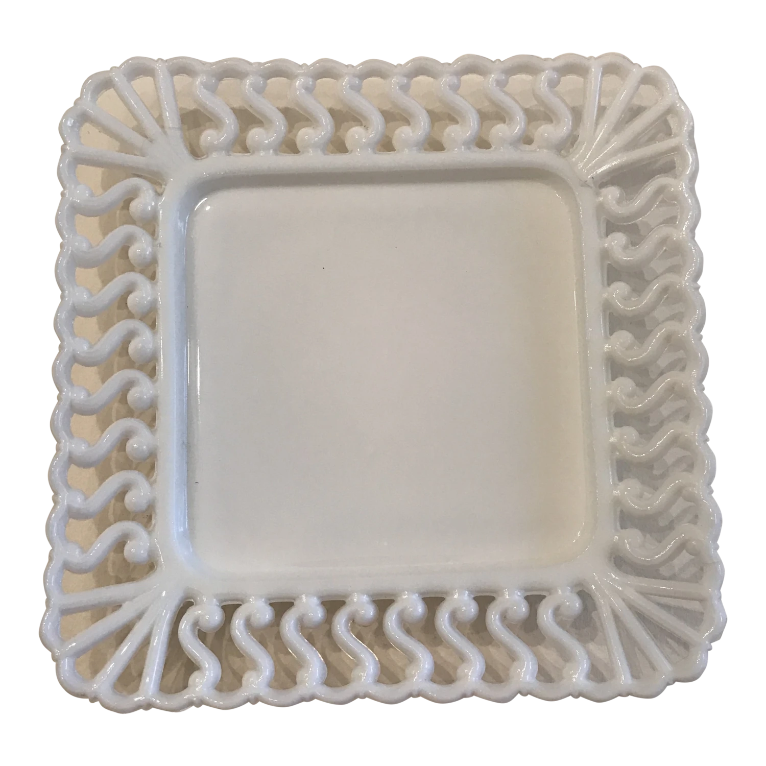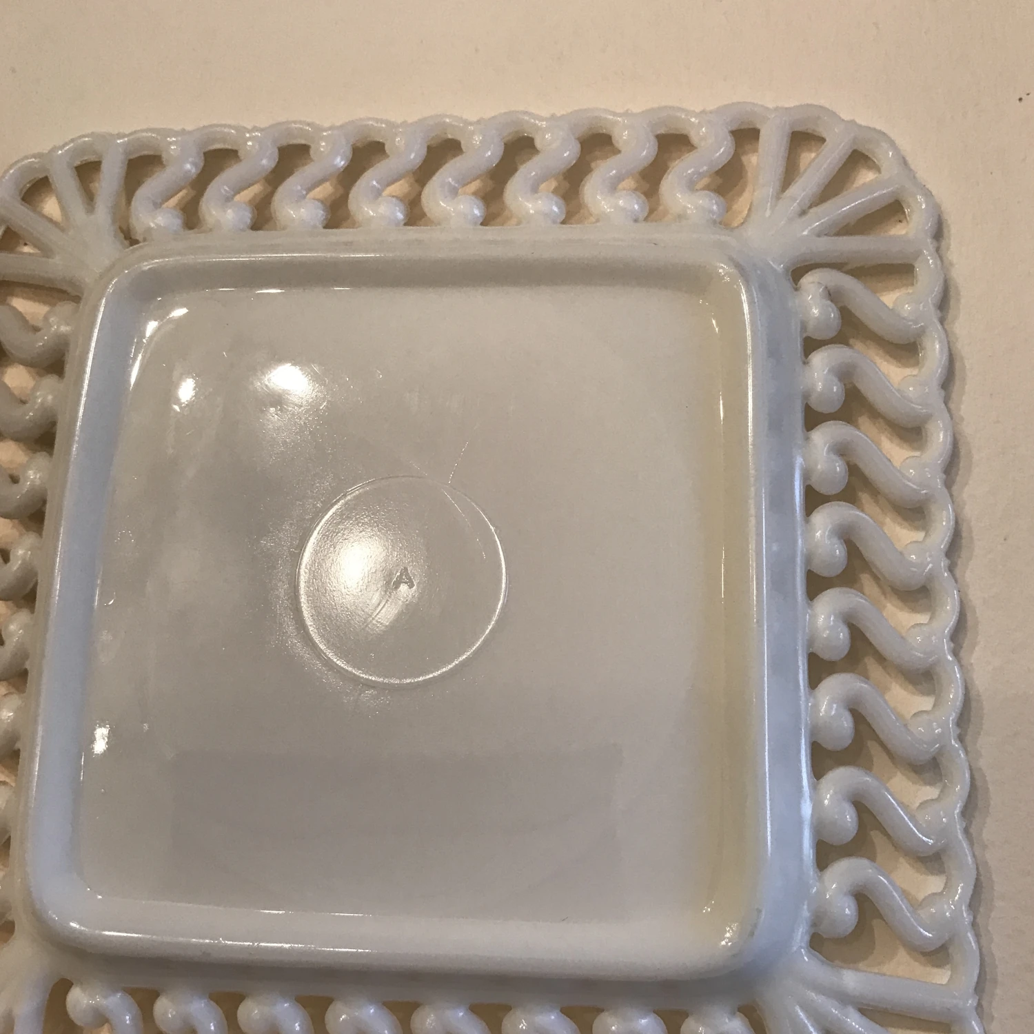 Early American antique square milk pressed glass dish or small platter is in excellent shape. It is the 19th century highly collectible Atterbury brand from Pennsylvania. The glass raised lace edge is in the “S” design. This inherited piece is beautiful for display or artistic serving of small morsels. The center posterior trademark, as in photo, is a half dollar, approximately, sized circle with a central “A.”