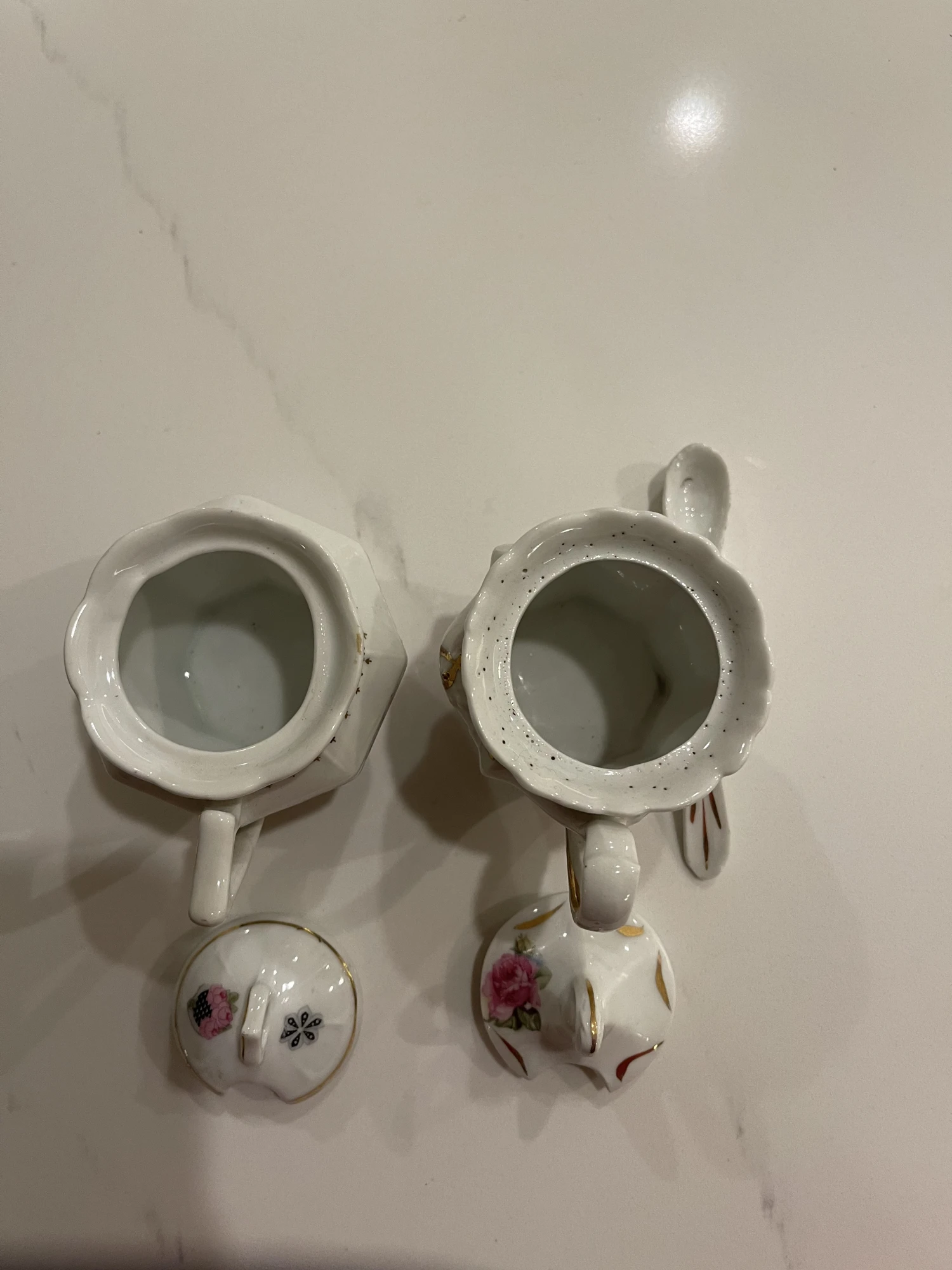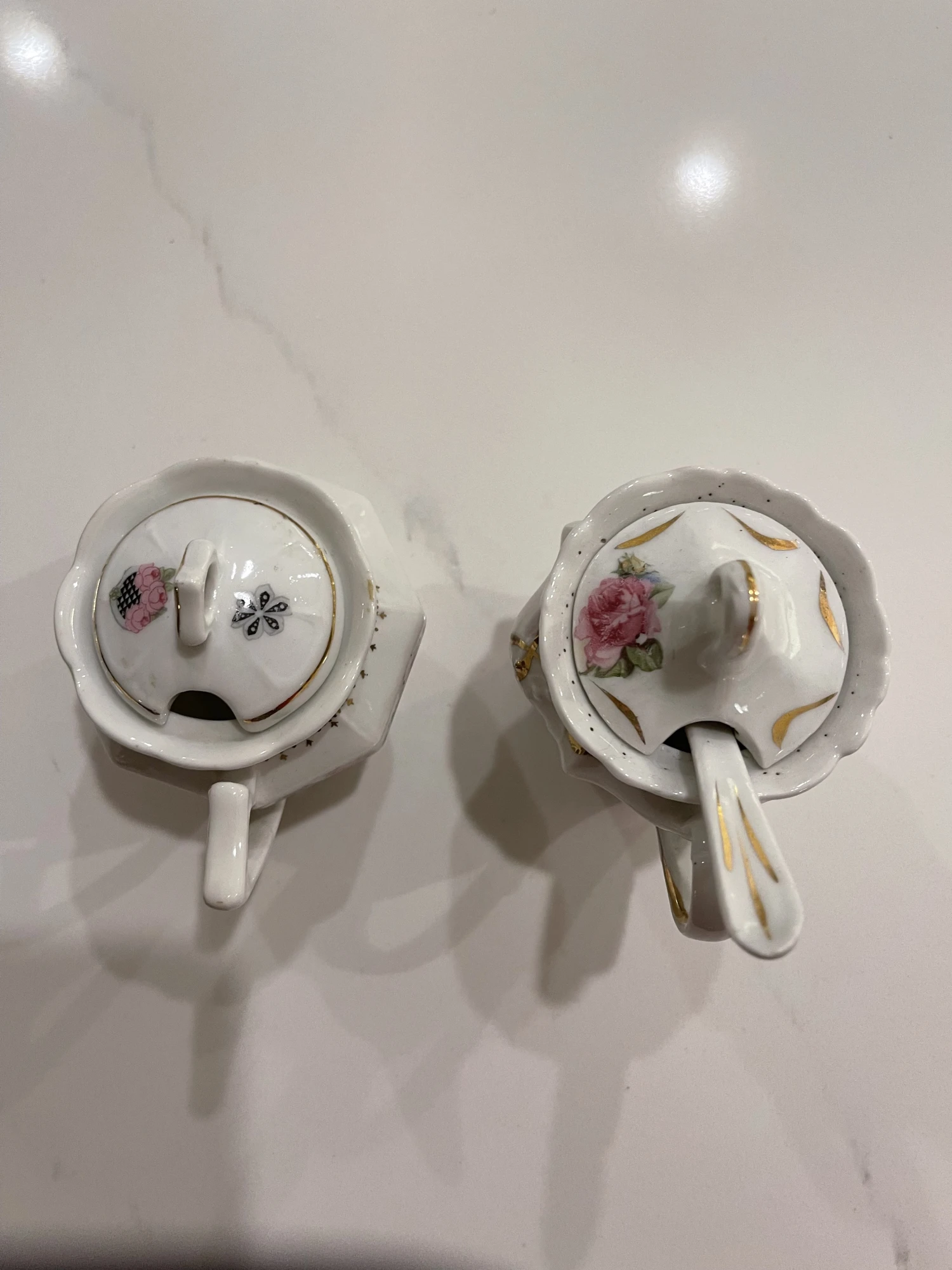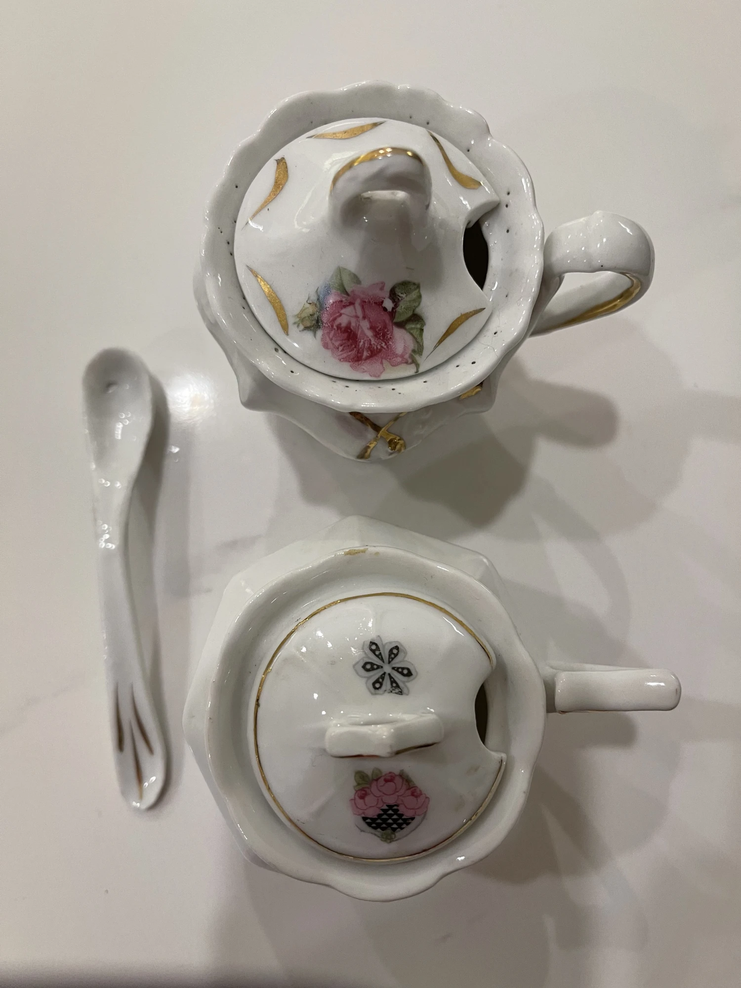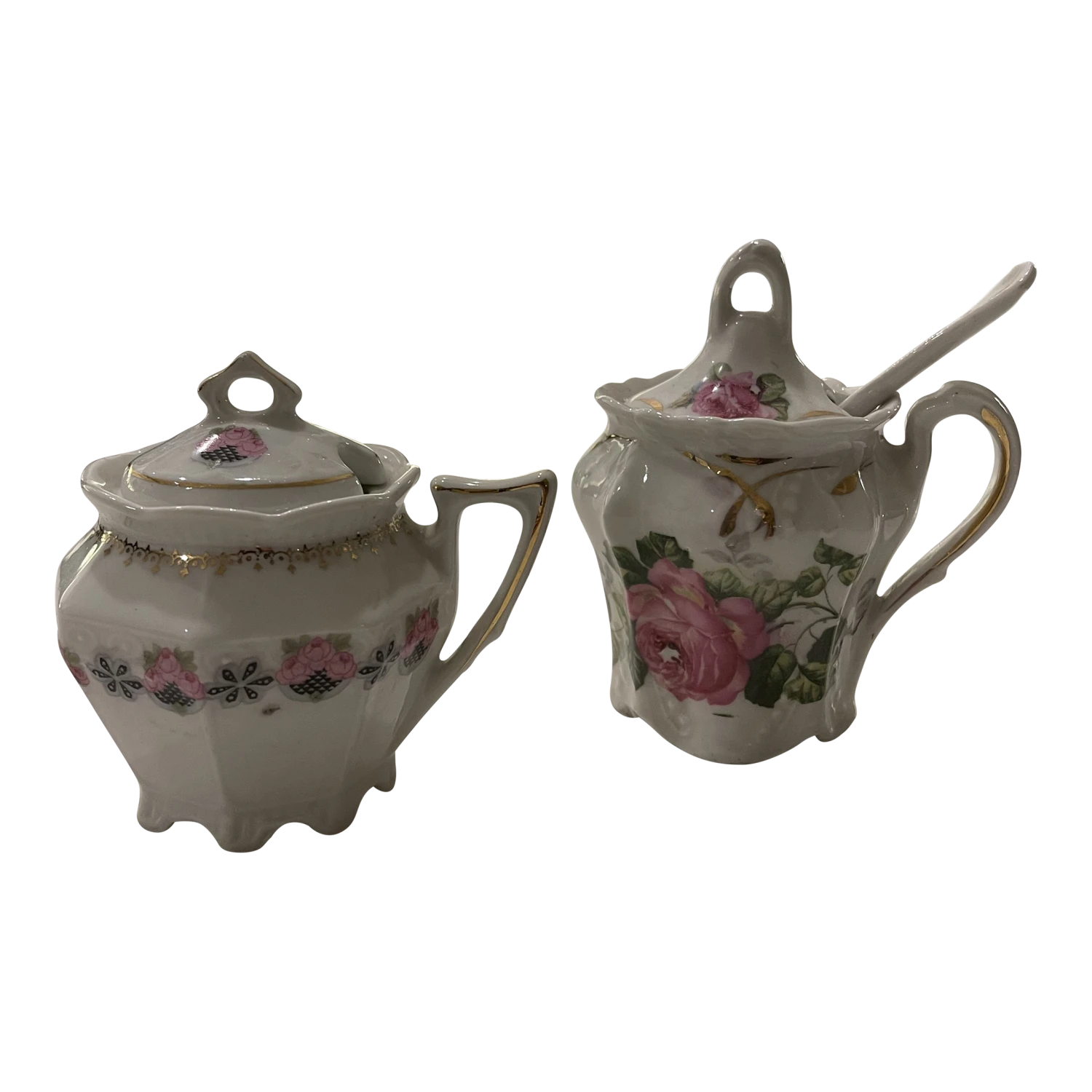 2 sugar bowls or used for salt. 1 spoon includeed and measure almost 4 and 3/4 inches. 1900’s pretty floral …