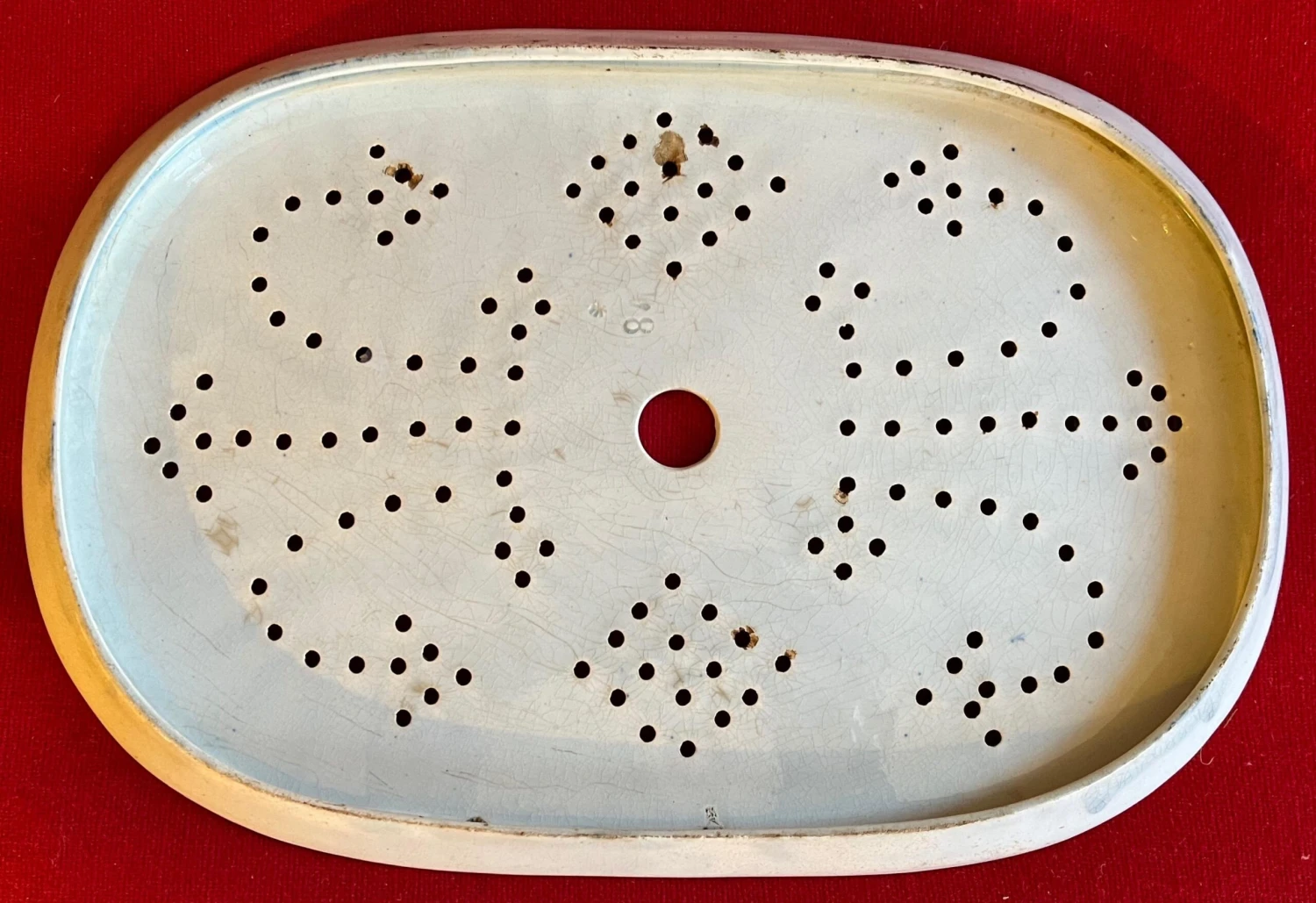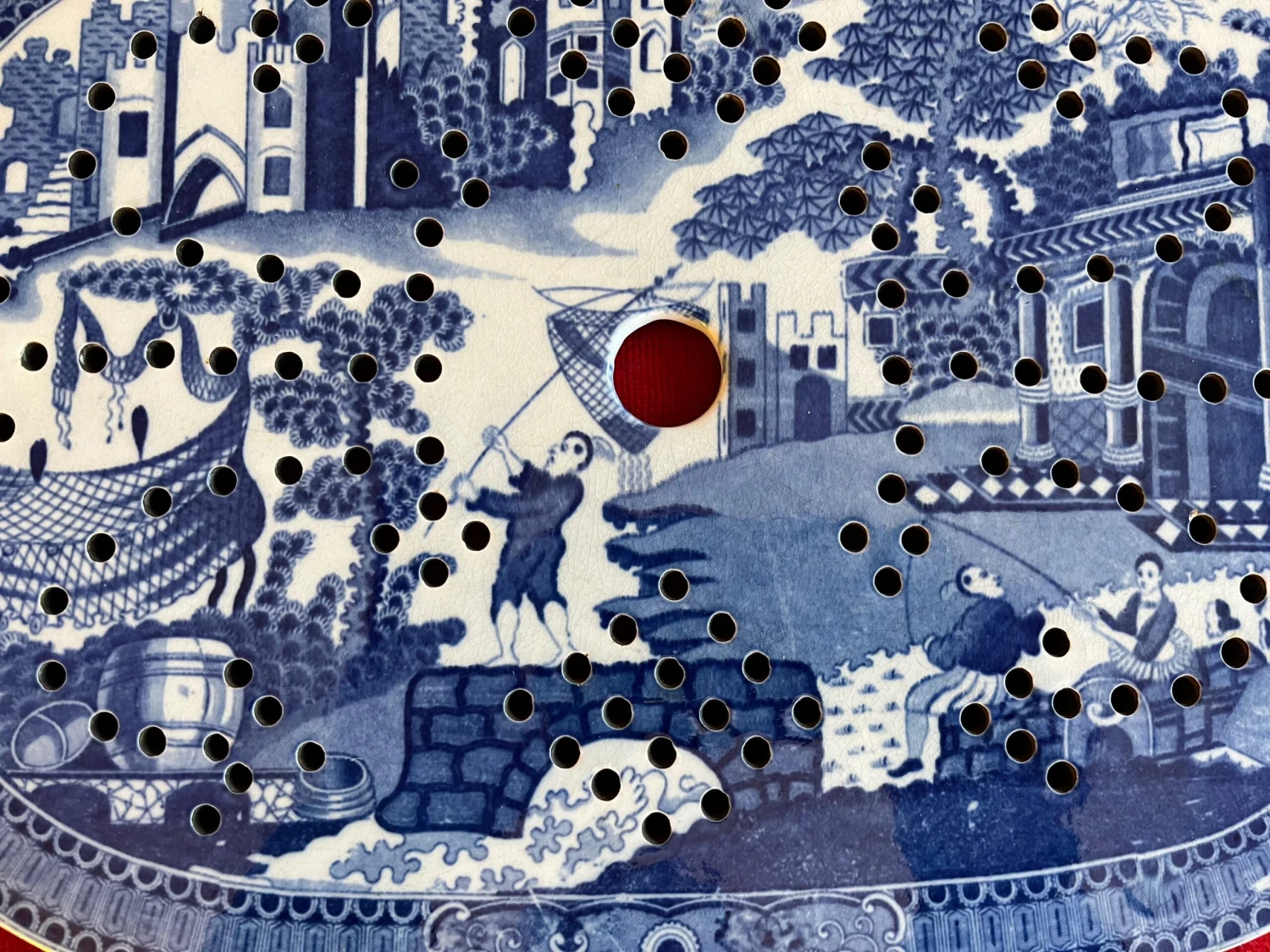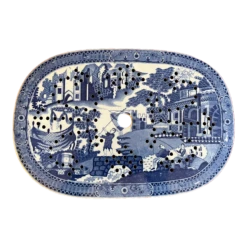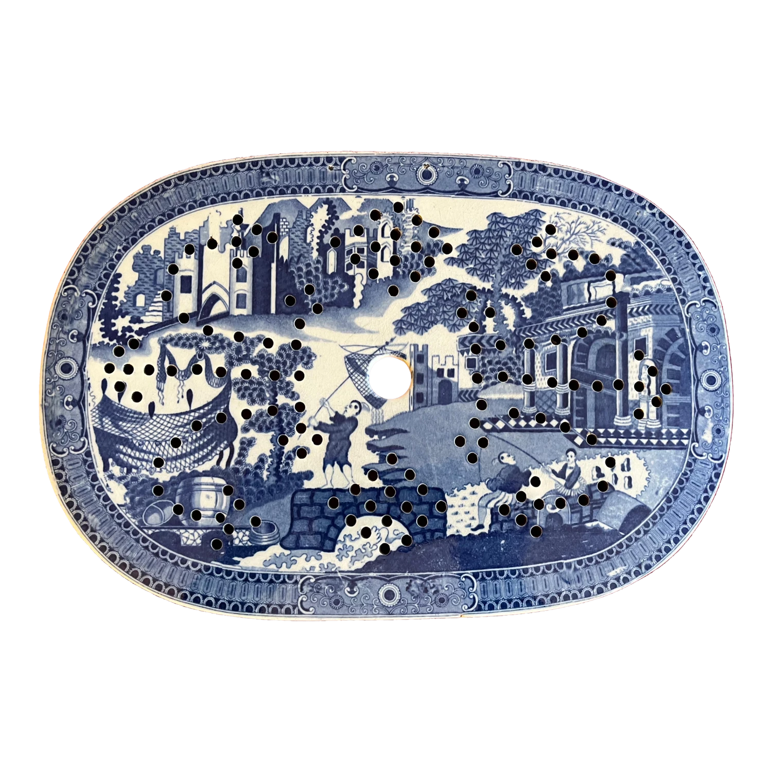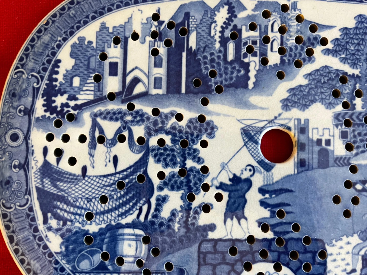 Antique early 19th century English Staffordshire pearlware blue & white transferware mazarin strainer for a platter. Decorated with an intricate Chinese harbor landscape scene with fishermen and classical buildings. Measures 14″ x 9 1/2″. Good condition.