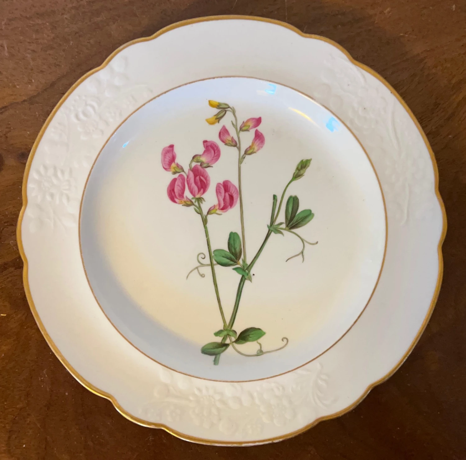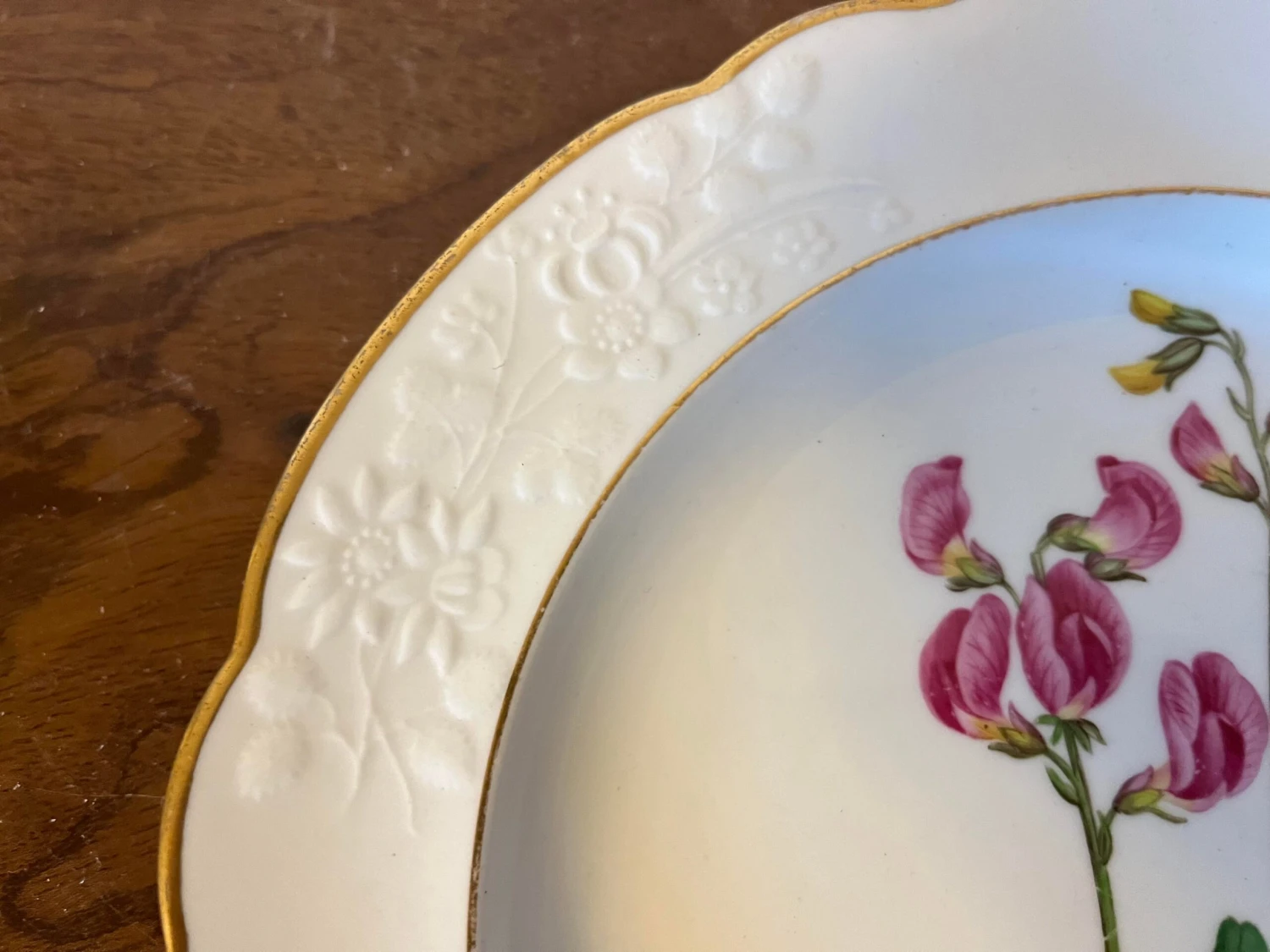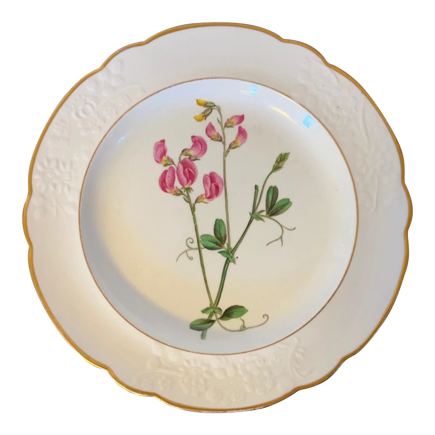 Antique early 19th century Spode porcelain botanical plate decorated with hand painted named specimen – Pease Earth-nut. The border nicely shaped and with relief molded flowers. Measures 8 3/4″ diameter. Fully marked on the back. Good condition.