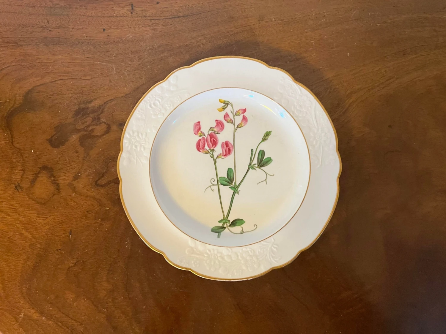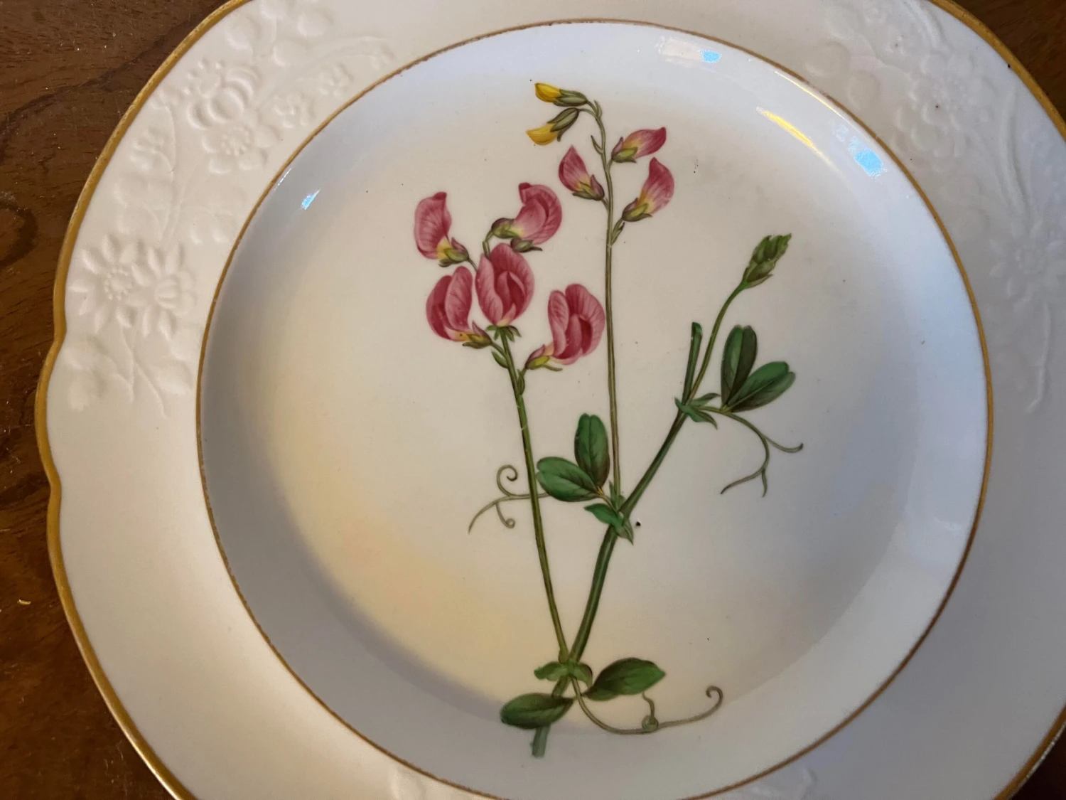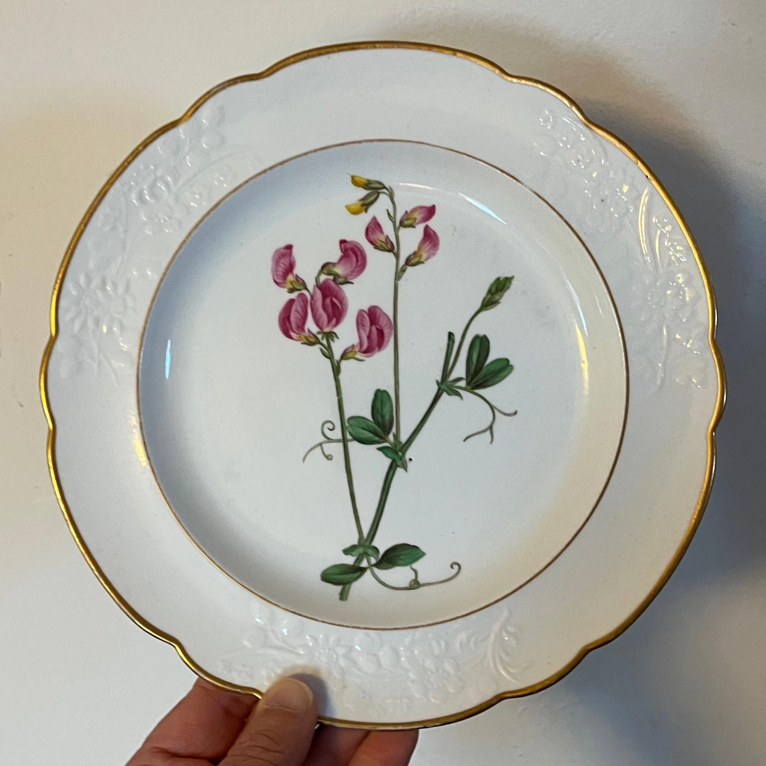 Antique early 19th century Spode porcelain botanical plate decorated with hand painted named specimen – Pease Earth-nut. The border nicely shaped and with relief molded flowers. Measures 8 3/4″ diameter. Fully marked on the back. Good condition.