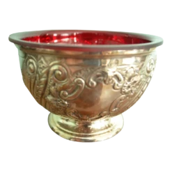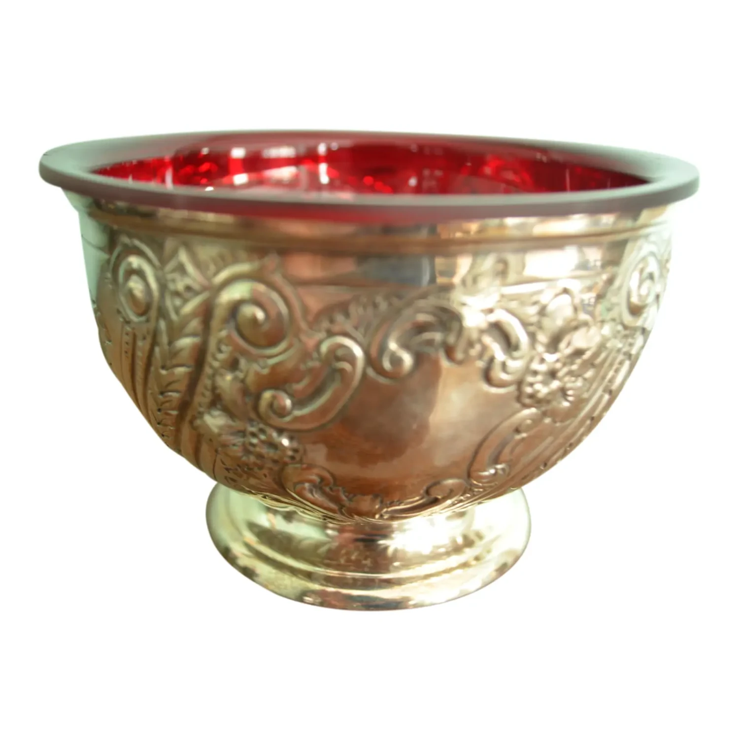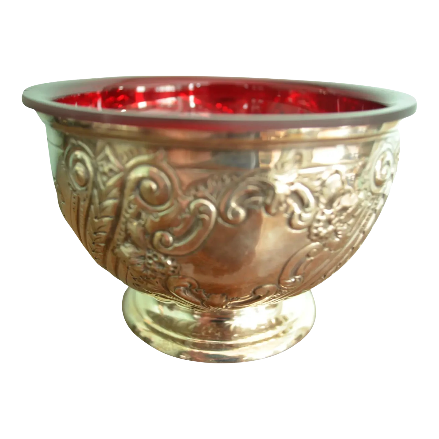 A silverplate bowl in remarkable excellent condition from 1916 England. An elaborate embossed design and a removable deep ruby liner. …