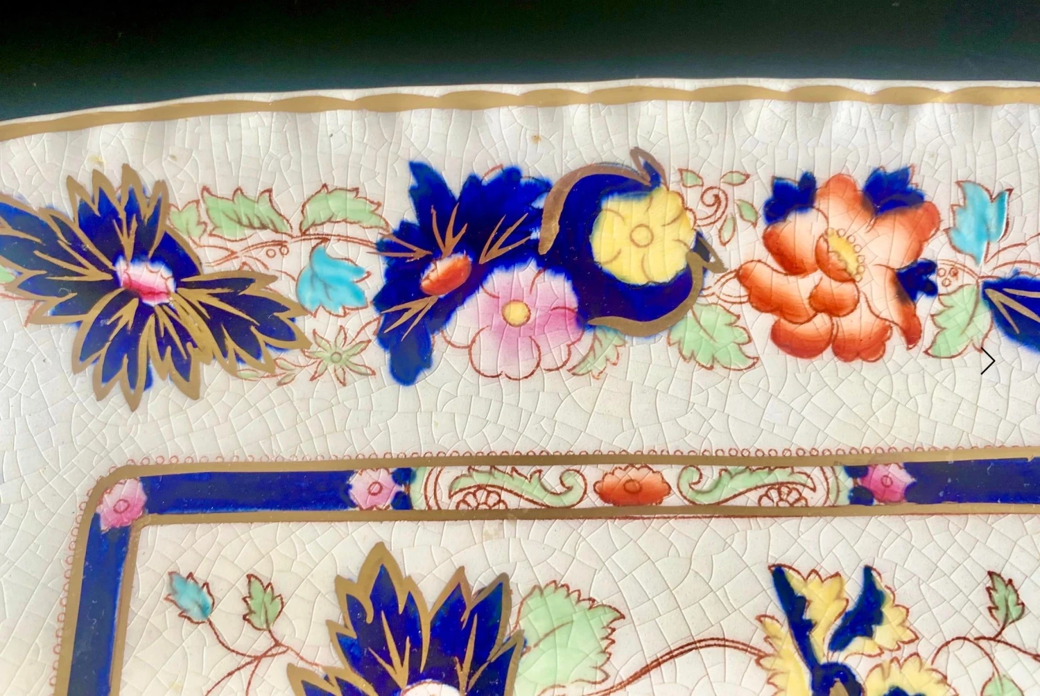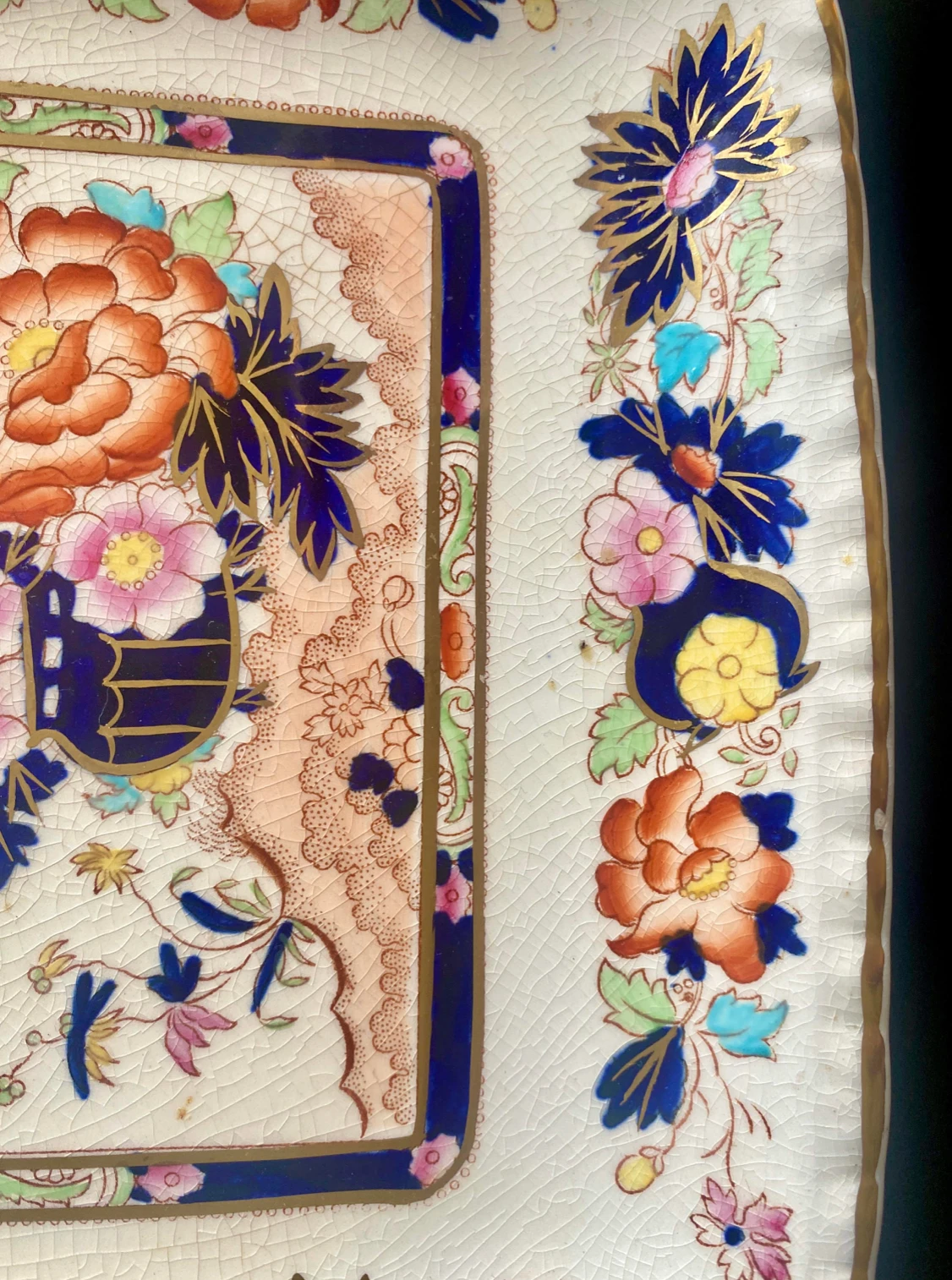 Colorful, gilt edged serving platter by Mason’s. The pattern is Mandarin, featuring a Chinoiserie themed design with peonies and a vase. Circa 1920s.
