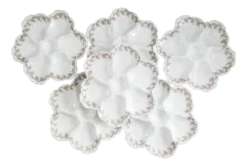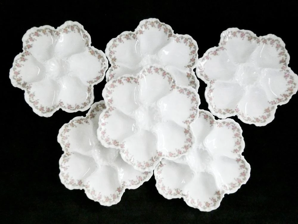 set of 6 antique limoges oyster plates, rare french oyster plates, white limoges porcelain oyster plates, france, 20-30s this piece has an attribution mark,