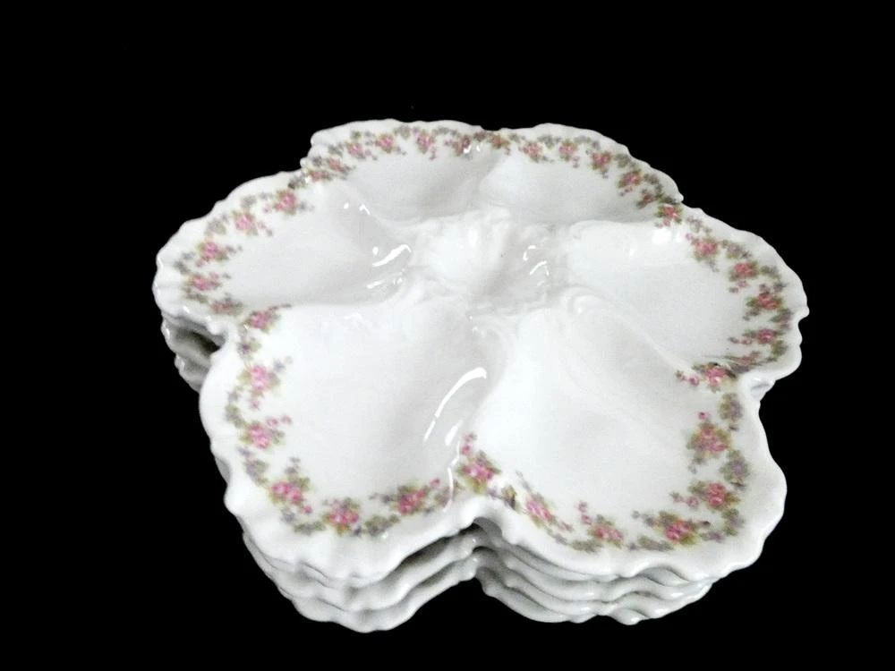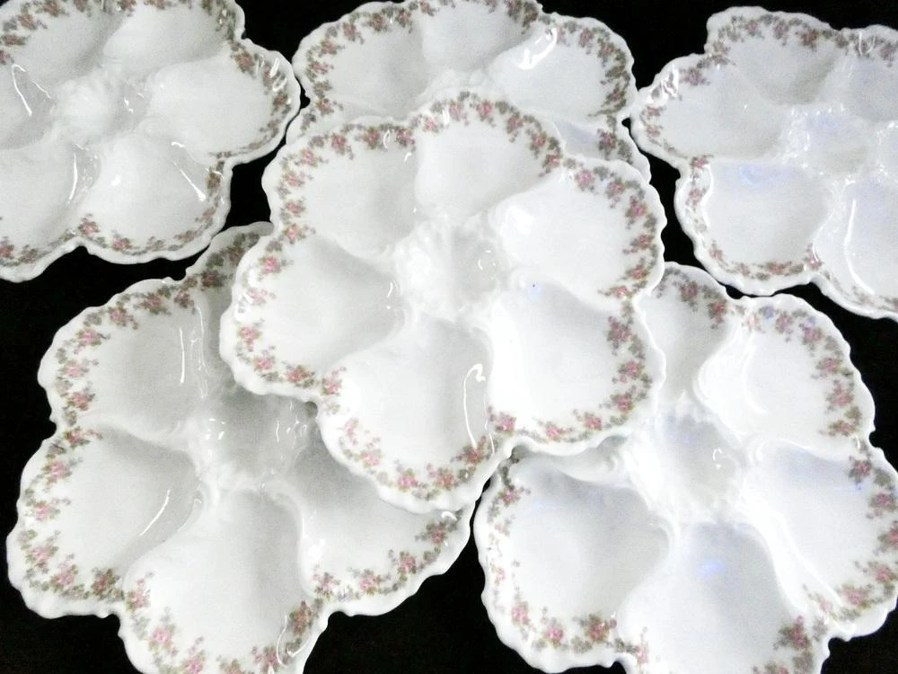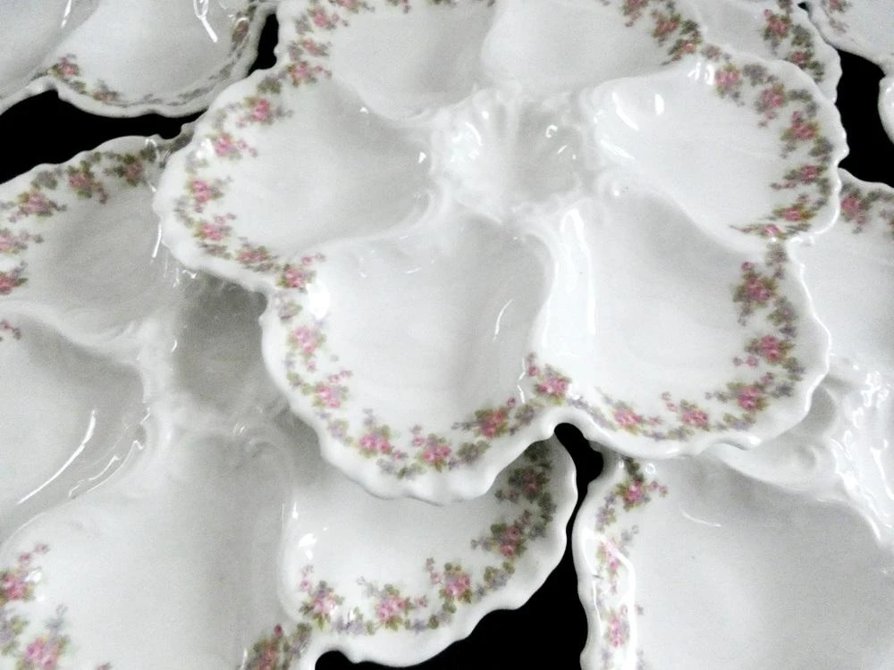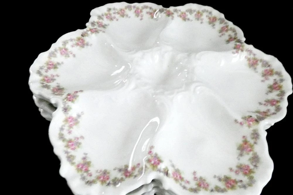 six oyster wells and one sauce well in center. White french porcelain, embossed edge and lovely wreath of wild flowers decorates the rim.