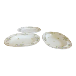 Antique Set of three hand-painted floral Victorian serving dishes including two bowls and one small platter. Dimensions: two bowls, 9.5″L x 7.5″W x 1.5″H; one platter, 10″L x 8.25″W x 1″H. Some age wear.