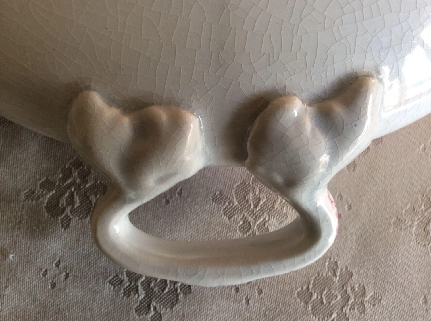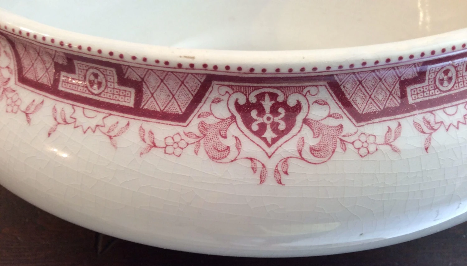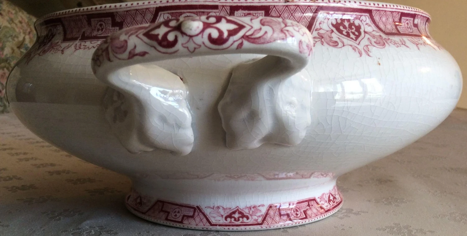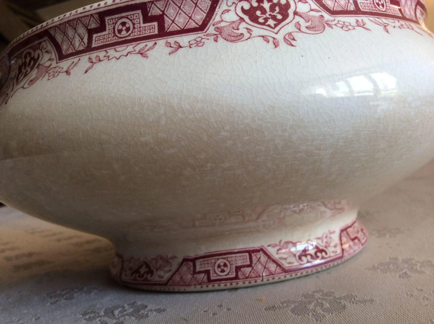Very nice and good size bowl/tureen in the Maroc pattern in burgundy. It is very well preserved for its age but it does have crazing throughout but no nicks, chips and no discoloration.
