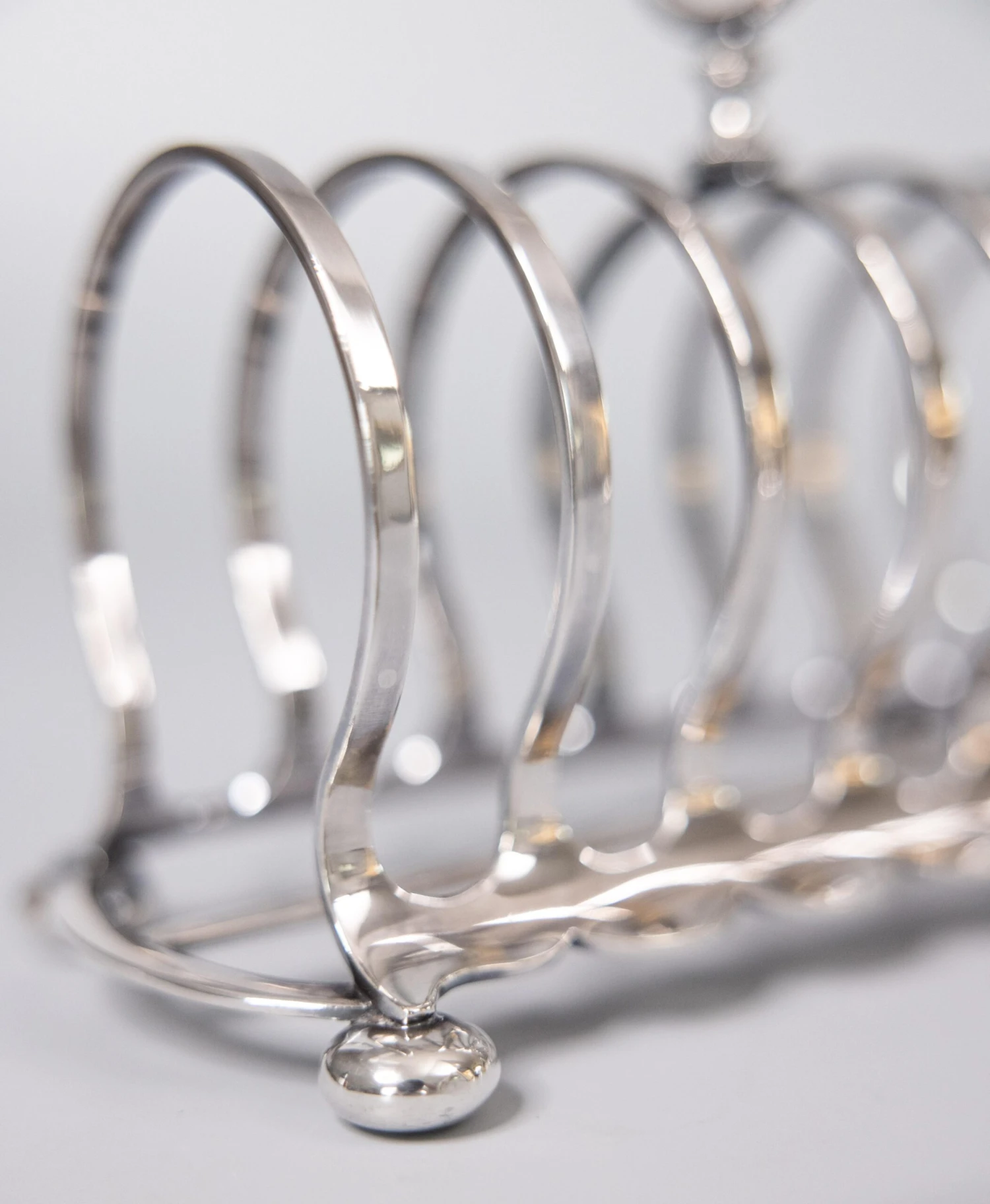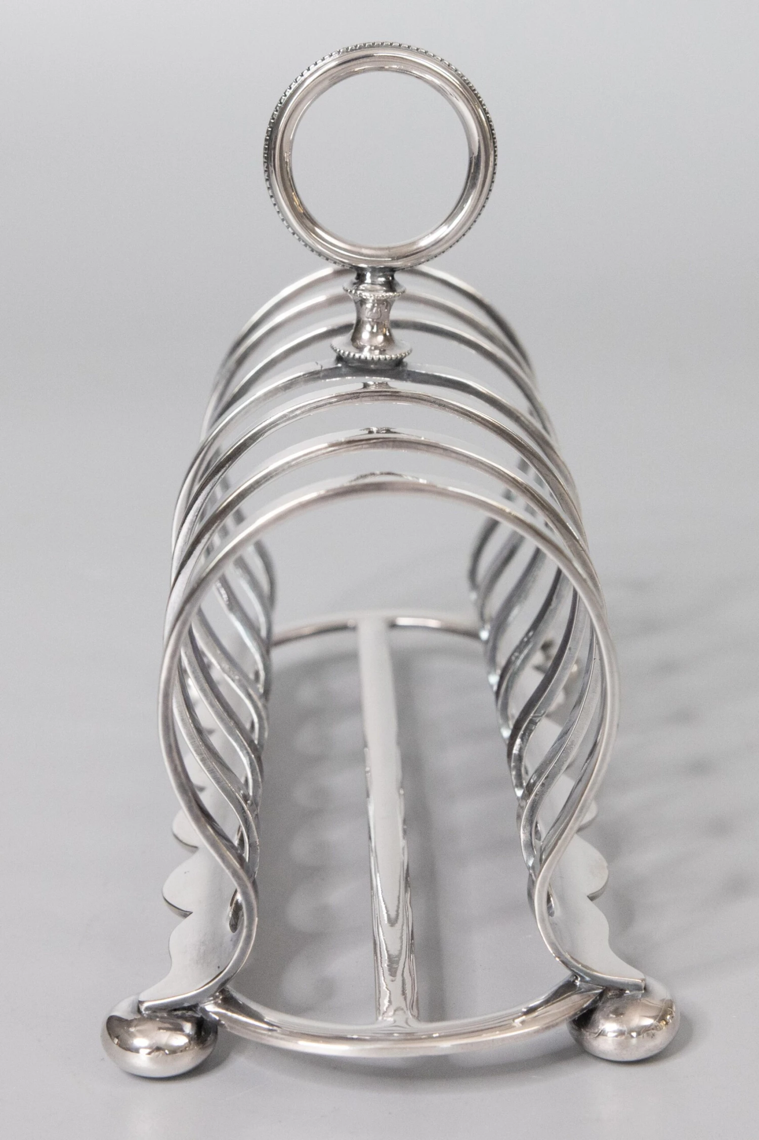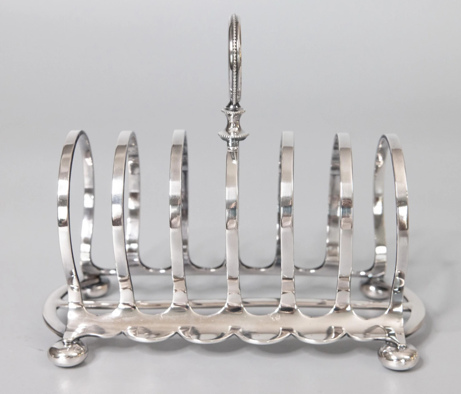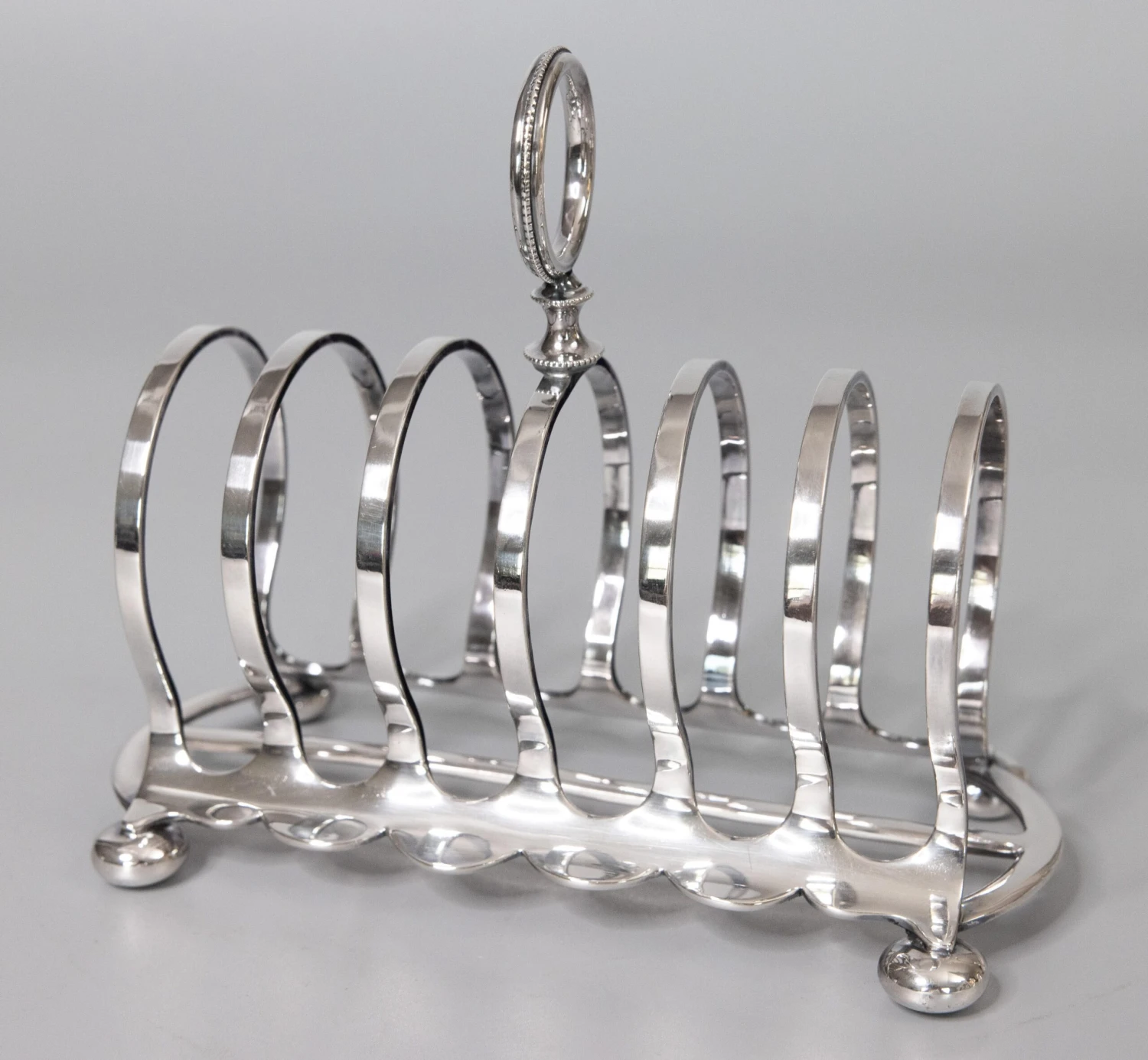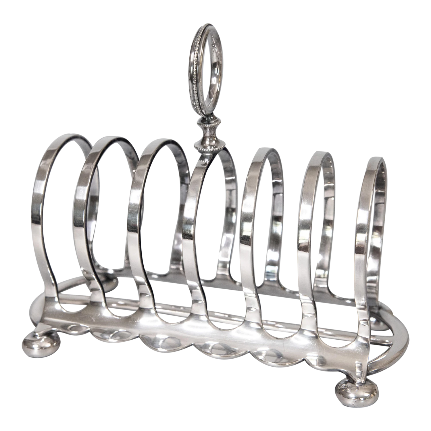 A superb antique Art Deco English Edwardian silverplate six slot toast rack. Hallmarks on reverse. This fine quality silver toast rack is well made with a lovely arched shape, beaded finial, and charming bun feet. It’s a nice large size, perfect for serving toast or used as a letter holder.