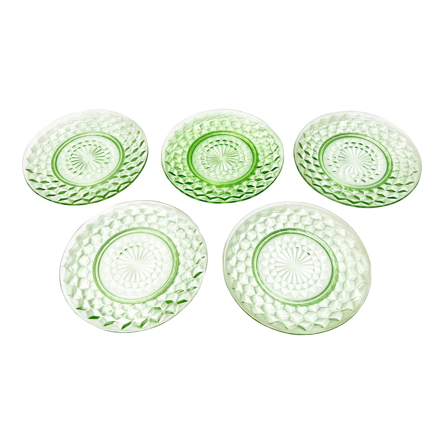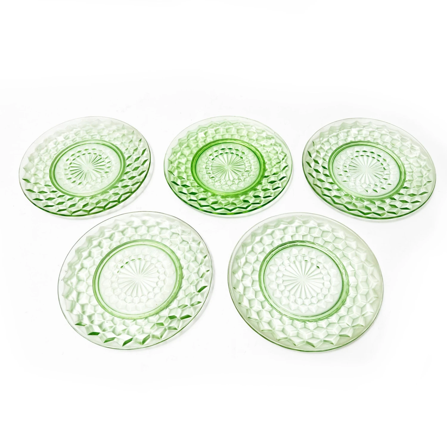 Antique art deco set of 5 Hex Optic, Cubist depression glass dinner plates, made by Jeannette. Jeannette Glass Co. manufactured …