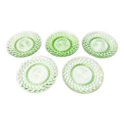 Antique art deco set of 5 Hex Optic, Cubist depression glass dinner plates, made by Jeannette. Jeannette Glass Co. manufactured the “Hex Optic Cube” pattern (AKA the “cubist” pattern”) from 1929 – 1933. The pattern has a geometric cubed faceting pattern radiating from a sunburst center. All of the details stand out on the pale lime green coloring! At 8″ in diameter these plates are perfect for serving up any of your favorite meals and mix in well with other dining room decor.