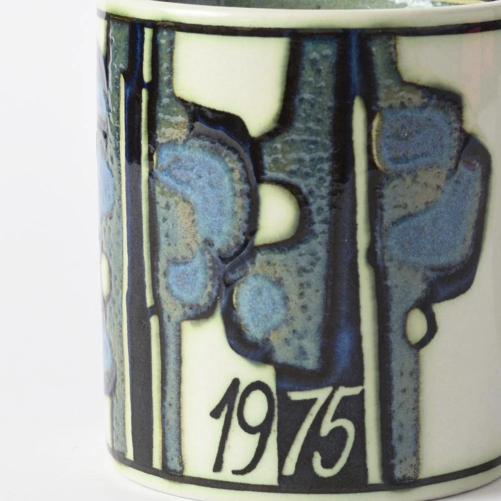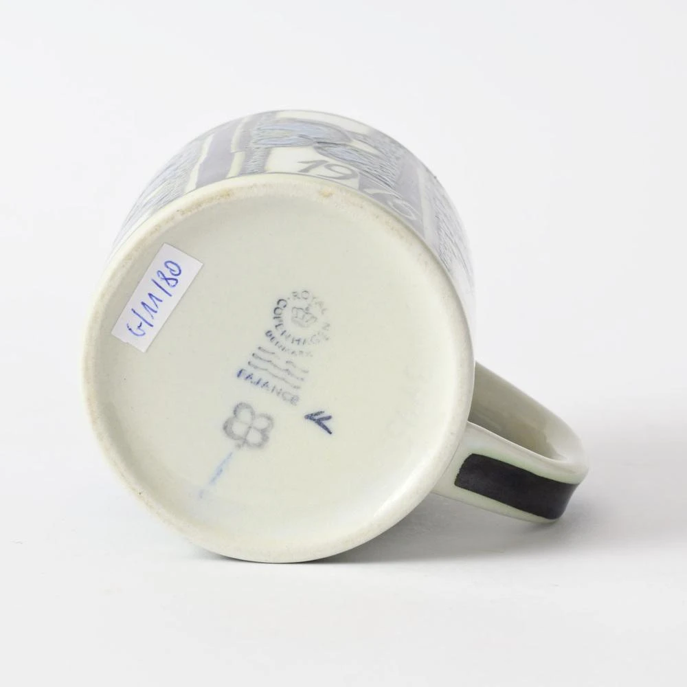 Each year from 1969 till 2014, Royal Copenhagen was issuing a mug designed by a different artist. This is the 1975 edition designed by Bodil Buch. Mugs were made in two sizes, this is the smaller one. This piece has an attribution mark,