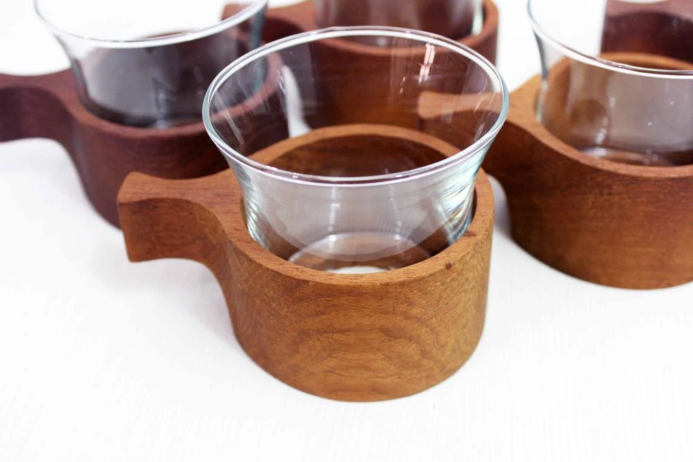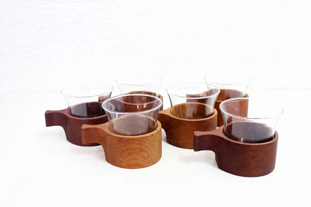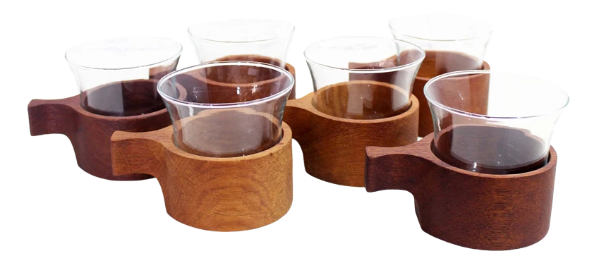 It consists of 6 glasses on a teak stand.