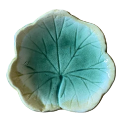 This beautiful antique majolica butter pat’s charming details and beautiful colors make it the perfect addition to a majolica or serve ware collection. It features a leaf shape, with textured veins and pointed edges. The green and yellow on the front of the dish are soft subtle, and the back’s blue glaze is the perfect complement.