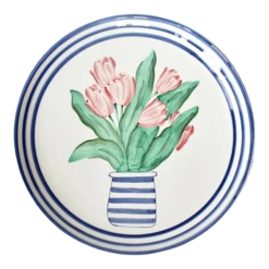 A vintage Italian extra-large round platter with a design of pink and green tulips in a blue and white striped vase, with the blue and white stripes repeated in the border. Marked (stamped and printed) Vietri, Italy, 1988. 15.5″x1.75″.
