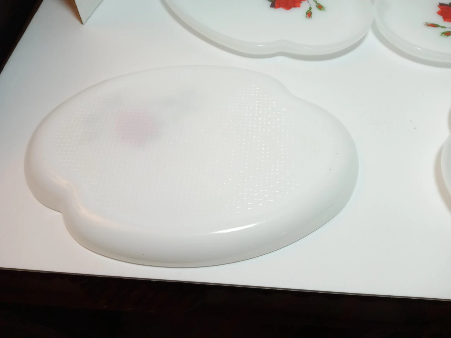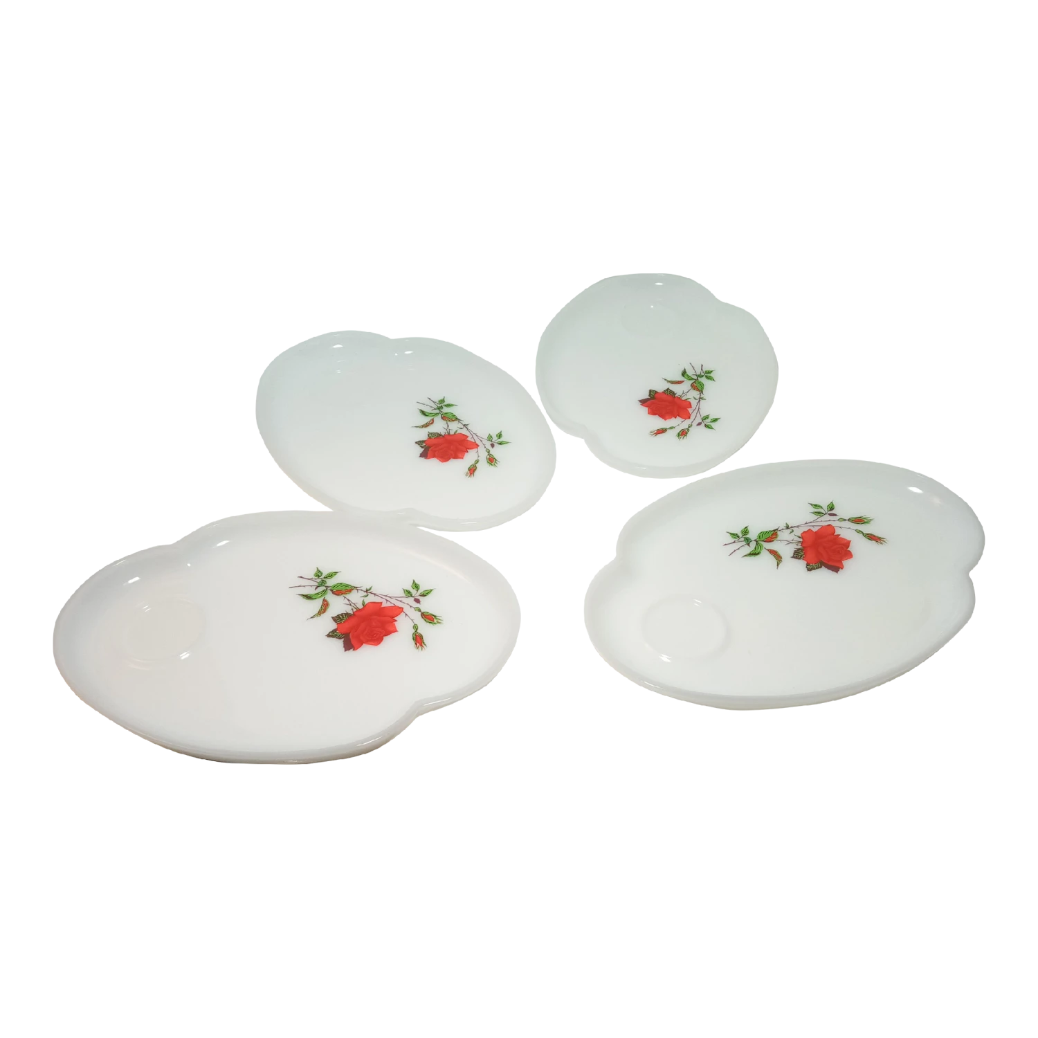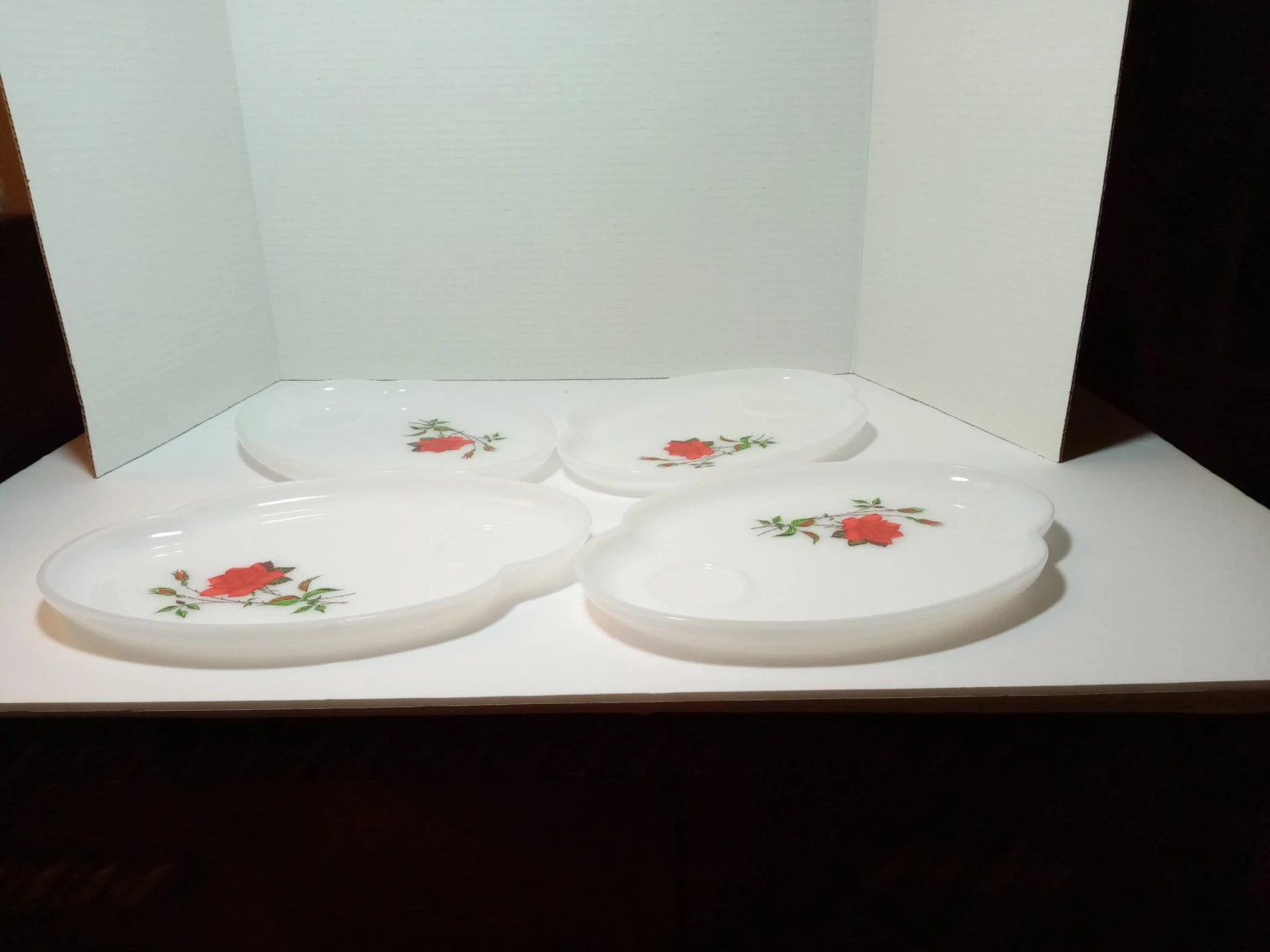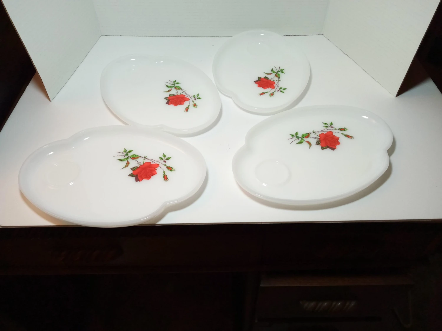 Four white snack plates made in the 1950’s by Federal Glass company. Each plate is mostly white with a vivid red rose. The bottoms are a grid pattern. The plates are 10 1/4″ x 7 1/2″. One plate has a chip on the edge.
