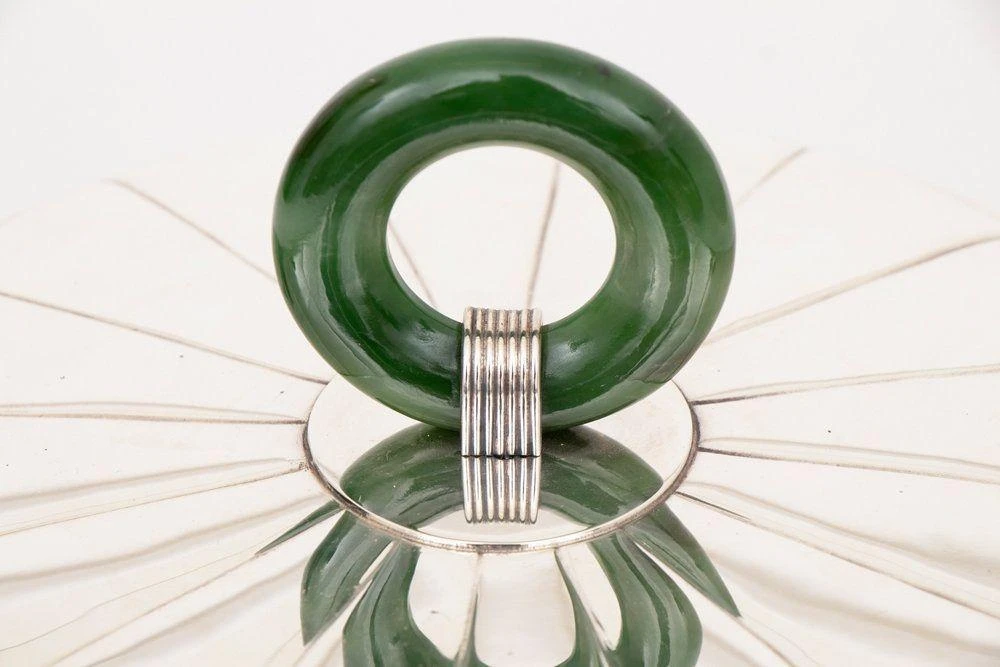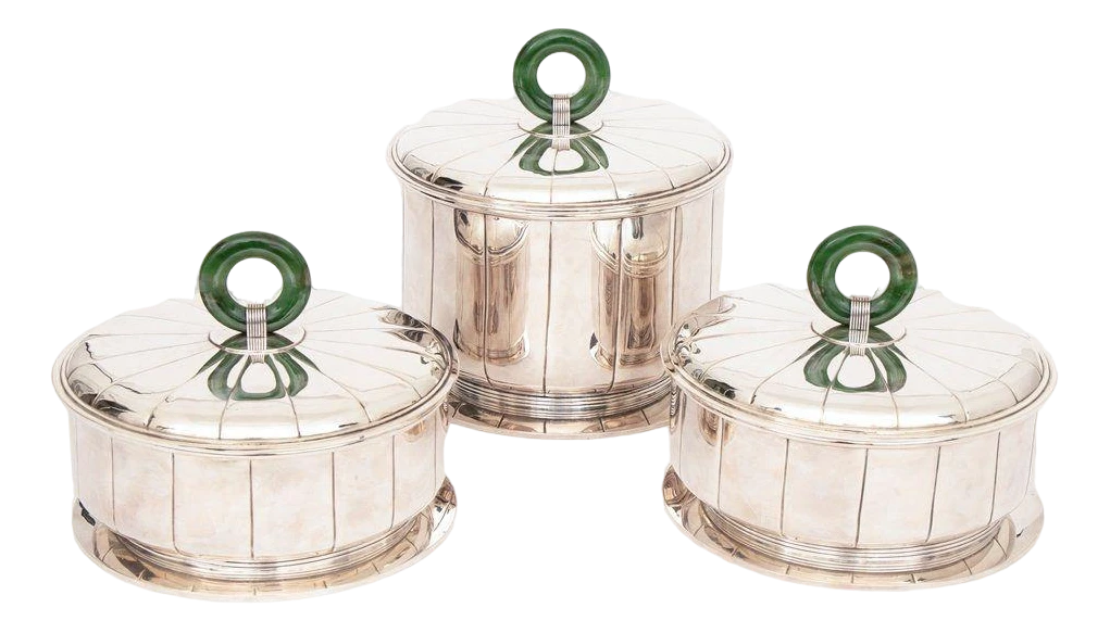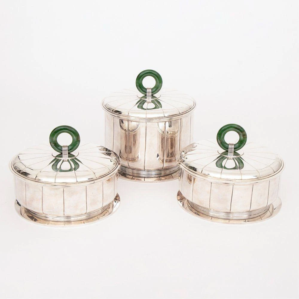 Large – h: 24cm w: 23.5cm d: 23.5cm small – h: 18cm w: 23.5cm d: 23.5cm a french art deco jean e puiforcat set of three silver on bronzes tureens with jade ring finials. The sides features chased panels.