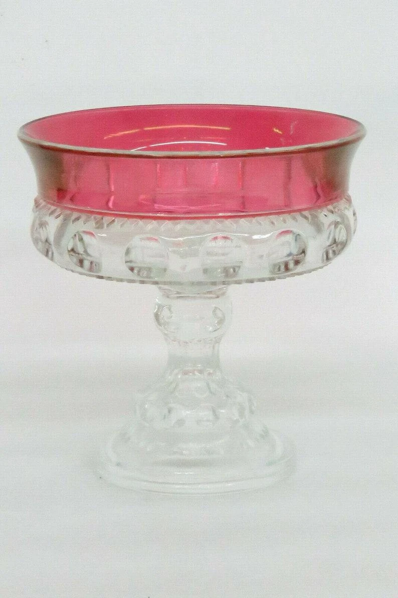 This excellent Compote / Candy Bowl is made of glass. This brilliant compote is made in the magnificent Kings Crown style; it features a classic pedestal silhouette, a very interesting ruby red flashed color around the rim of the dish, and the lovely Thumbprint pattern decorating the clear glass body of the piece. We believe the piece may have been made by Indiana Glass due to the design, however please note there is no makers mark or stamp. Please see photos of measurements for size/scale, the height is approximately 5 1/4″ and the diameter of the rim is approximately 5″.