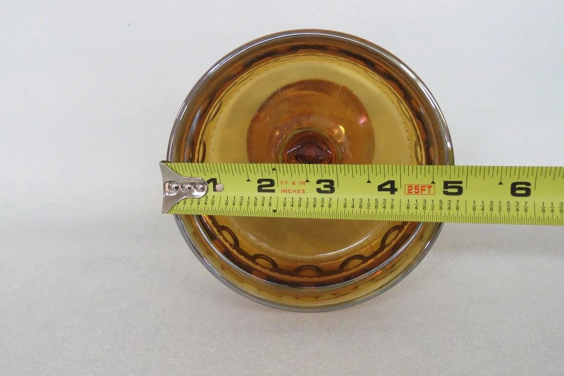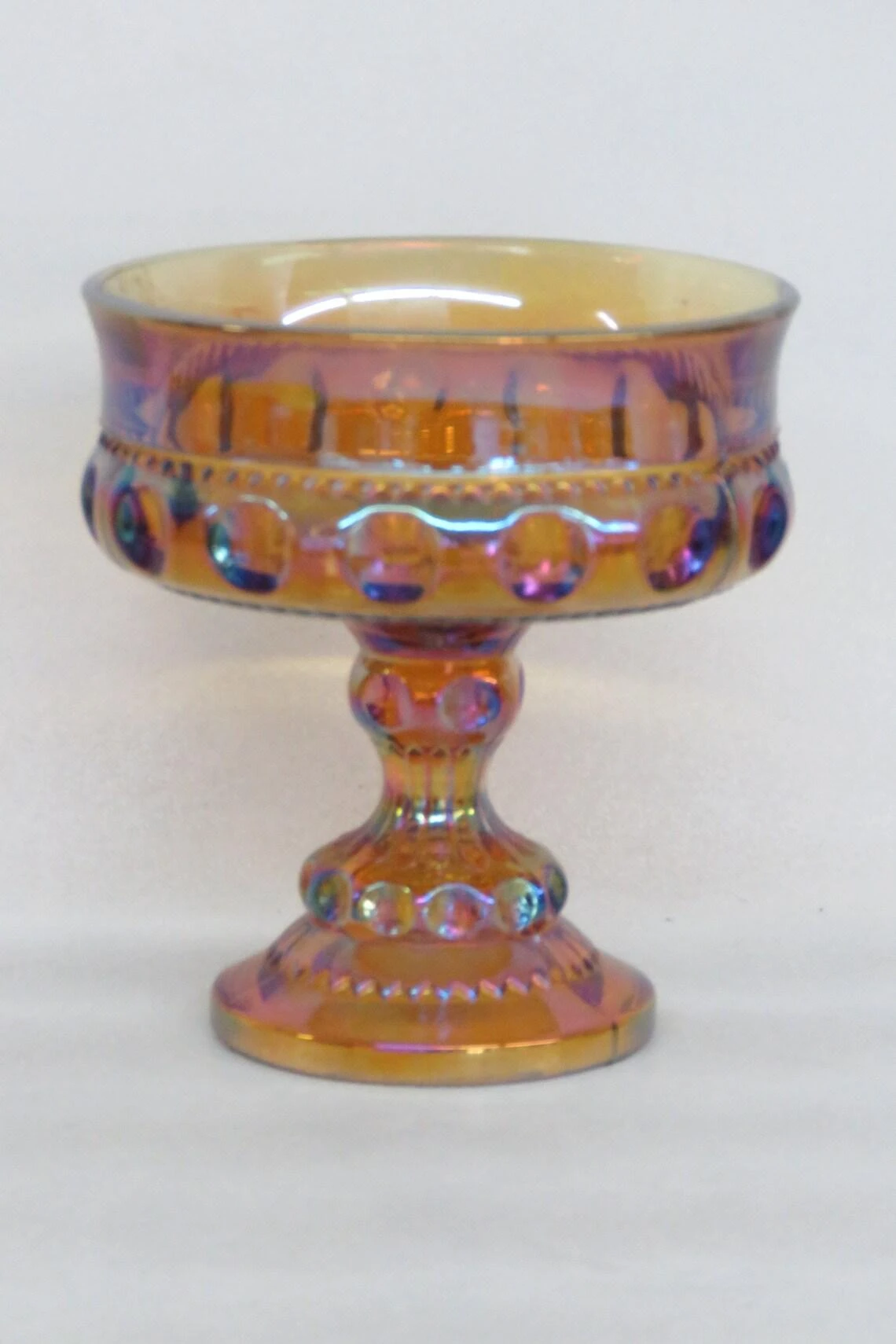This gorgeous Candy Dish / Compote is made of carnival glass. This adorable Compote is made in the fabulous Kings Crown design made popular by Indiana Glass; it features a classic pedestal silhouette, a delightfully iridescent and shimmering amber color to the glass, and the lovely Thumbprint pattern decorating the dish. We believe the piece may have been made by Indiana Glass due to the design, however please note there is no maker’s mark or stamp.