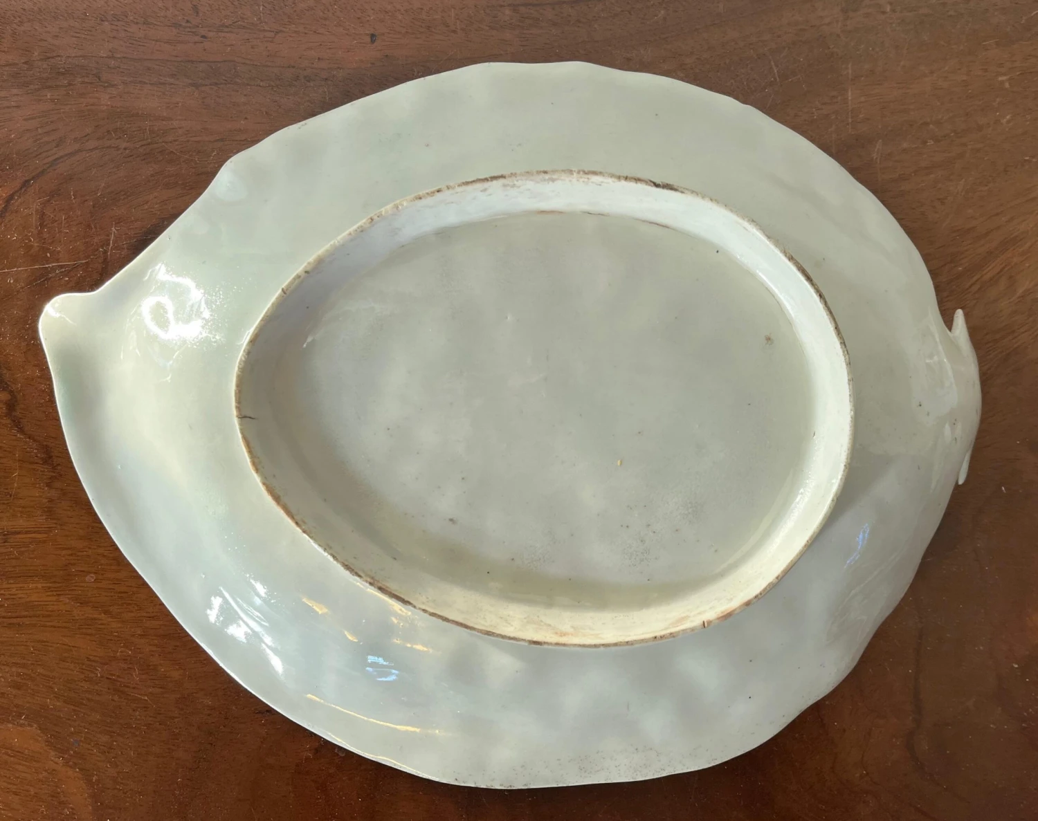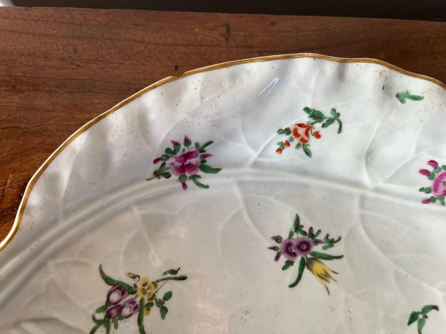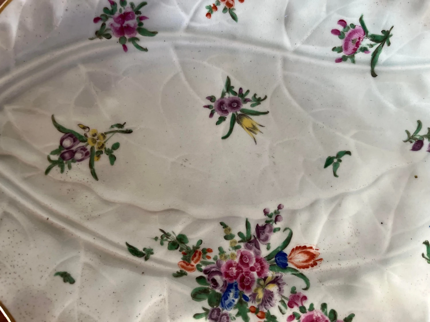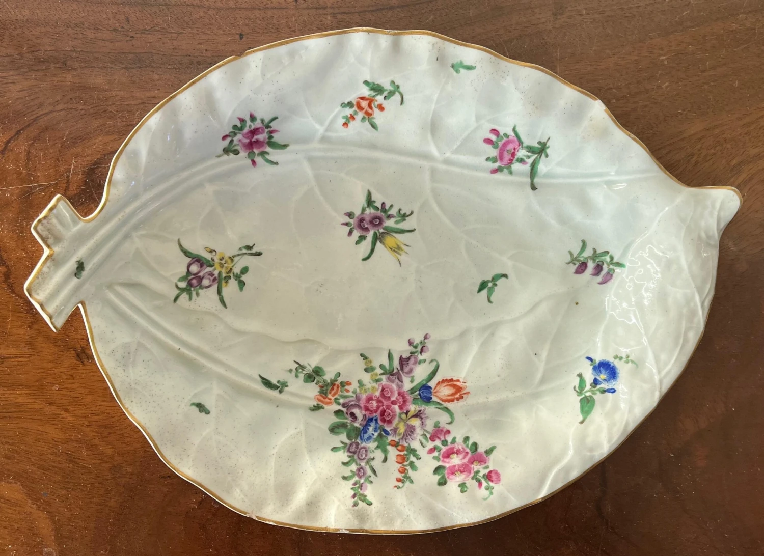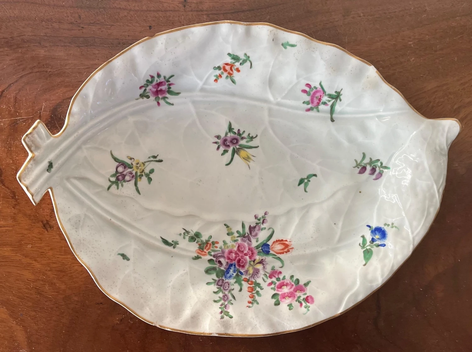 Large antique 18th century Worcester porcelain leaf shape dish. Decorated with floral bouquets. Measures 13″ x 9 1/2″. Good condition – two small rim chips.