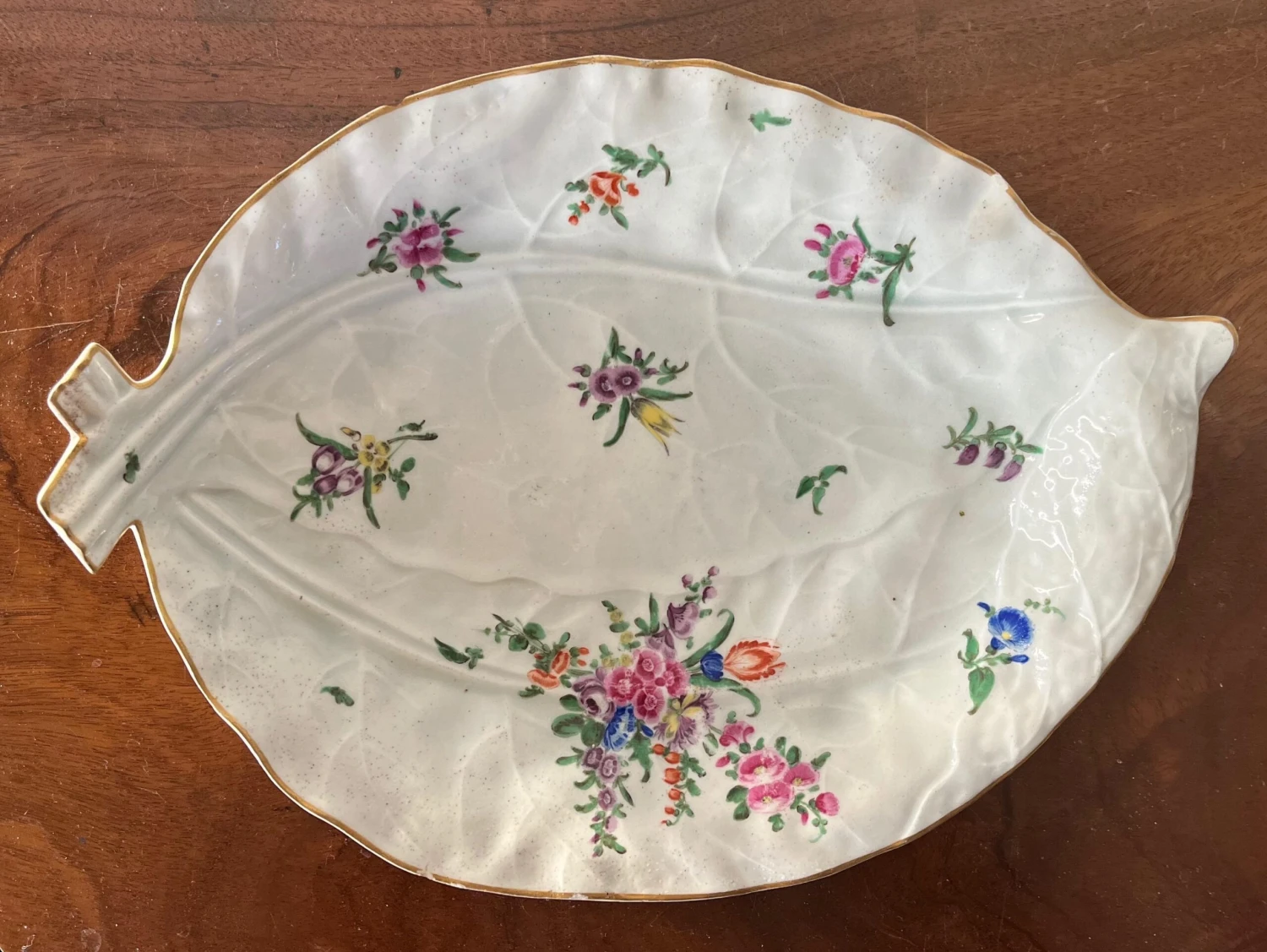 Large antique 18th century Worcester porcelain leaf shape dish. Decorated with floral bouquets. Measures 13″ x 9 1/2″. Good condition …