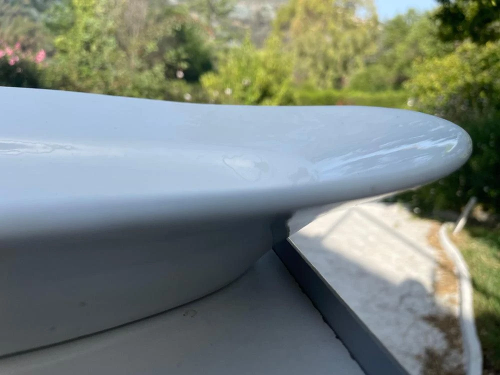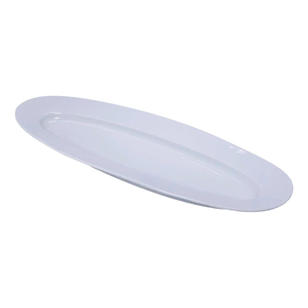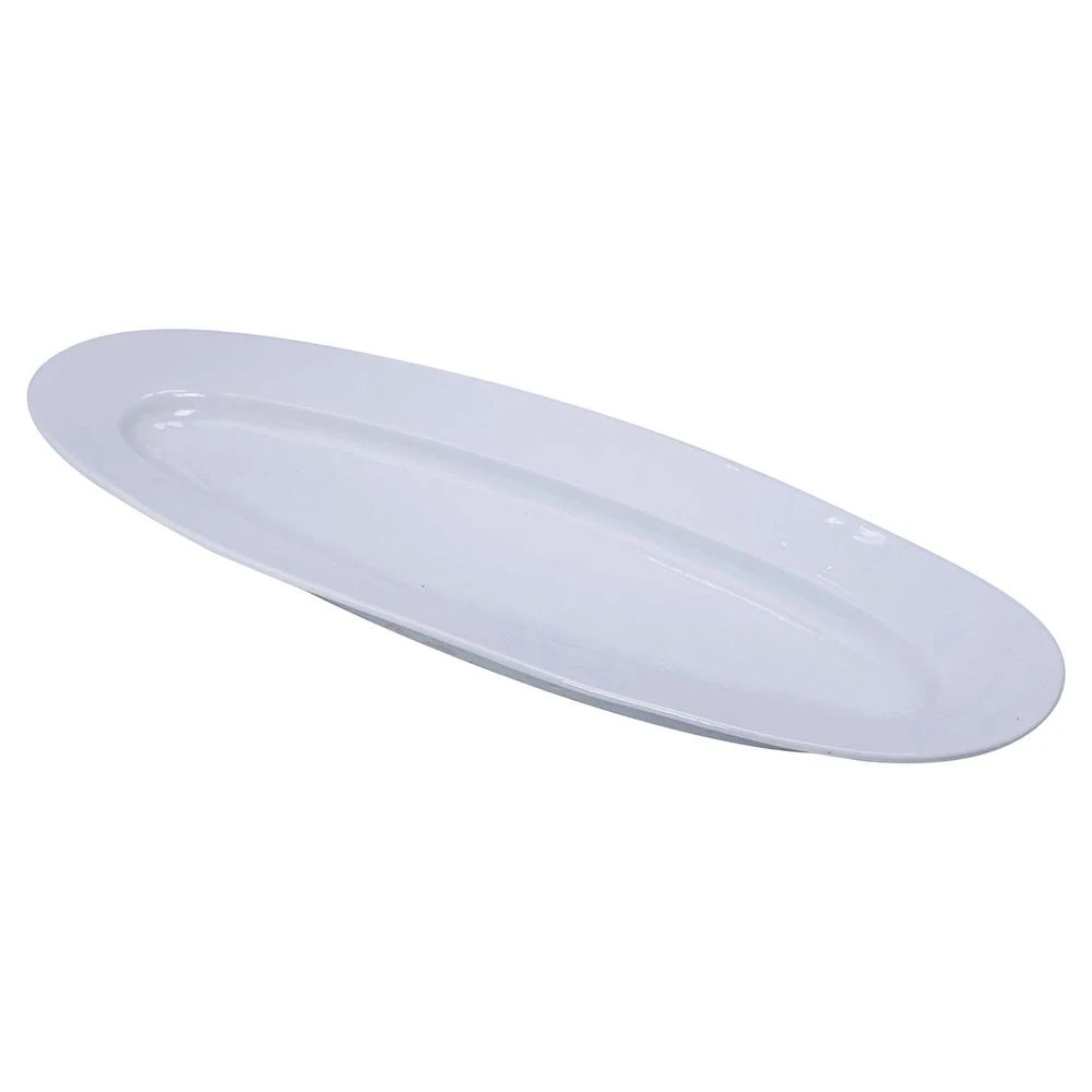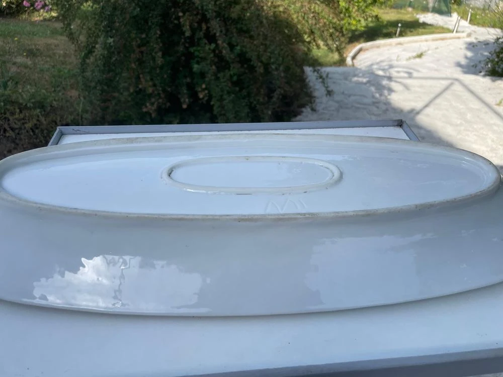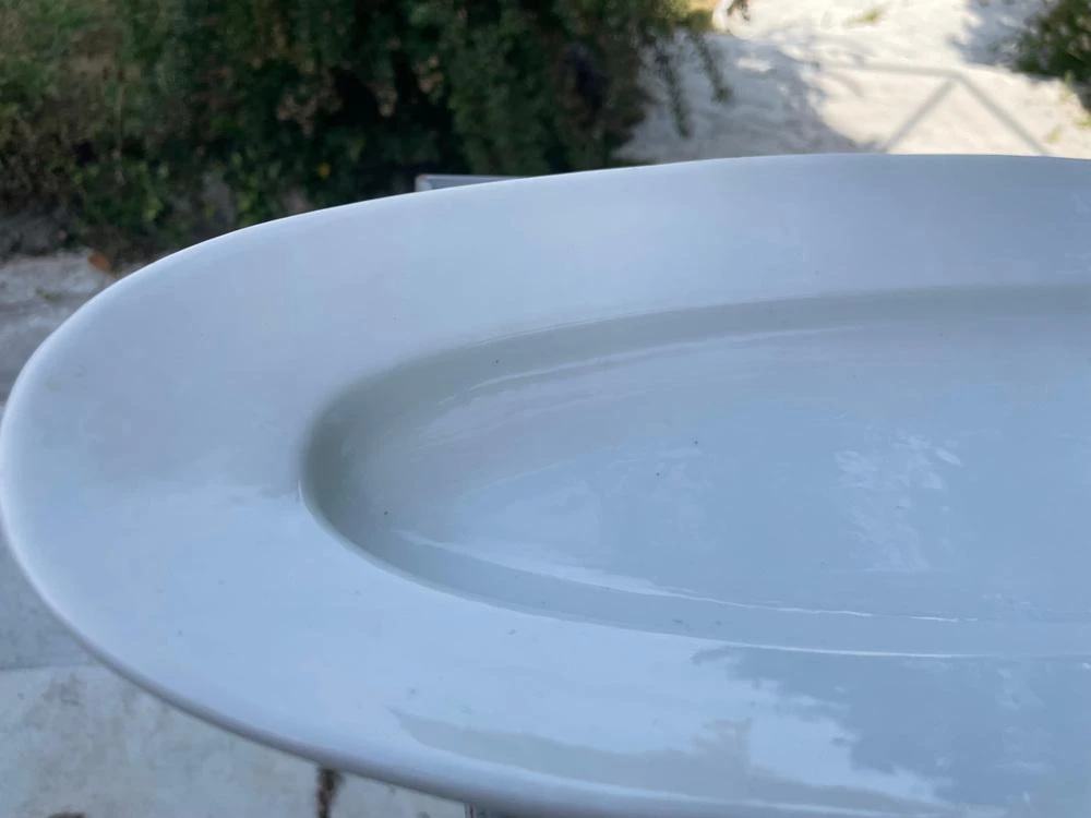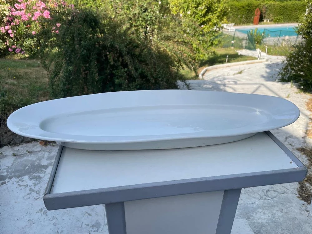 It is a white porcelain dish dating from the beginning of the 20th century. It was made in France, and is signed below. It is a dish which is of very good quality, and which is very heavy. It is suitable for serving fish because its shape has a good depth and a large width. So it is possible to put a big fish in it.