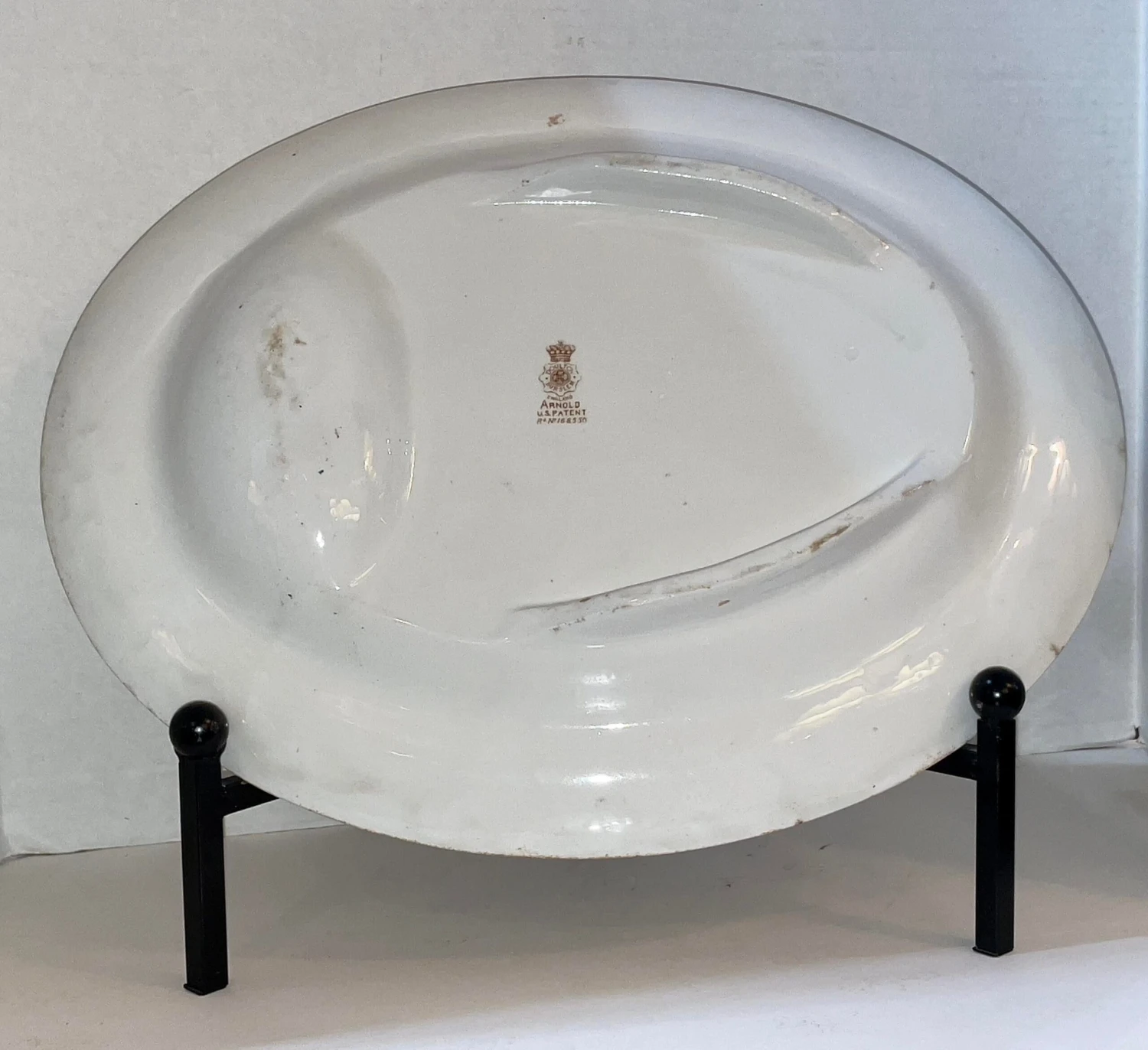 Some minor wear from utensils. The backside and edge of the platter has browning where there were blemishes in the glaze. No Chips or cracks. Stand not included.