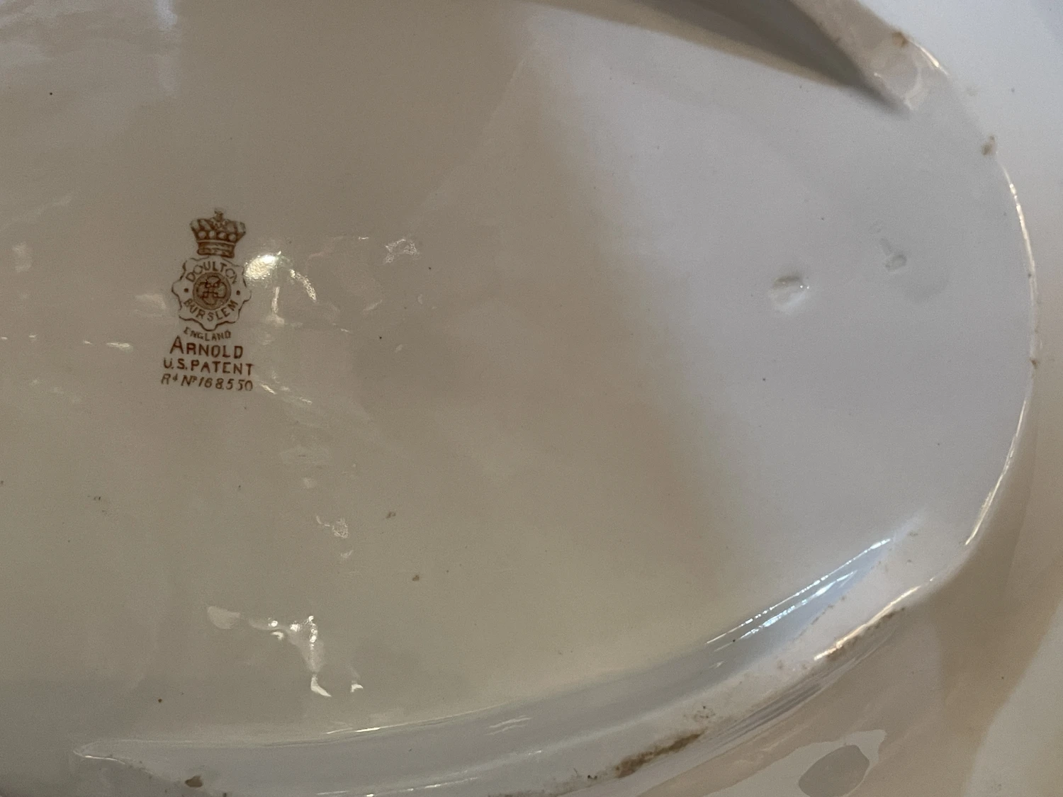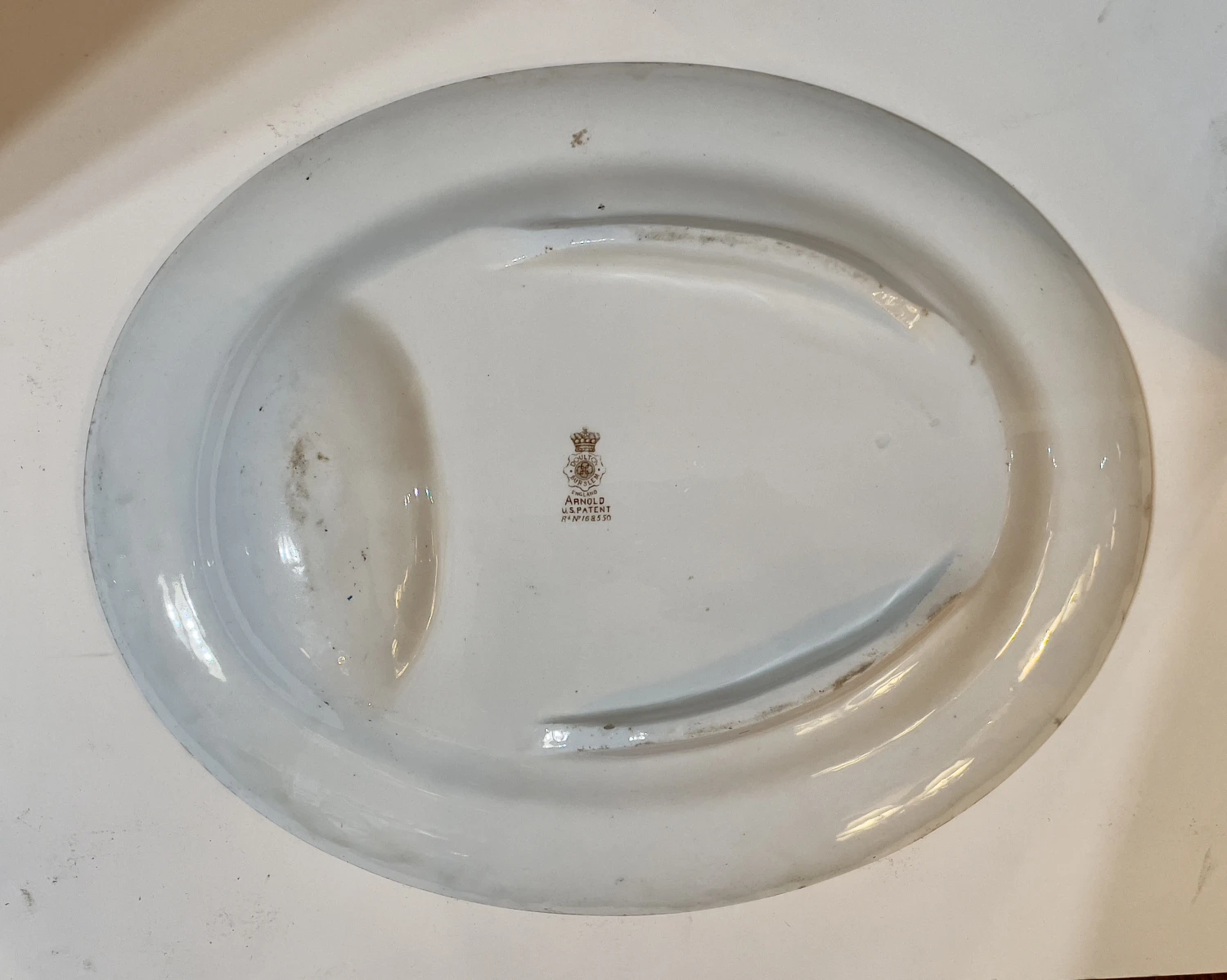 Some minor wear from utensils. The backside and edge of the platter has browning where there were blemishes in the …
