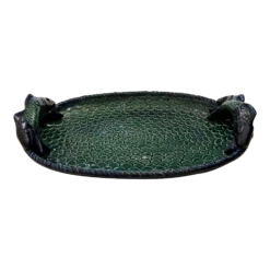 Verdigris and ink blue glazed ceramic serving platter with “scales” across platter and fish serving as handles.