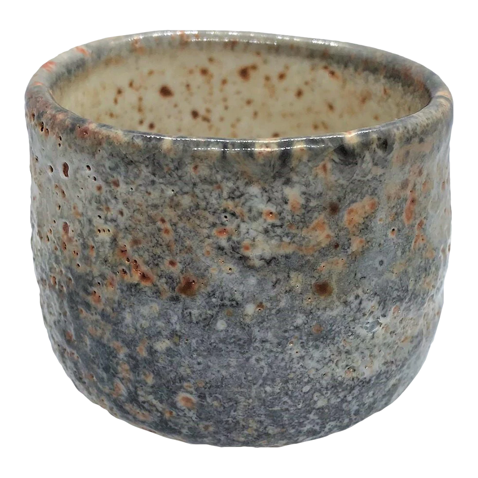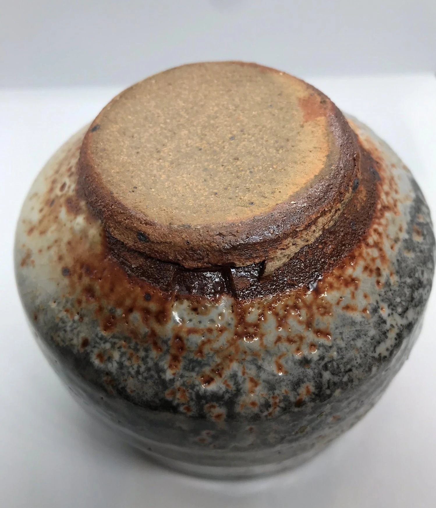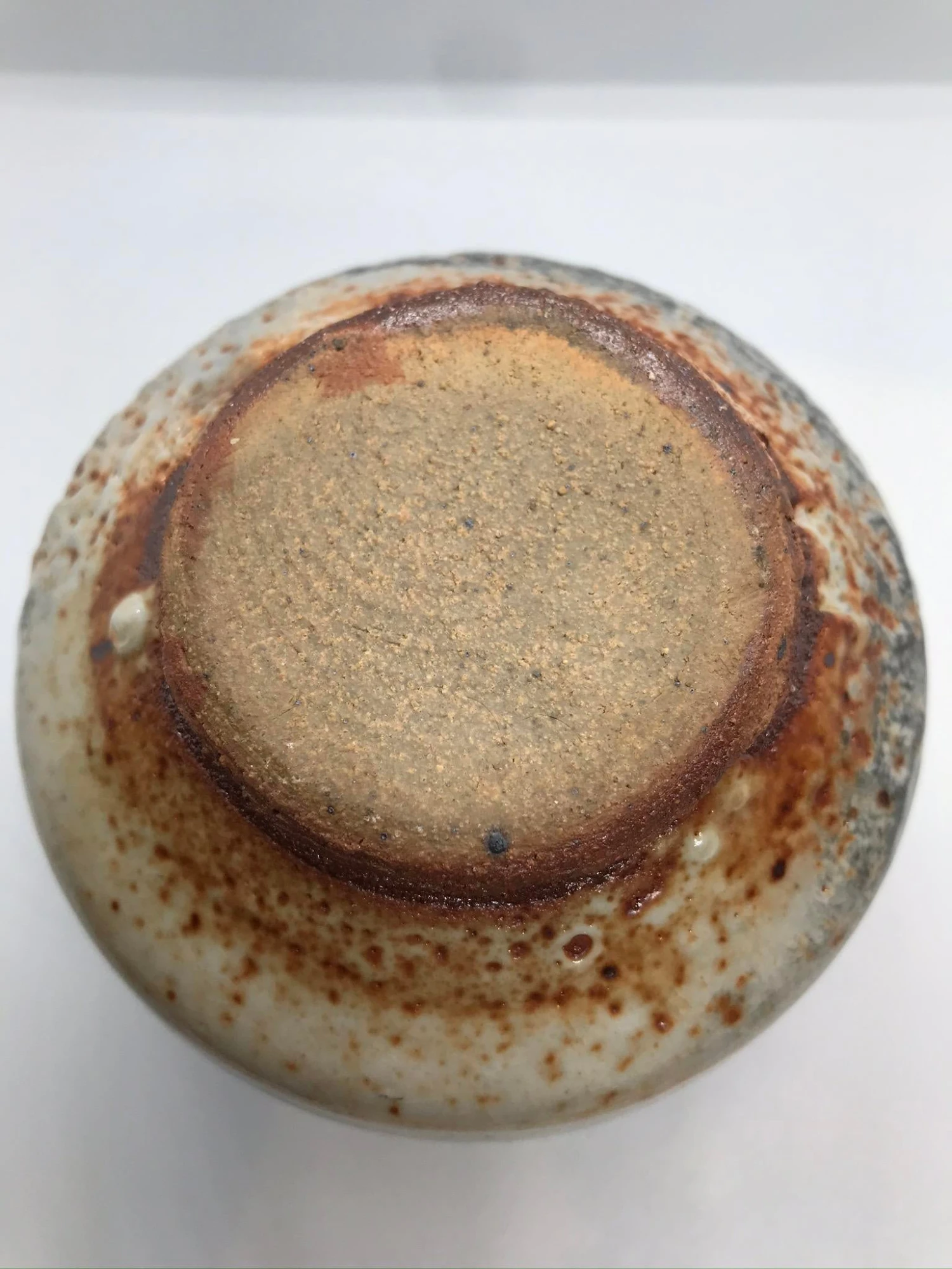 As the most admired functional potter worldwide, Warren MacKenzie believed that his ceramic pieces should be used, and he made many tea bowls, Japanese style Yunomi tea bowls. This tea bowl has an interesting mottled glaze. I believe Professor MacKenzie experimented with his glazes. First he applied a coat of Shino glaze, then a coat of beige/tan (sometimes called oatmeal glaze) over the rust color of the Shino. In the firing process, the rust orange glaze came through in speckles of brown and rust all over the bowl. As usual the foot is underglaze. His mark is stamped at the base above the circular foot ring.