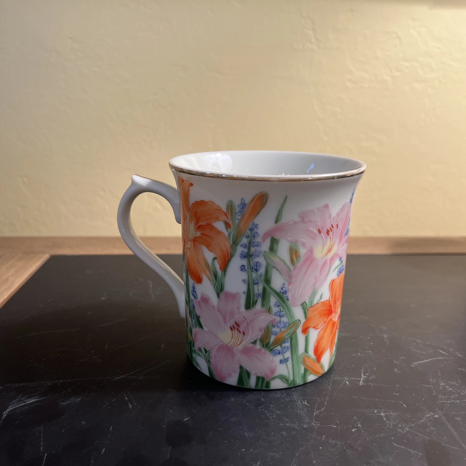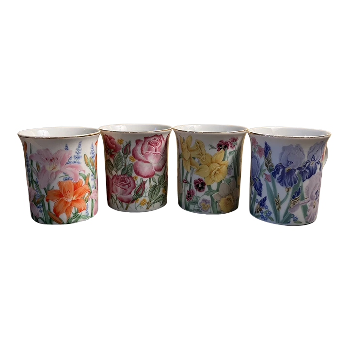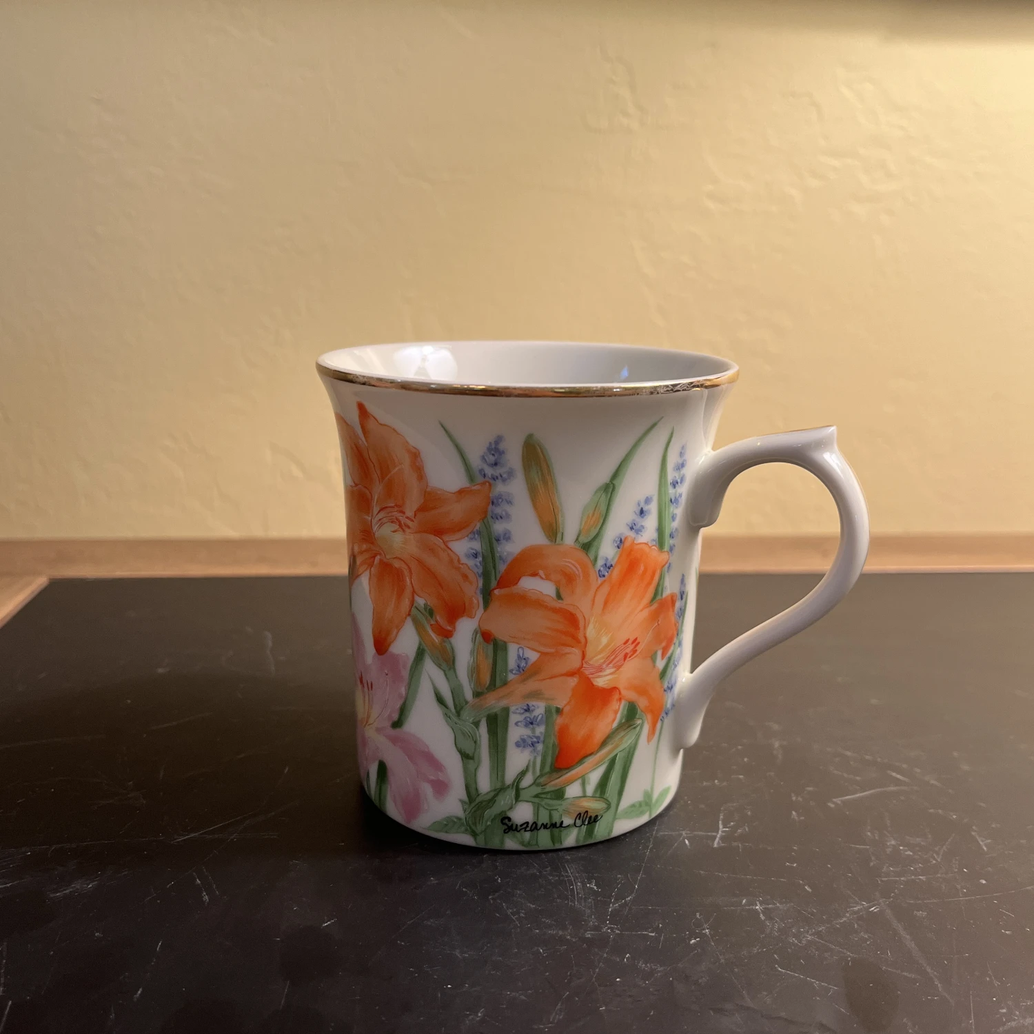 Lenox bone china mugs “The Flower Blossom Mug Collection” by Susanne Clee. Includes the four mugs “Daffodil”, “Day Lily”, “Iris”, and “Rose”. Each mug has a height of 3.625” and a width of 4.5”. Used, but in very good condition.